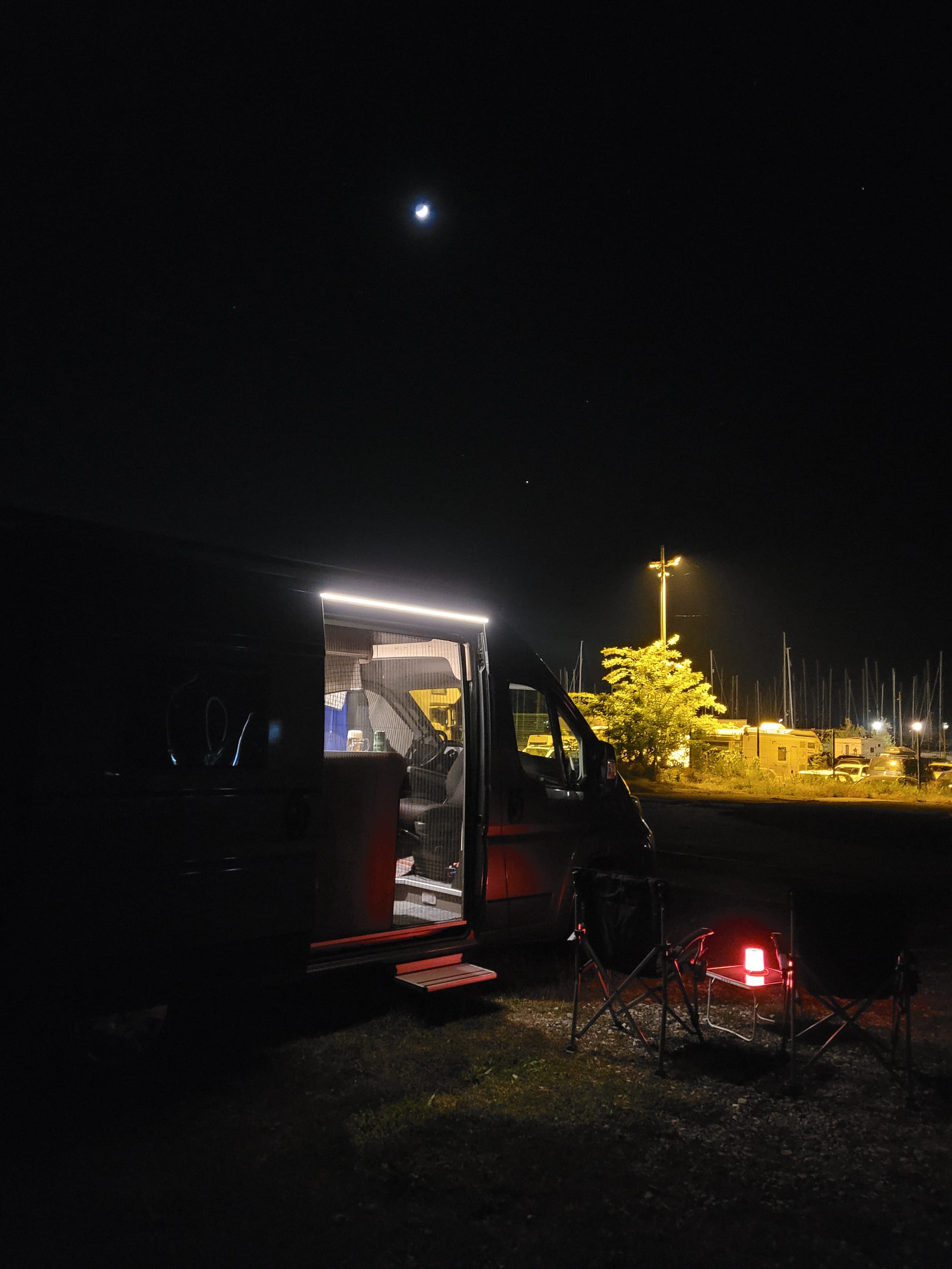 Um 22:00 kommen wir in Izola an. Der Stellplatz hinter der Marina ist ganz schön voll. Viele Camper sitzen neben ihren Fahrzeugen und genießen die laue Nacht.