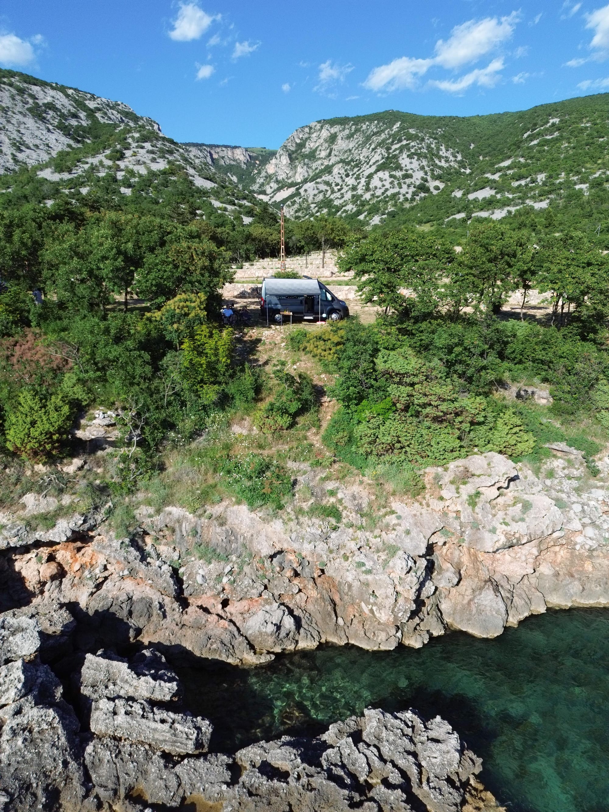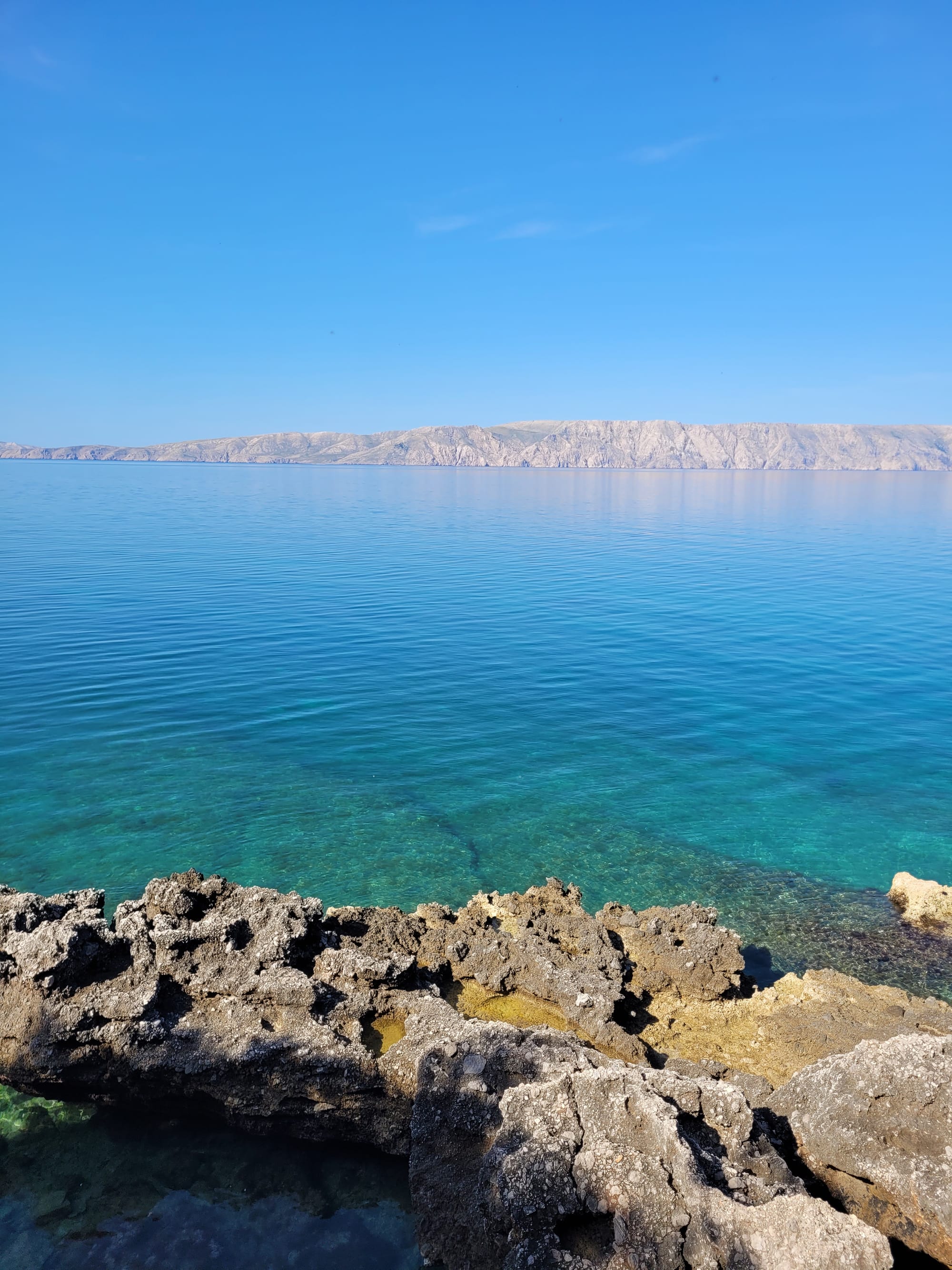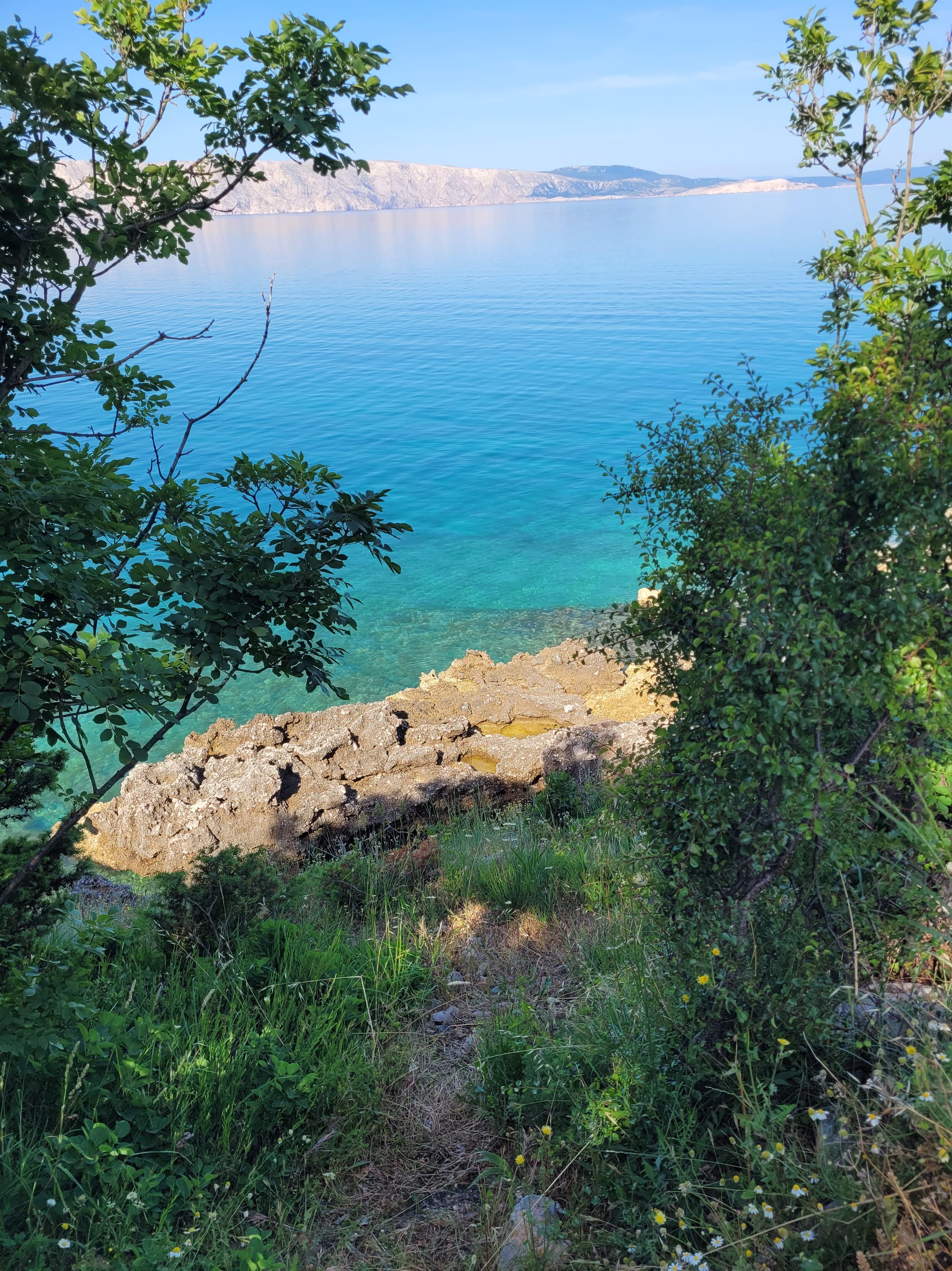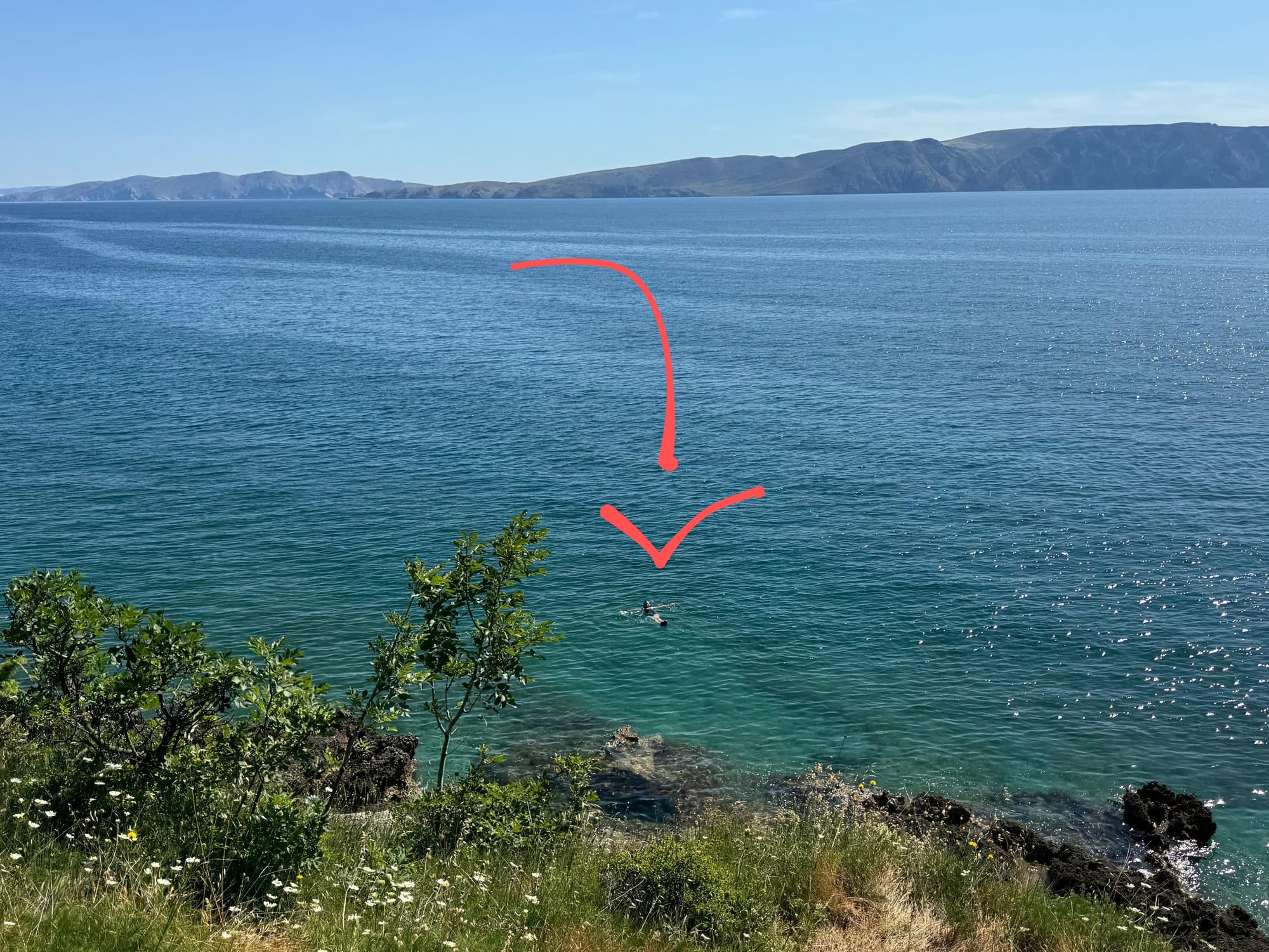 ...und schwimme eine Runde im eiskalten, klaren Wasser. Es ist eine wunderschöne Stimmung mit dem Blick nach Krk.