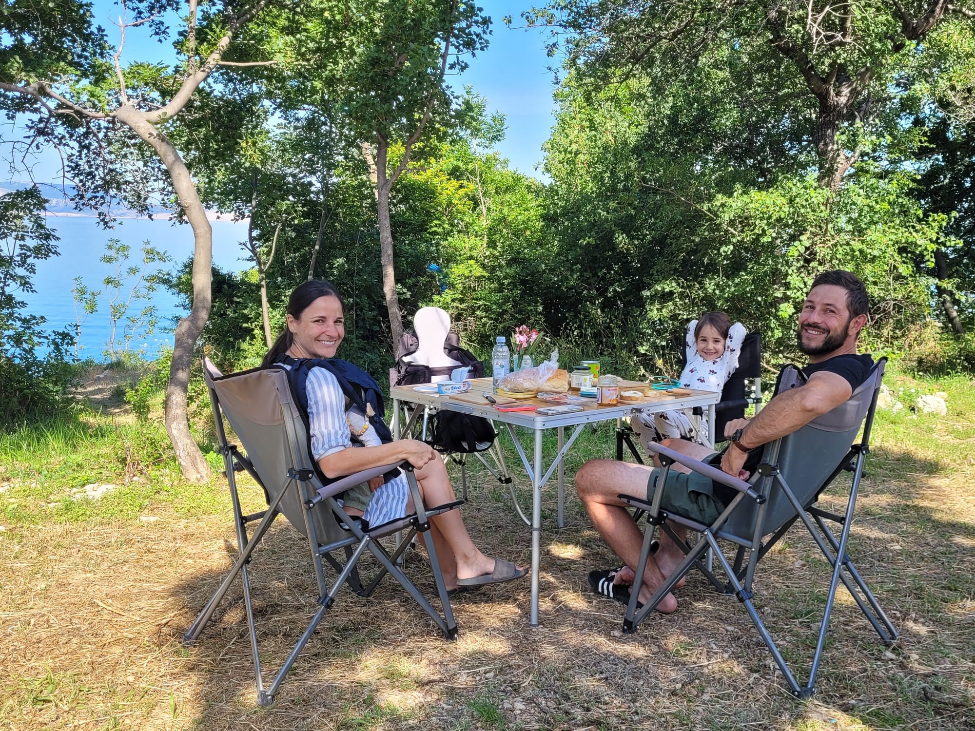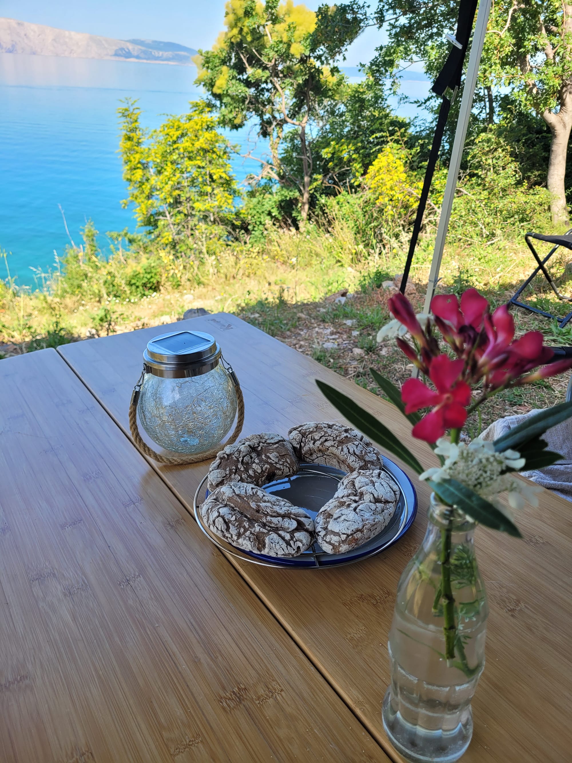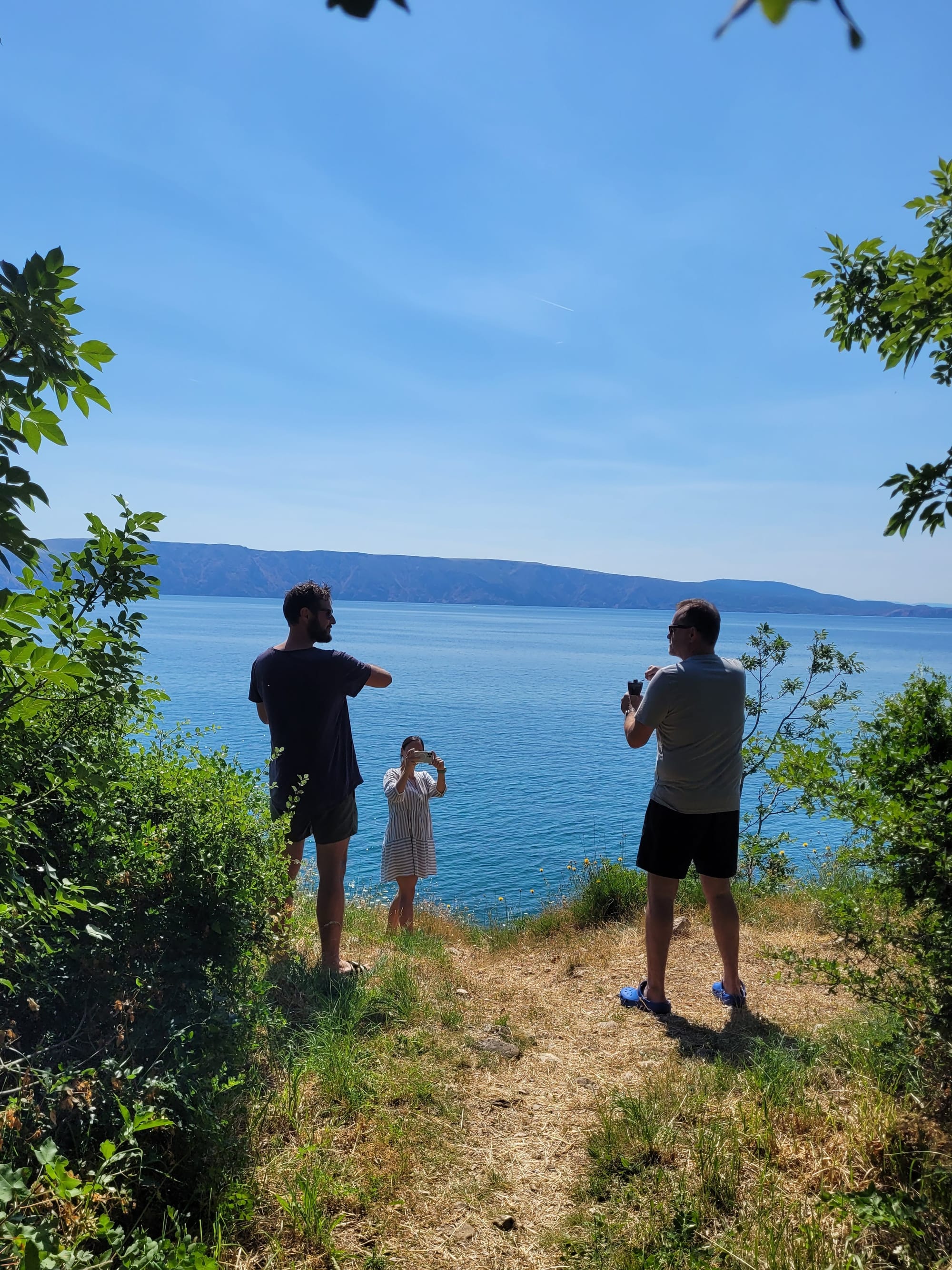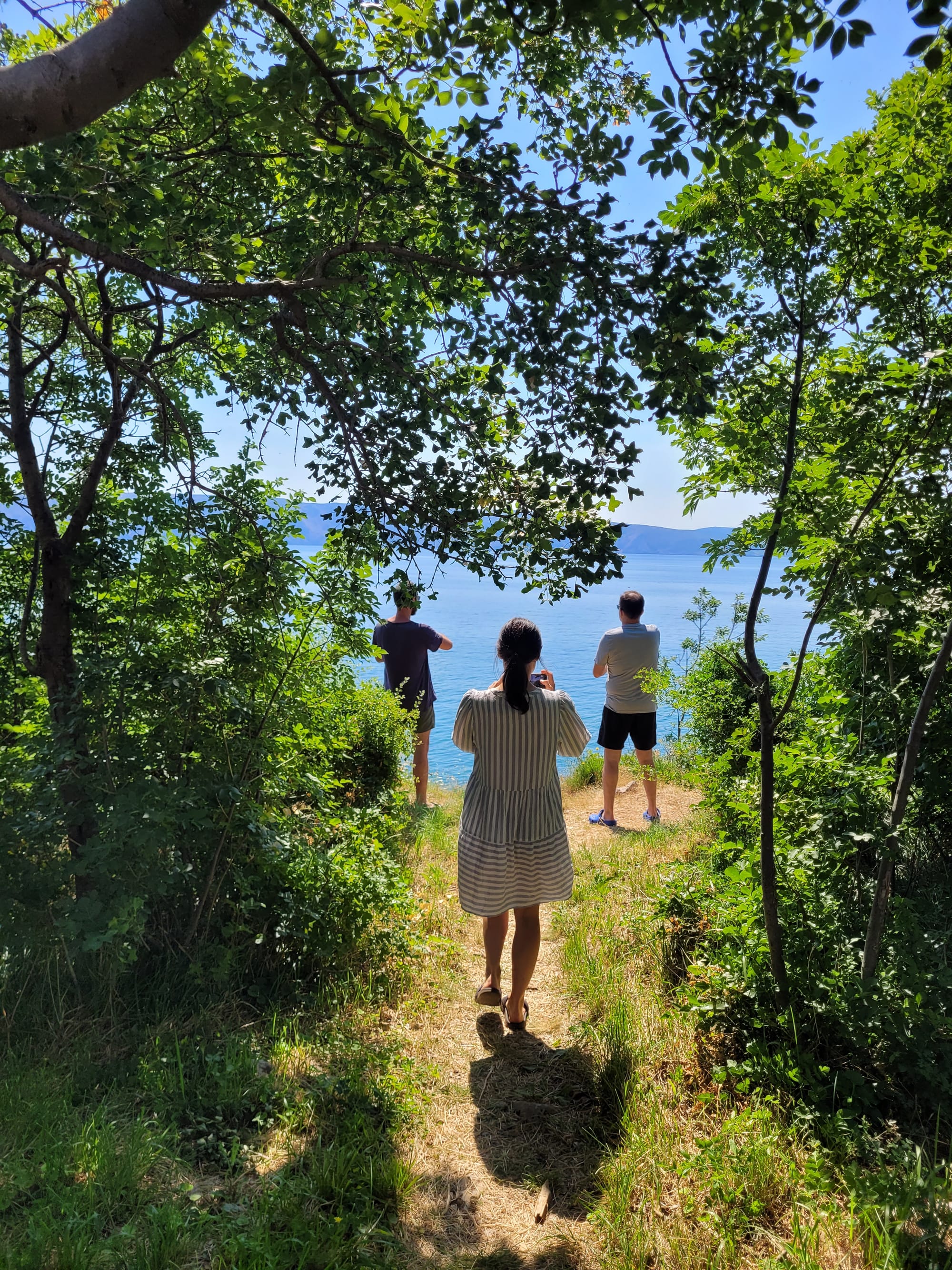 ...und schwimme eine Runde im eiskalten, klaren Wasser. Es ist eine wunderschöne Stimmung mit dem Blick nach Krk.