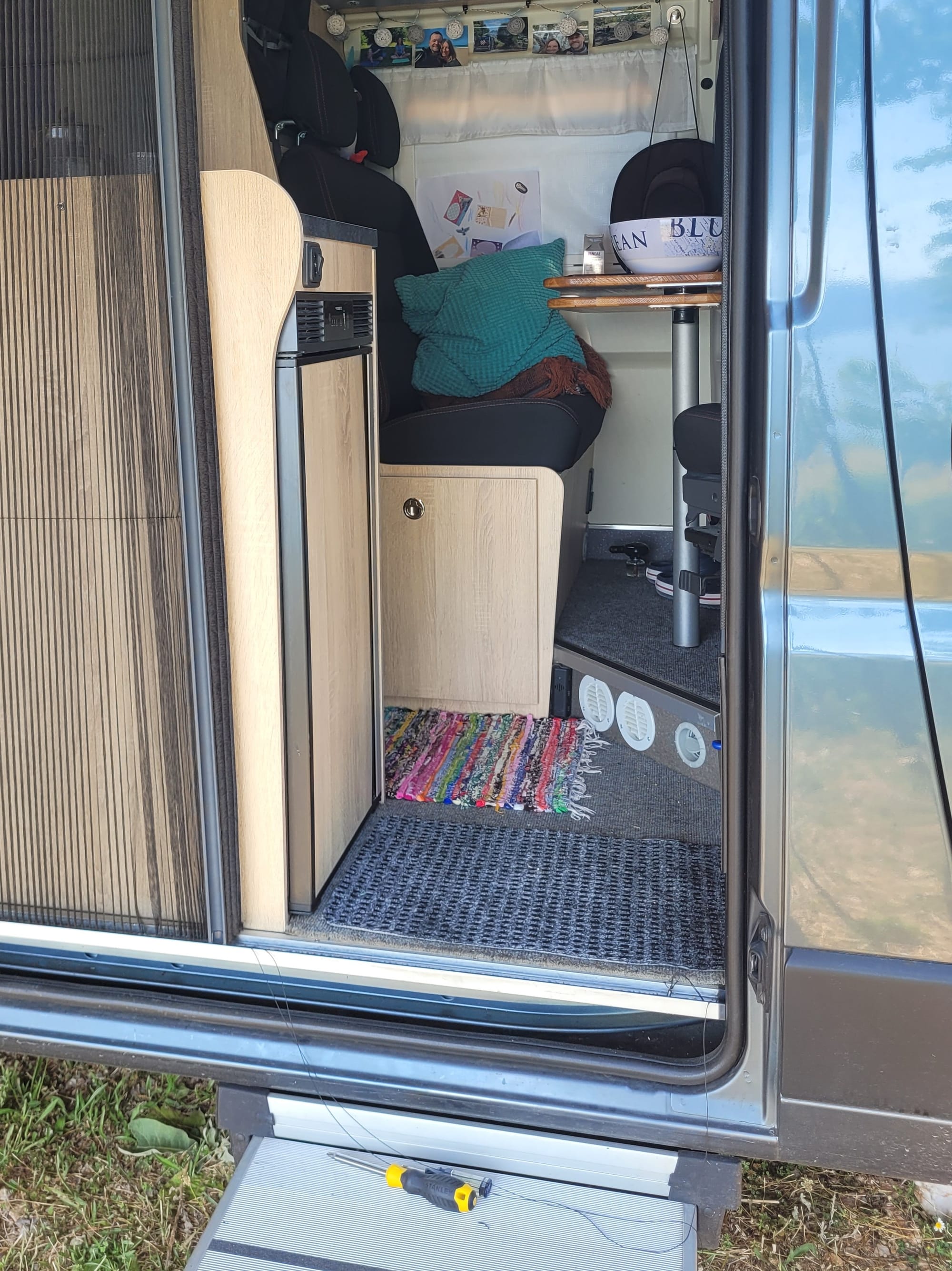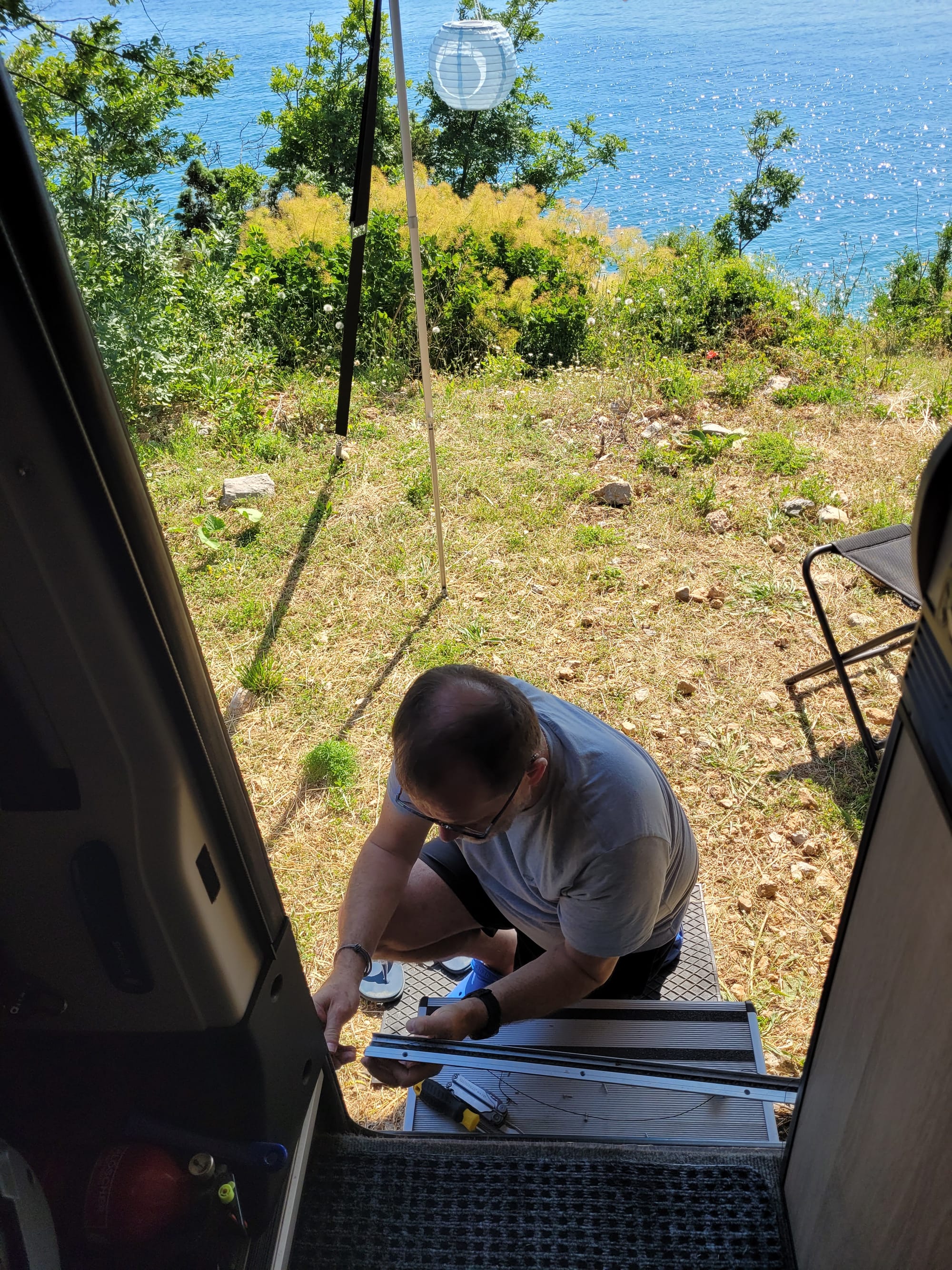 Zwischendurch muss auch ein bisschen gearbeitet werden. Unser Mückenplissee ist wieder gerissen. Wir machen eine Notreparatur und werden es zu Hause wohl komplett neu bespannen müssen.