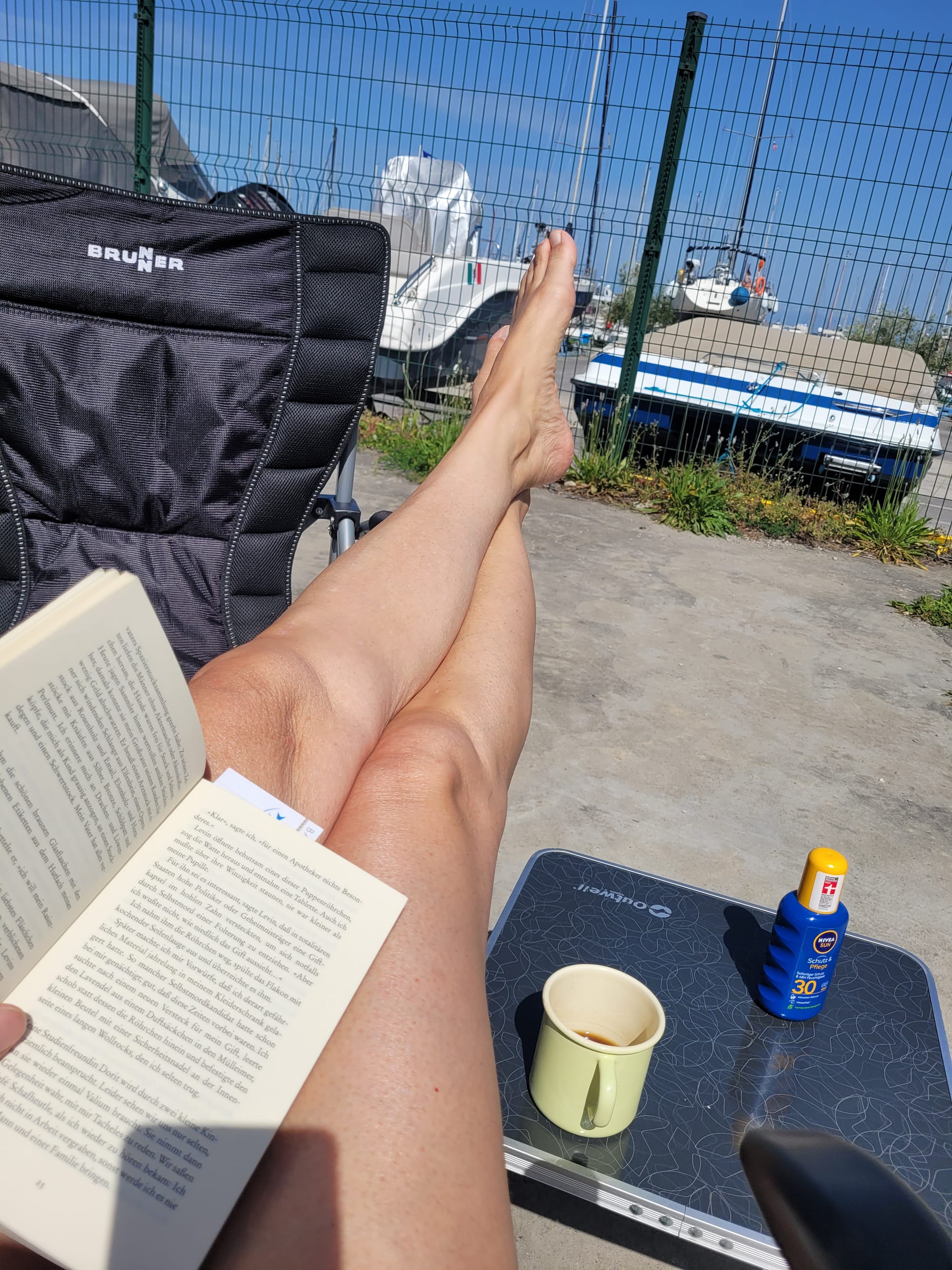 Wir nutzen die Ruhe hier und die Marina Stimmung um unsere Gedanken zu ordnen.