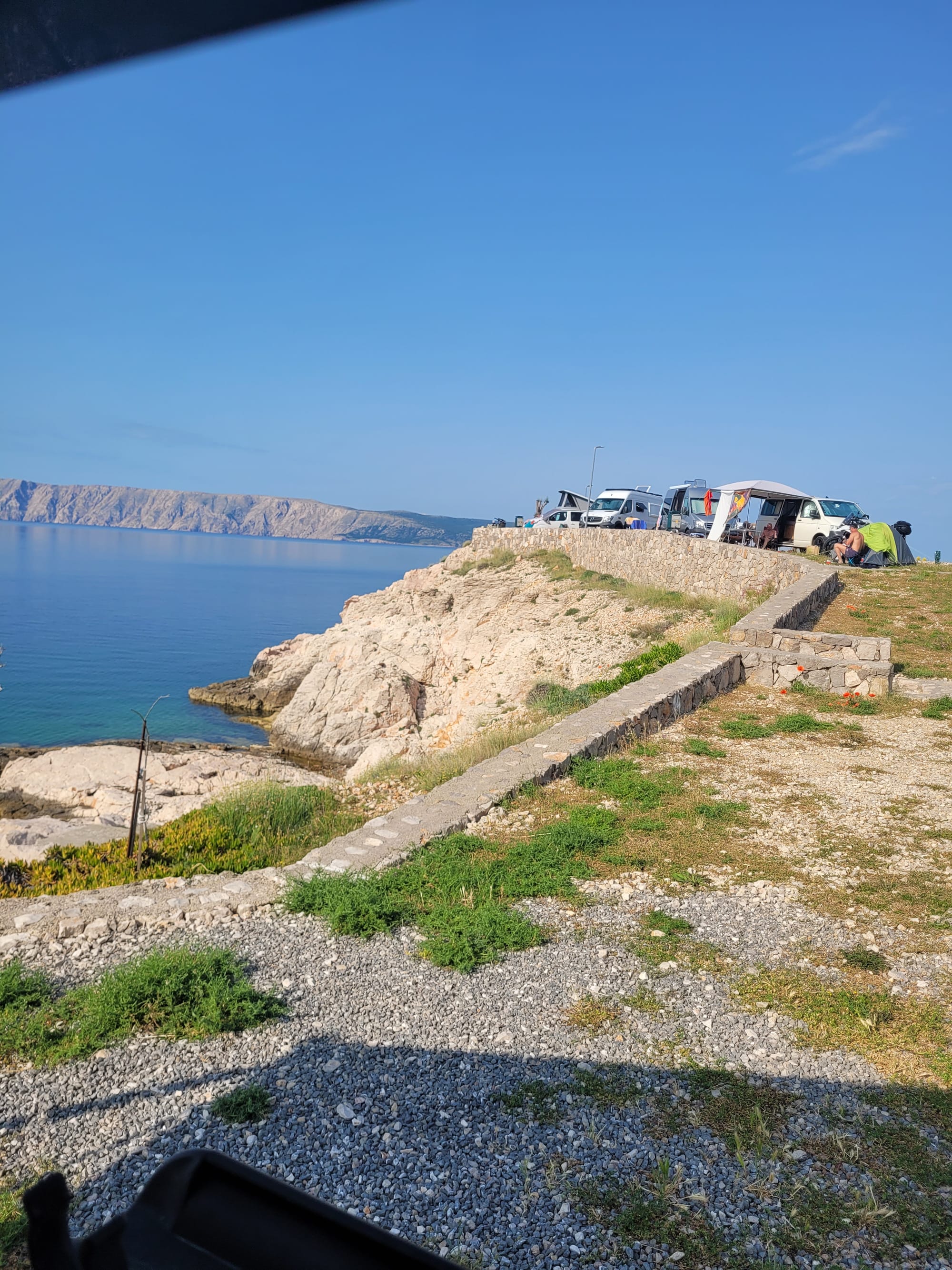 Beim Blick vom Bett aus dem Rückfenster in der Früh kommt langsam ein Verdacht auf, warum dieser Platz vielleicht doch nicht so ideal ist: wir schauen nach SO und da hilft auch keine Markise - der Schatten ist hinter den Autos.