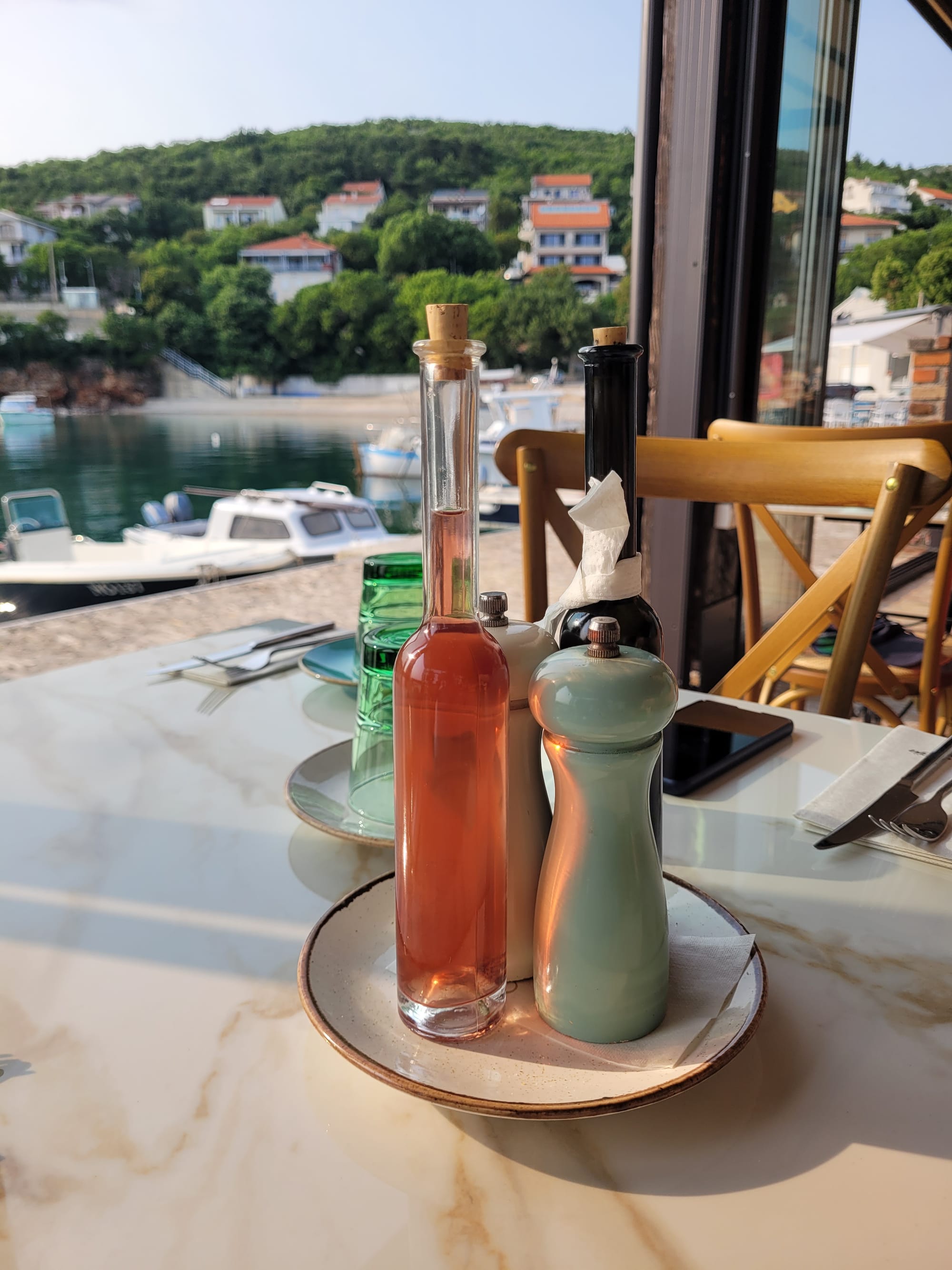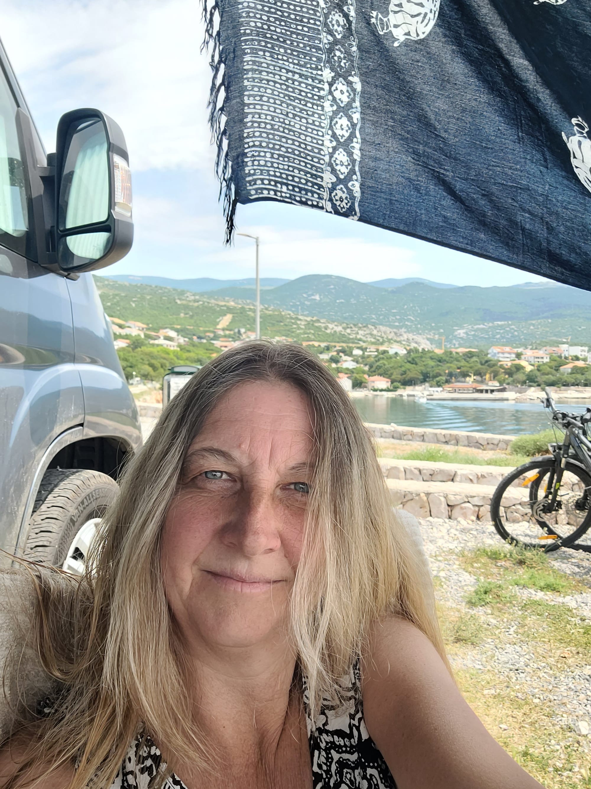 Als wir uns zum Morgenkaffee allerdings hinaus setzen ist es gar nicht so heiß. Es weht ein feines Lüfterl und es ist wirklich angenehm. Außerdem haben wir mit meinem Strandtuch einen zusätzlichen Sonnenschutz.