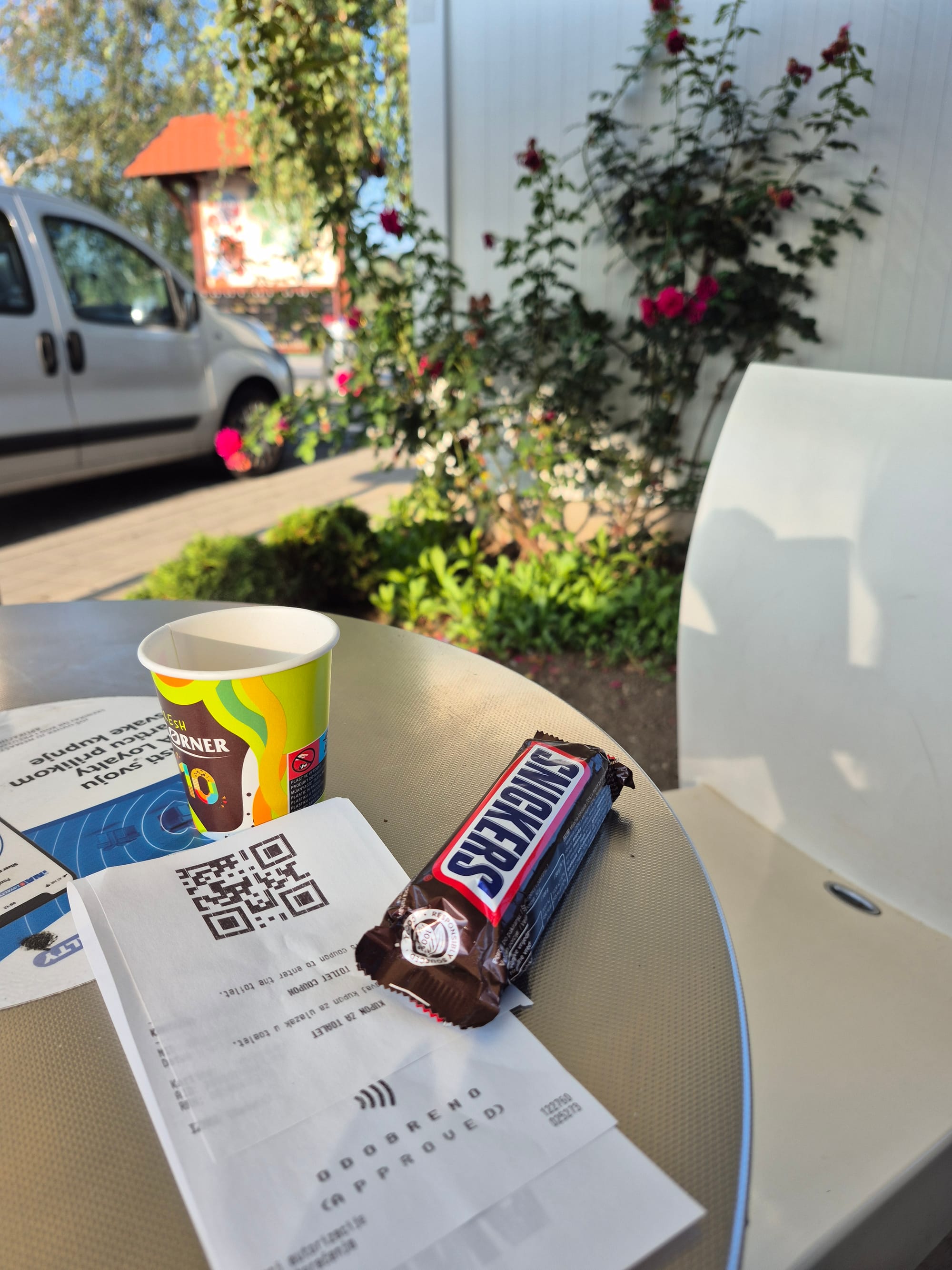 Zu den Toiletten komme ich nur gegen Bezahlung oder Konsumation, also gönne ich mir ein kleines Frühstück.