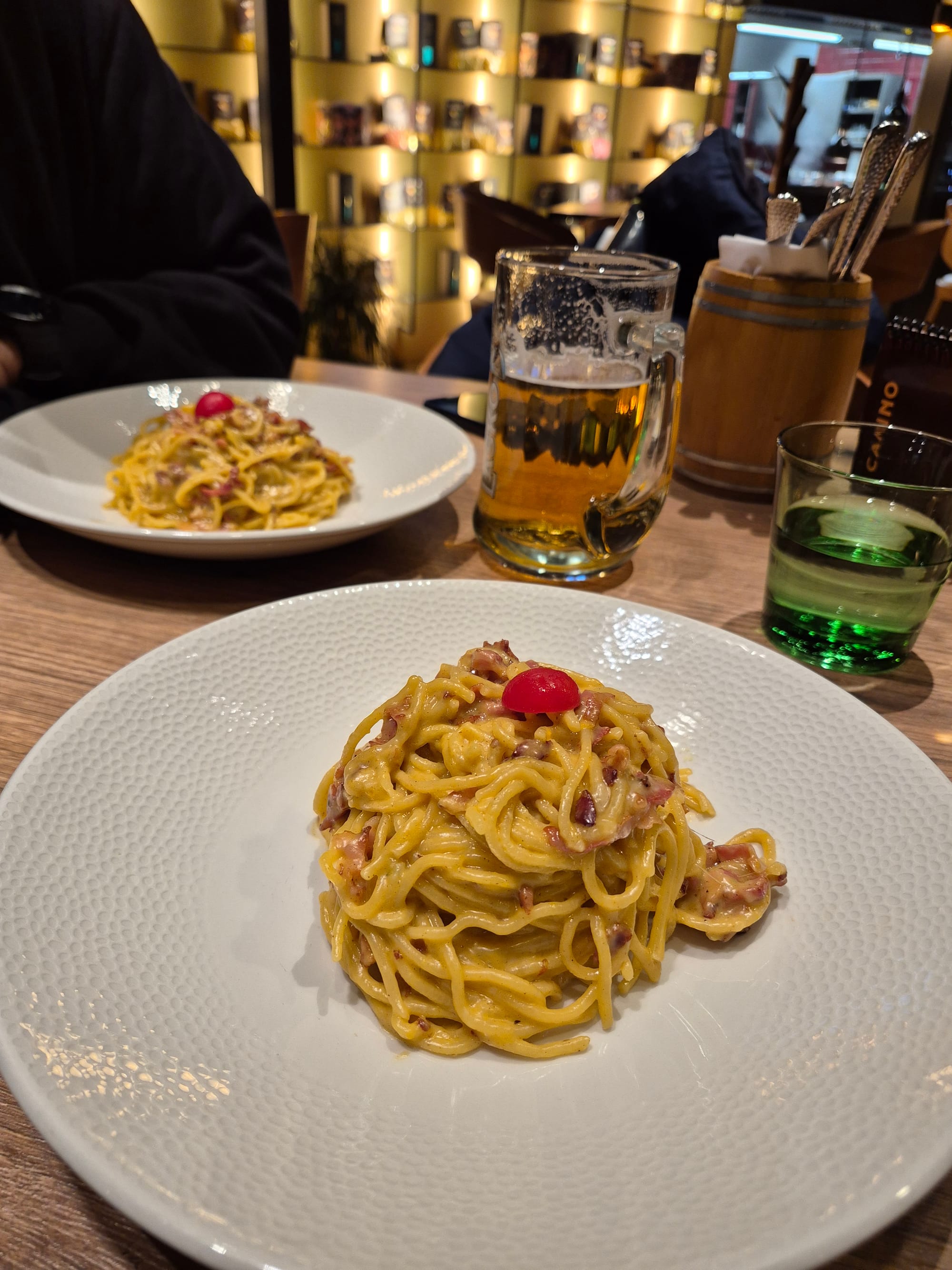 Wir entscheiden uns für Spaghetti Carbonara, eine klare Tauber-Empfehlung:
