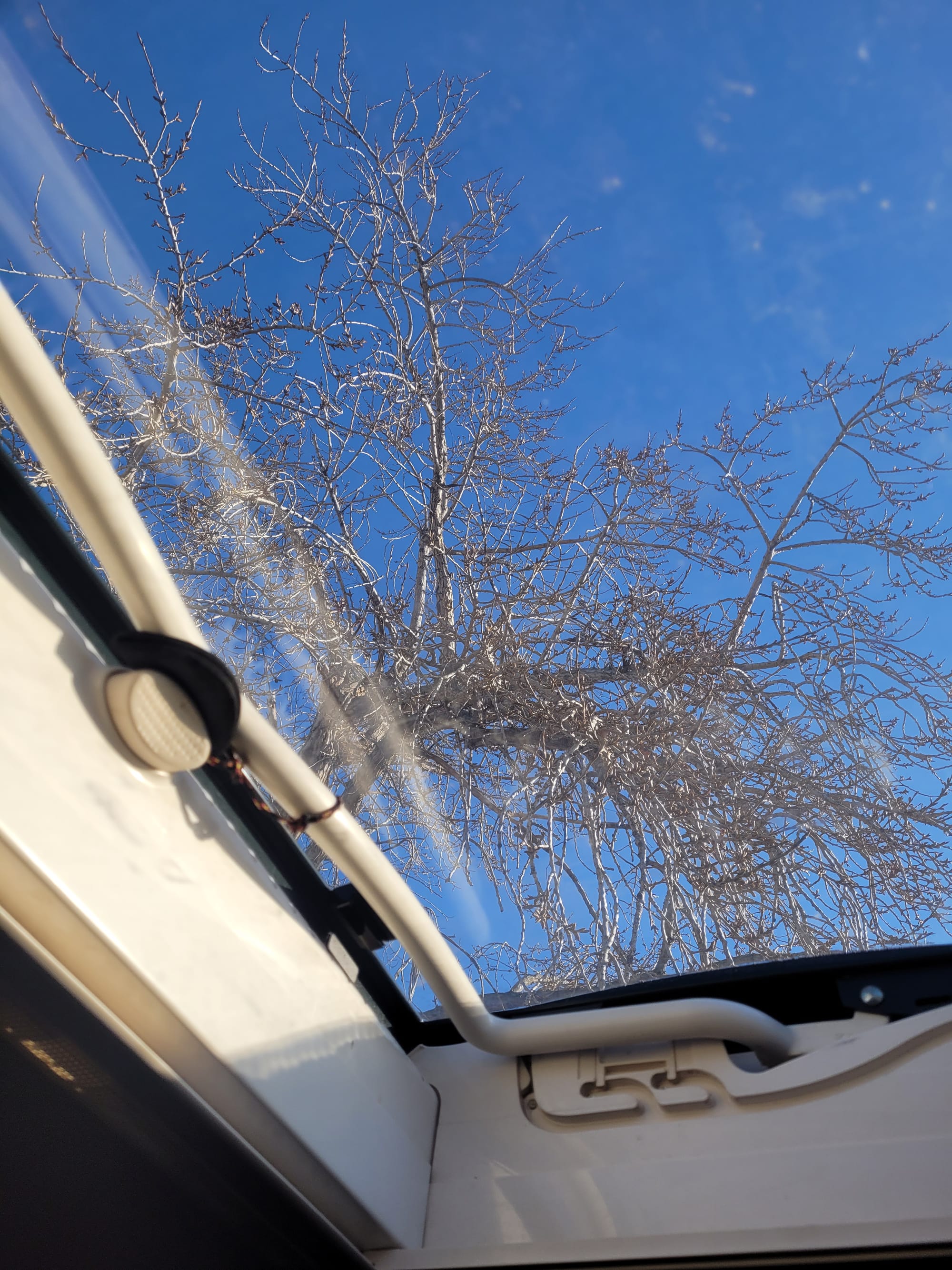 In der Früh haben wir einen wunderschönen Blick durch unser Dachfenster auf einen blauen Himmel....