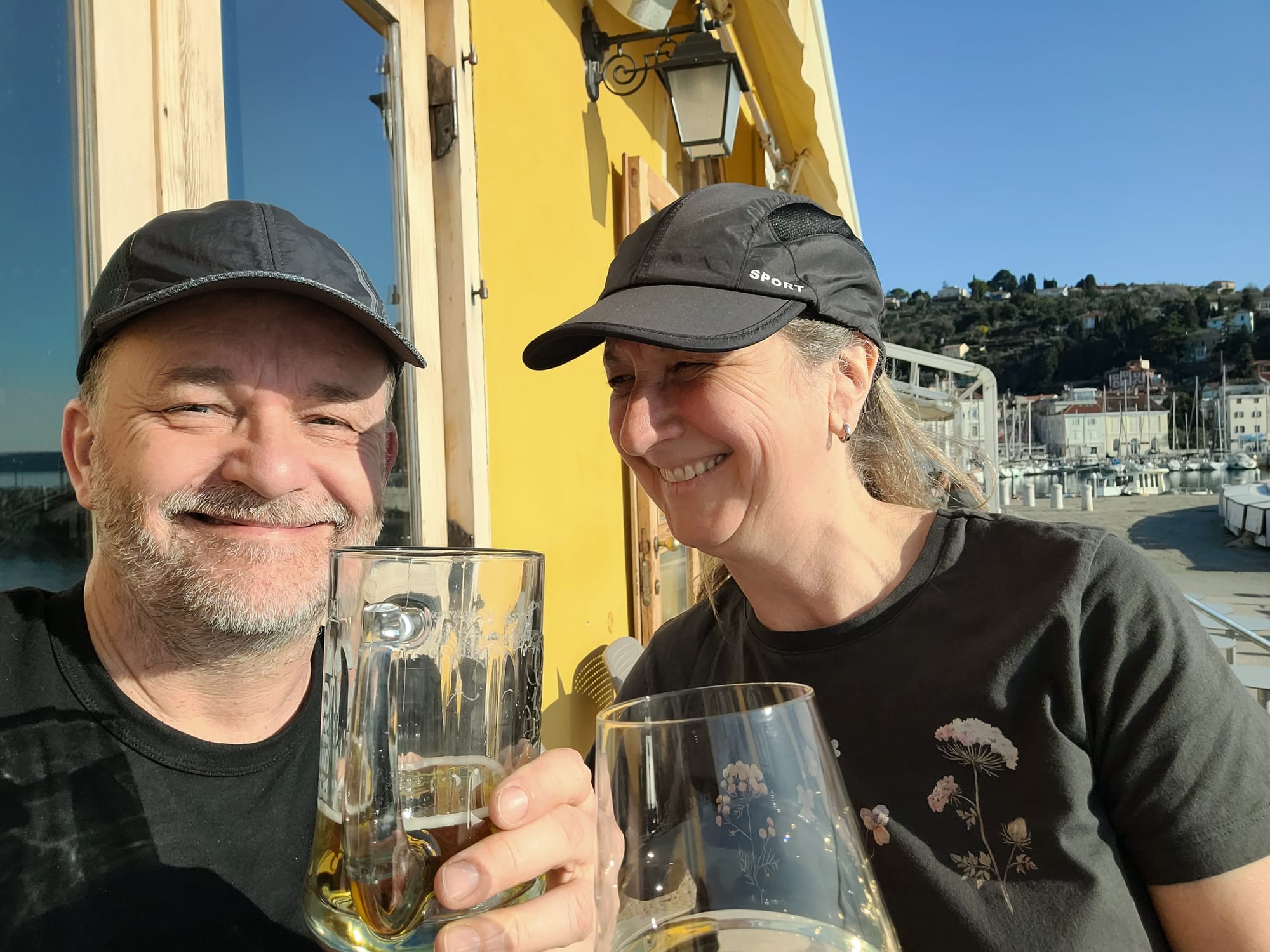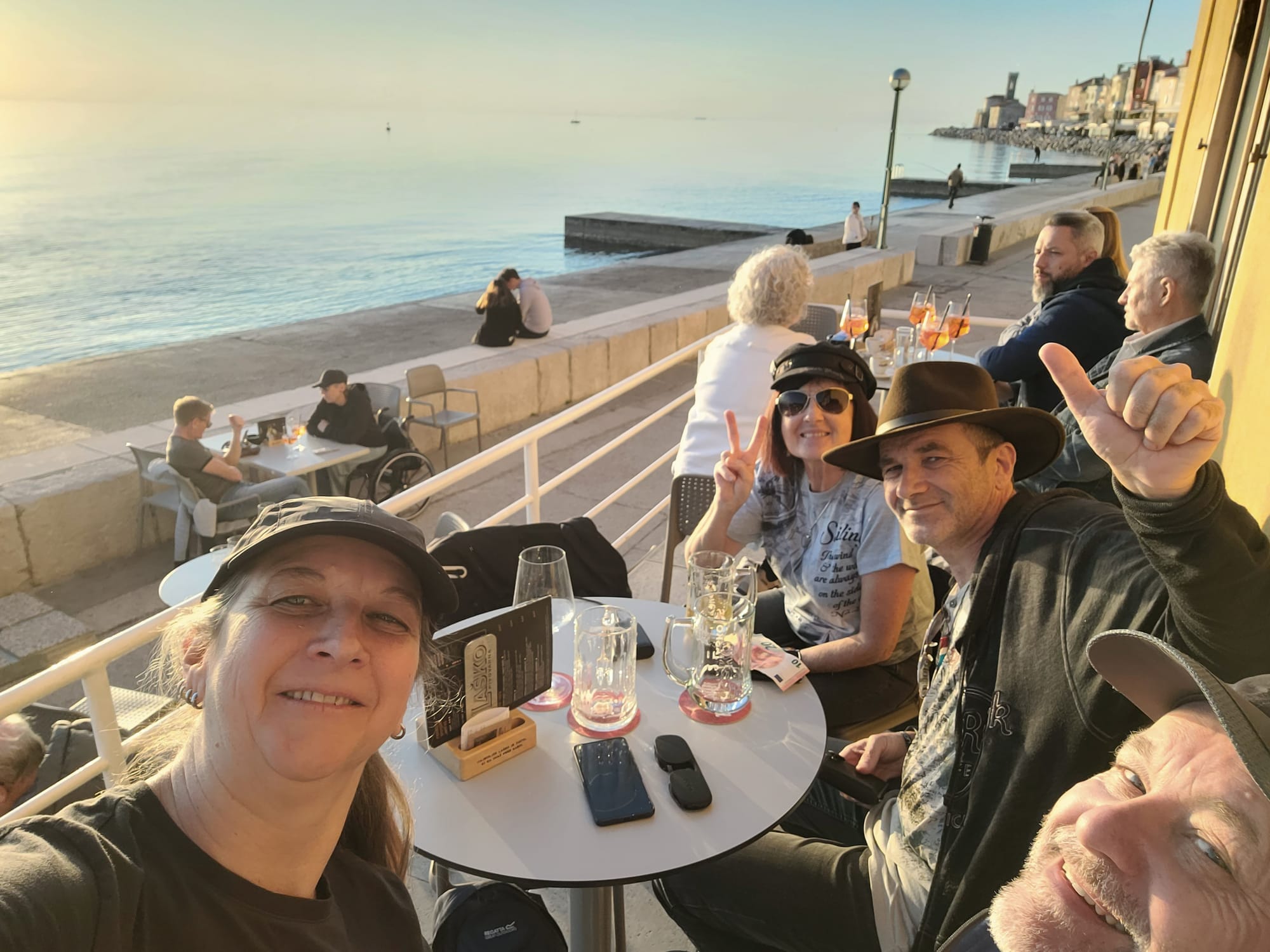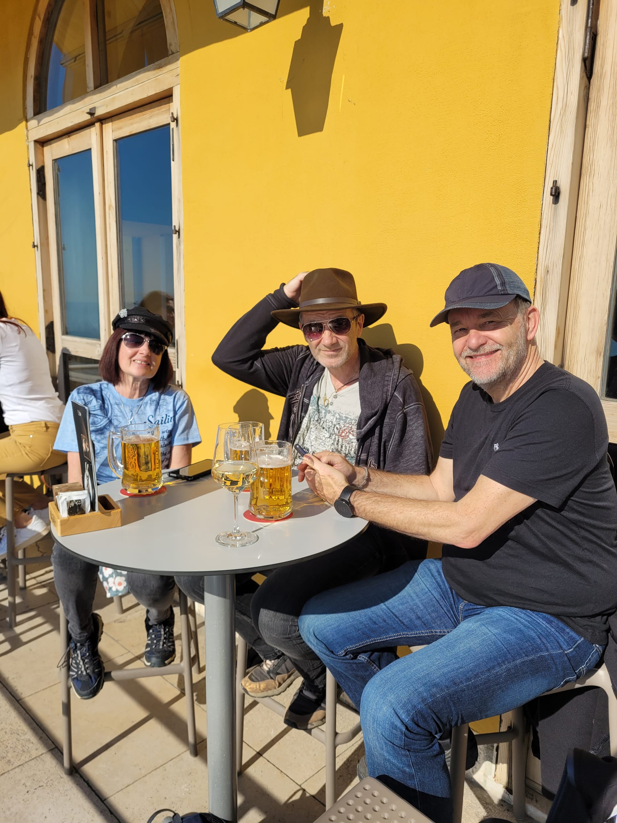 Am Stellplatz hat zwar die Sonne gescheint aber es ging ein bisschen der Wind, deshalb sind wir mit Jacke und Haube vor dem Camper gesessen. Hier an der Wand des Cafés ist es allerdings so heiß, dass wir kurzärmlig sitzen und die Hauben sind uns sowieso zu heiß 🔥. Leider haben wir nicht daran gedacht unsere Kapperln vom Camper mitzunehmen, deshalb laufe ich schnell ins nächste Geschäft mit Strandartikeln und kaufe 2 Notkapperln für Andreas und mich. Die Begeisterung hält sich allerdings in Grenzen bei Andreas 😄😄.