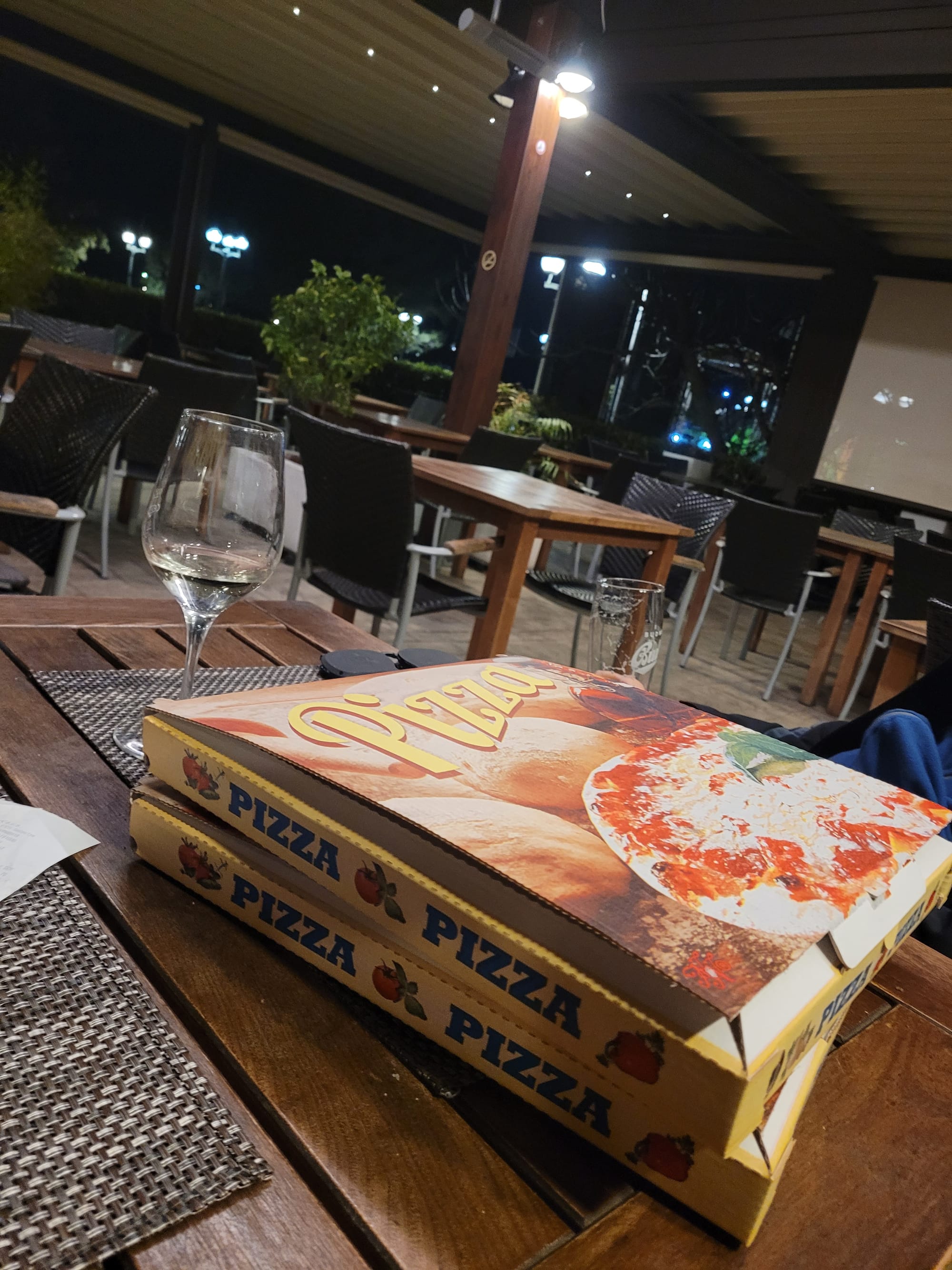 In Lucija kehren wir in dem kleinen Lokal an der Hauptstraße ein und bestellen uns 2 Takeaway Pizzen. Wir warten im Gastgarten und als sie uns gebracht wird essen wir sie gleich dort auf.