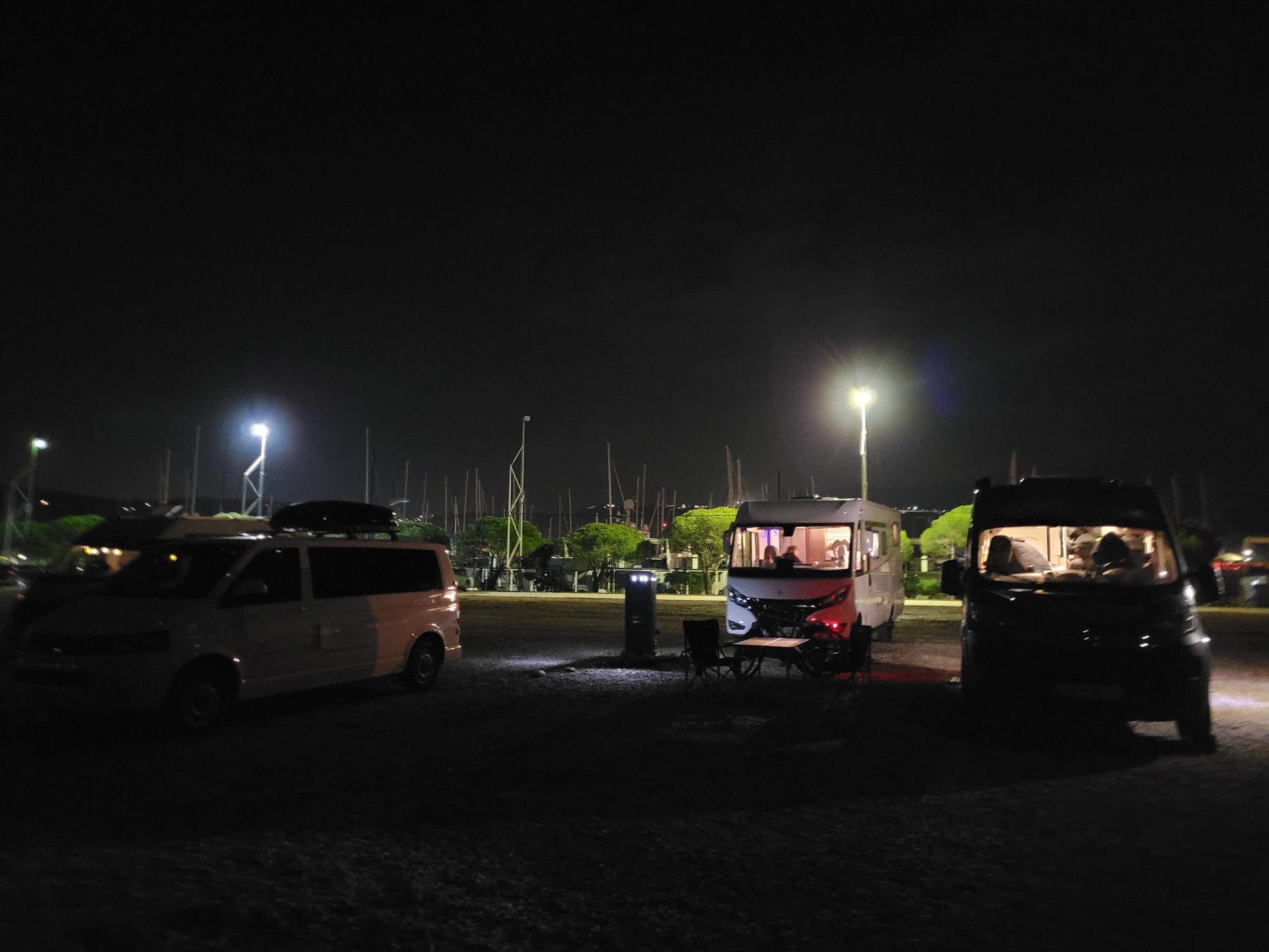 Der hat sich inzwischen gefüllt, jetzt stehen auch schon in der zweiten Reihe die Wohnmobile.