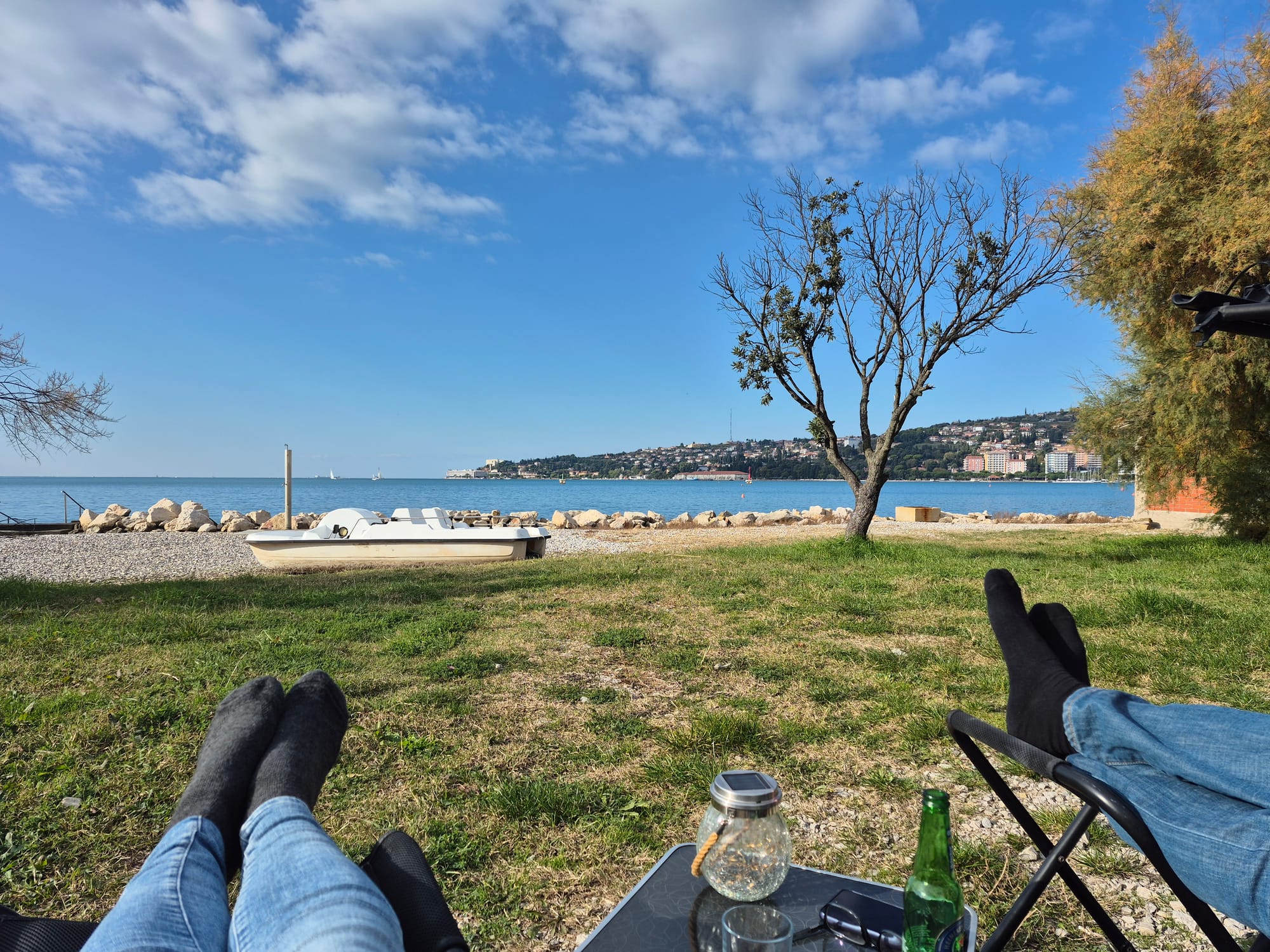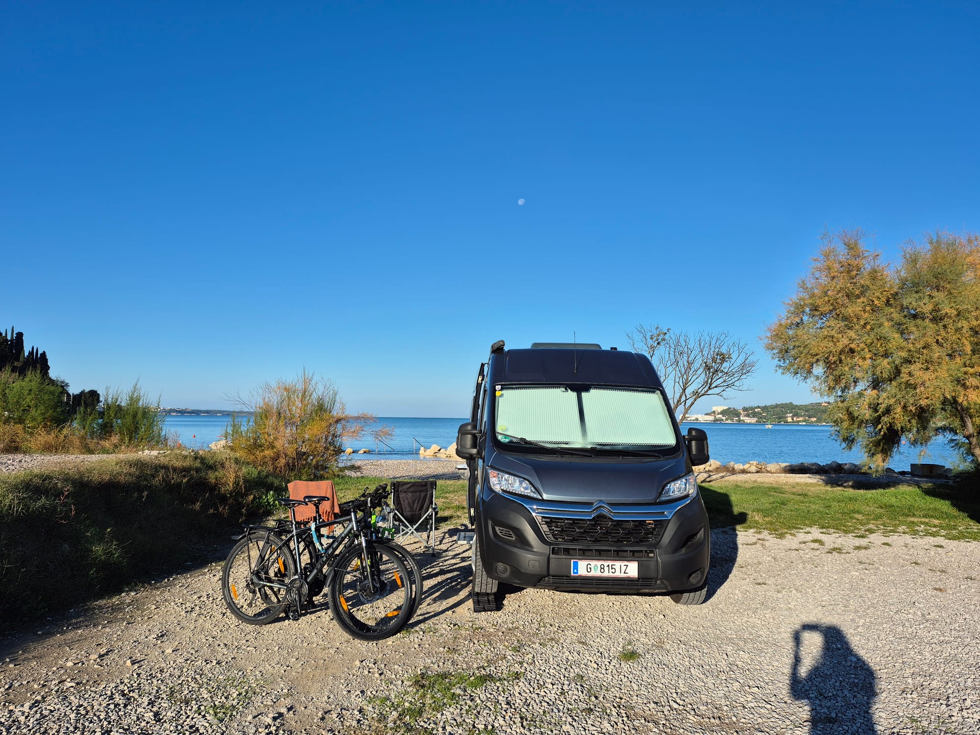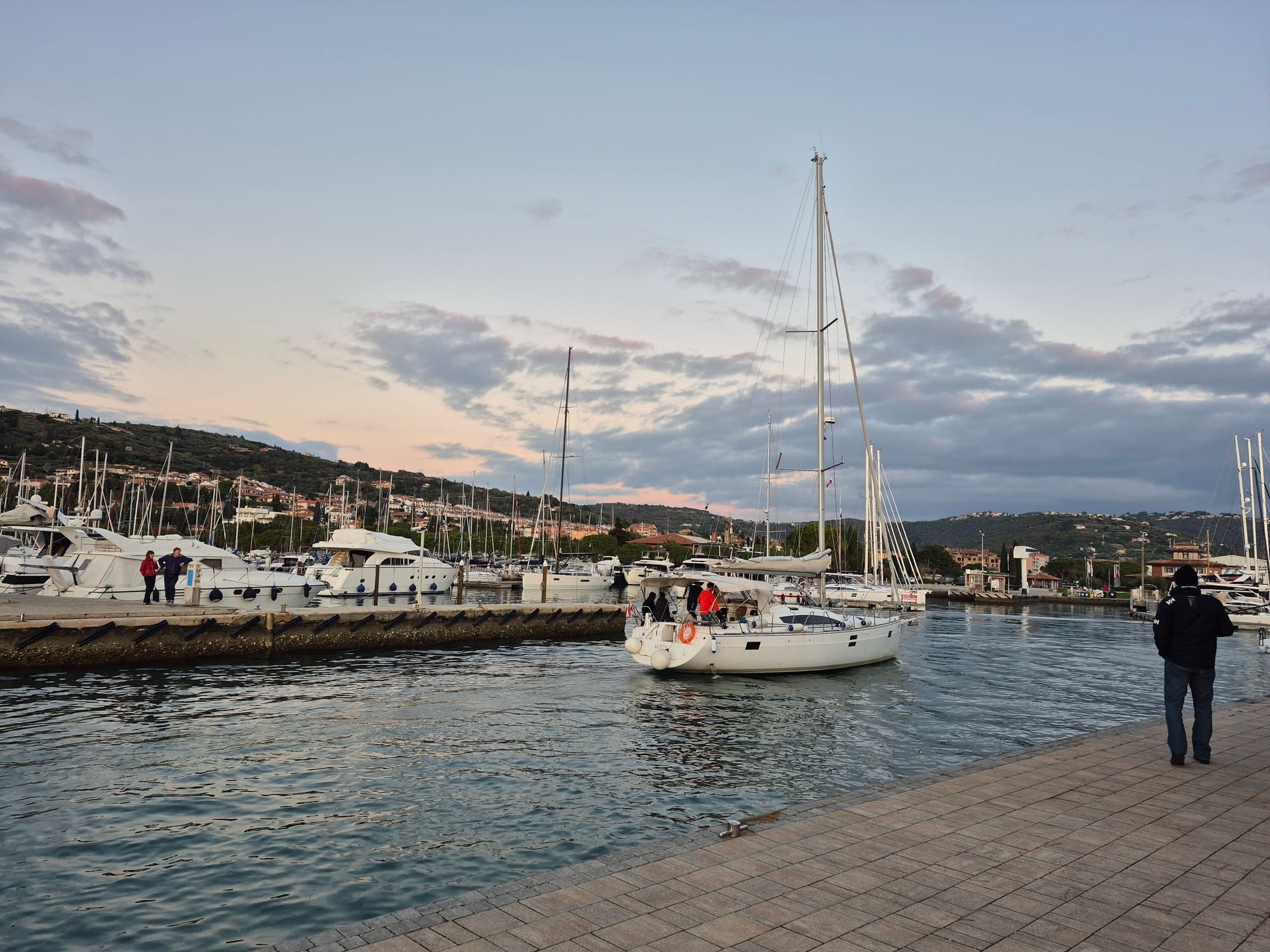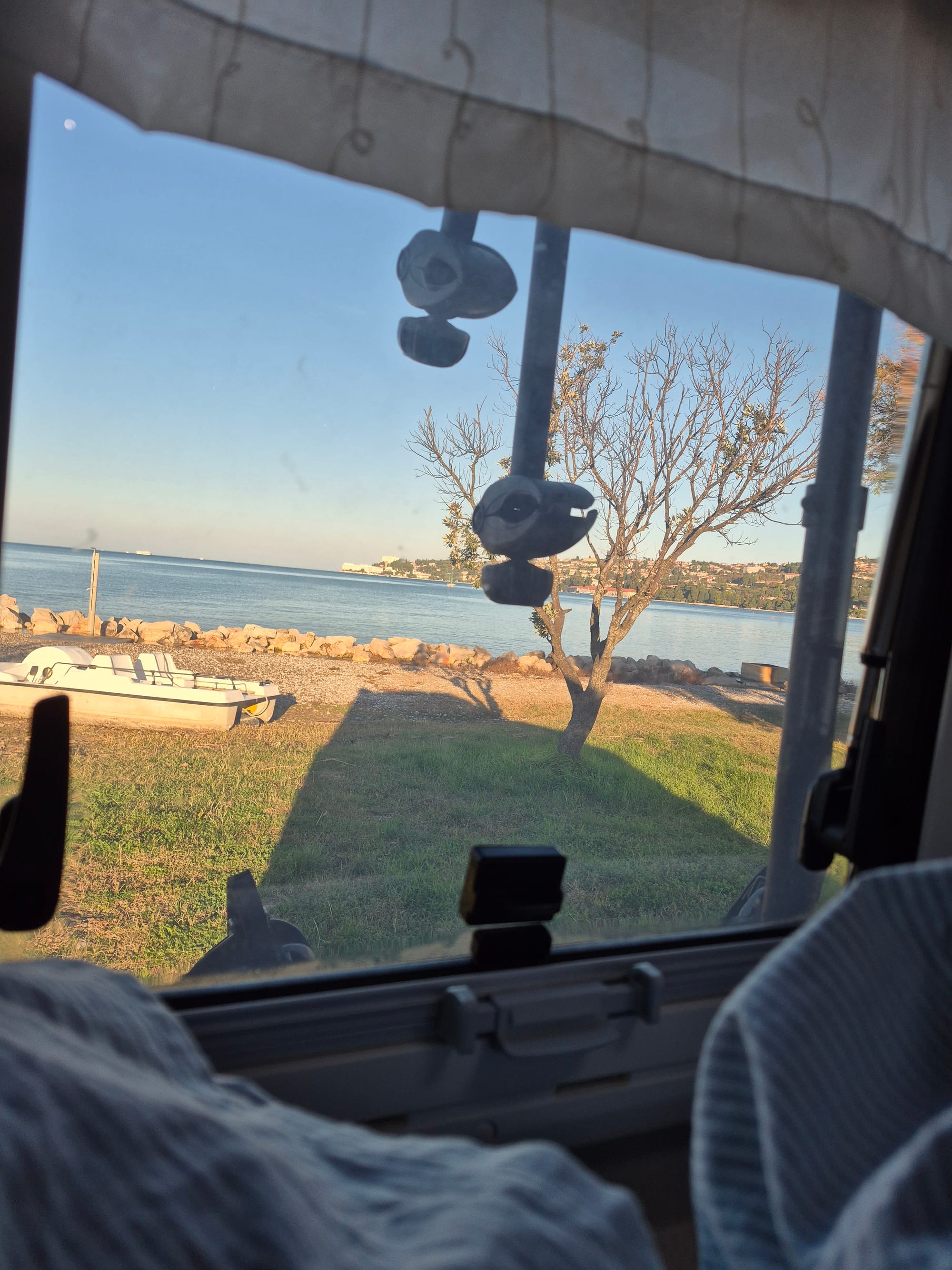 Zum ersten Mal stehen wir mit dem Heck zum Meer und das ist genial, sowohl für den Blick auf Piran beim Aufwachen...