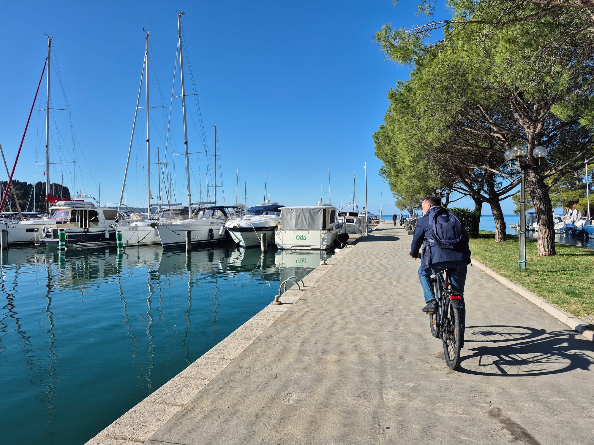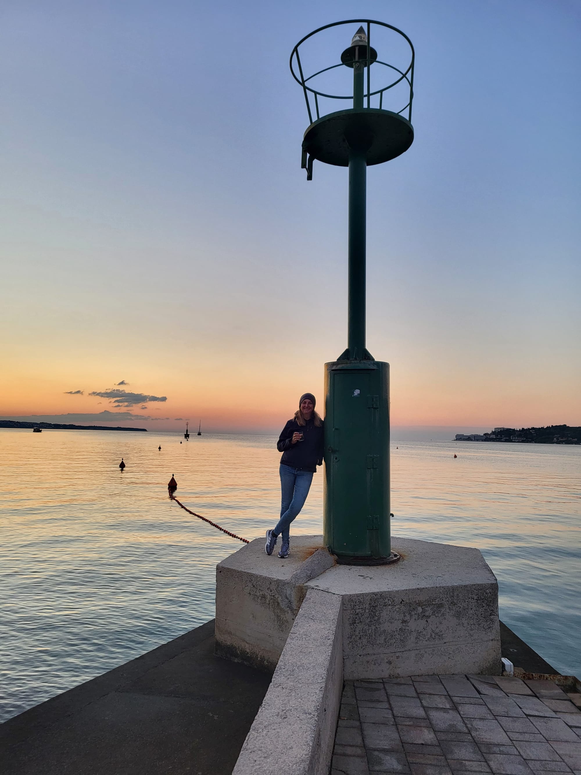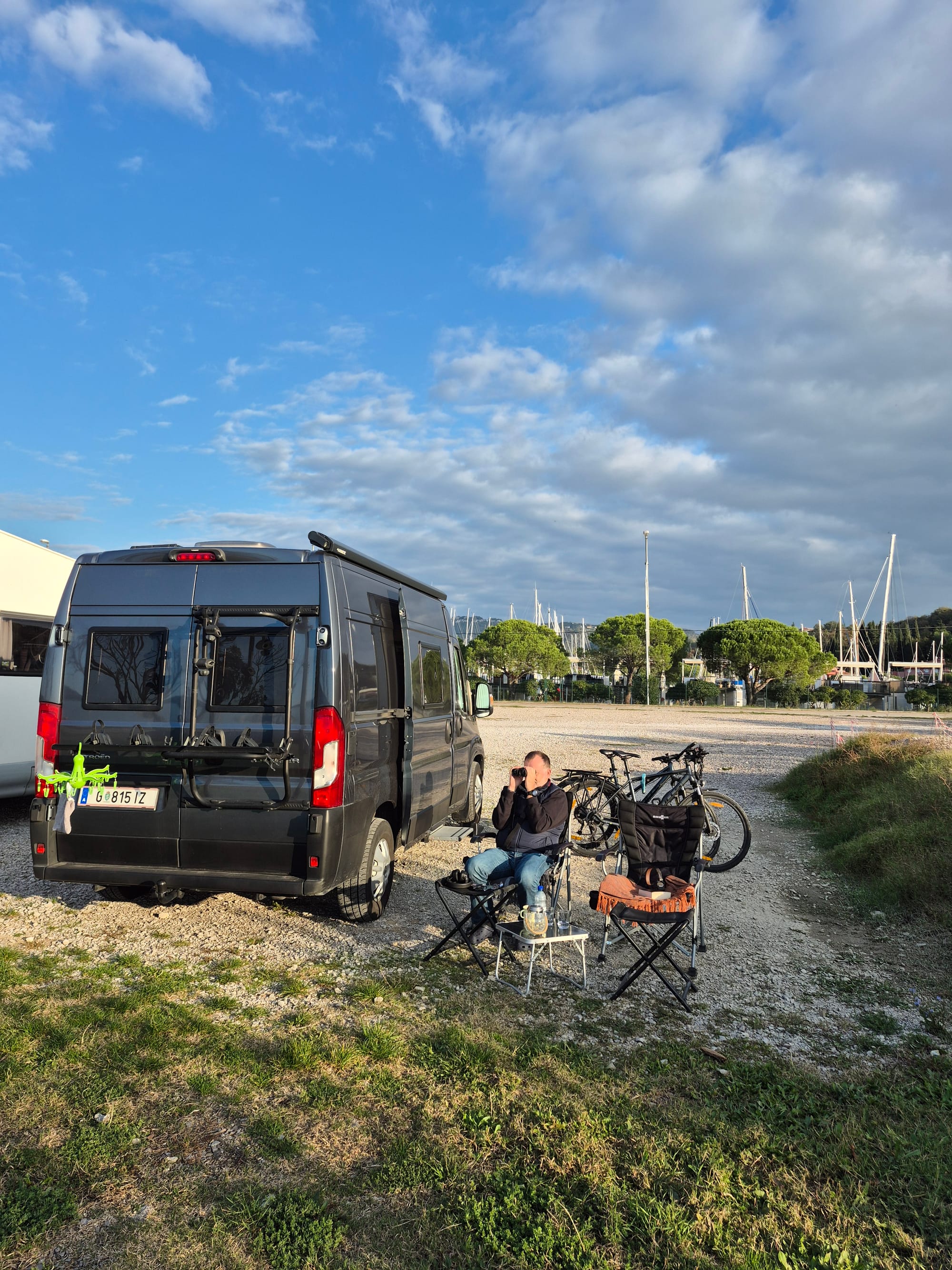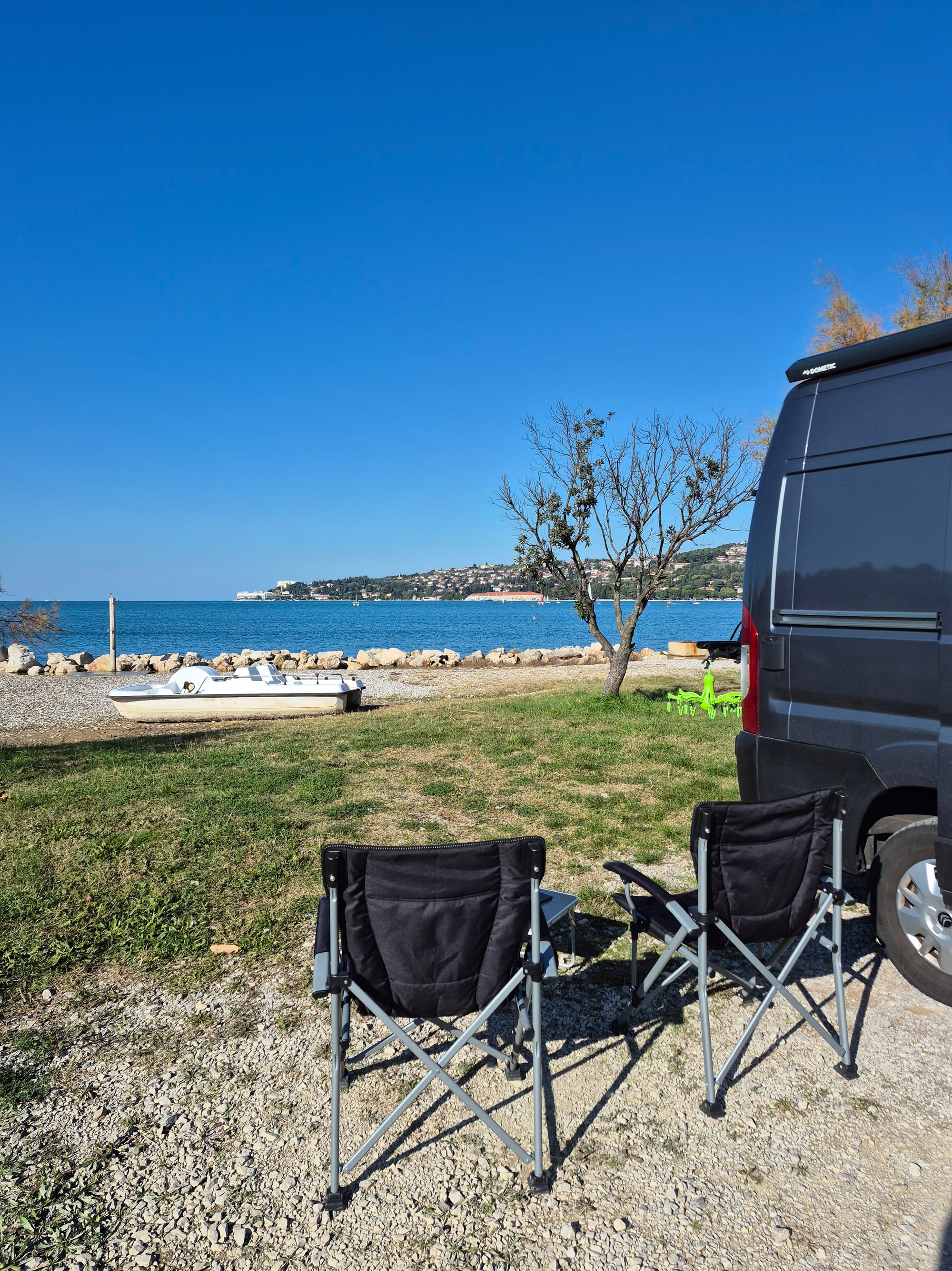 Zum ersten Mal stehen wir mit dem Heck zum Meer und das ist genial, sowohl für den Blick auf Piran beim Aufwachen...