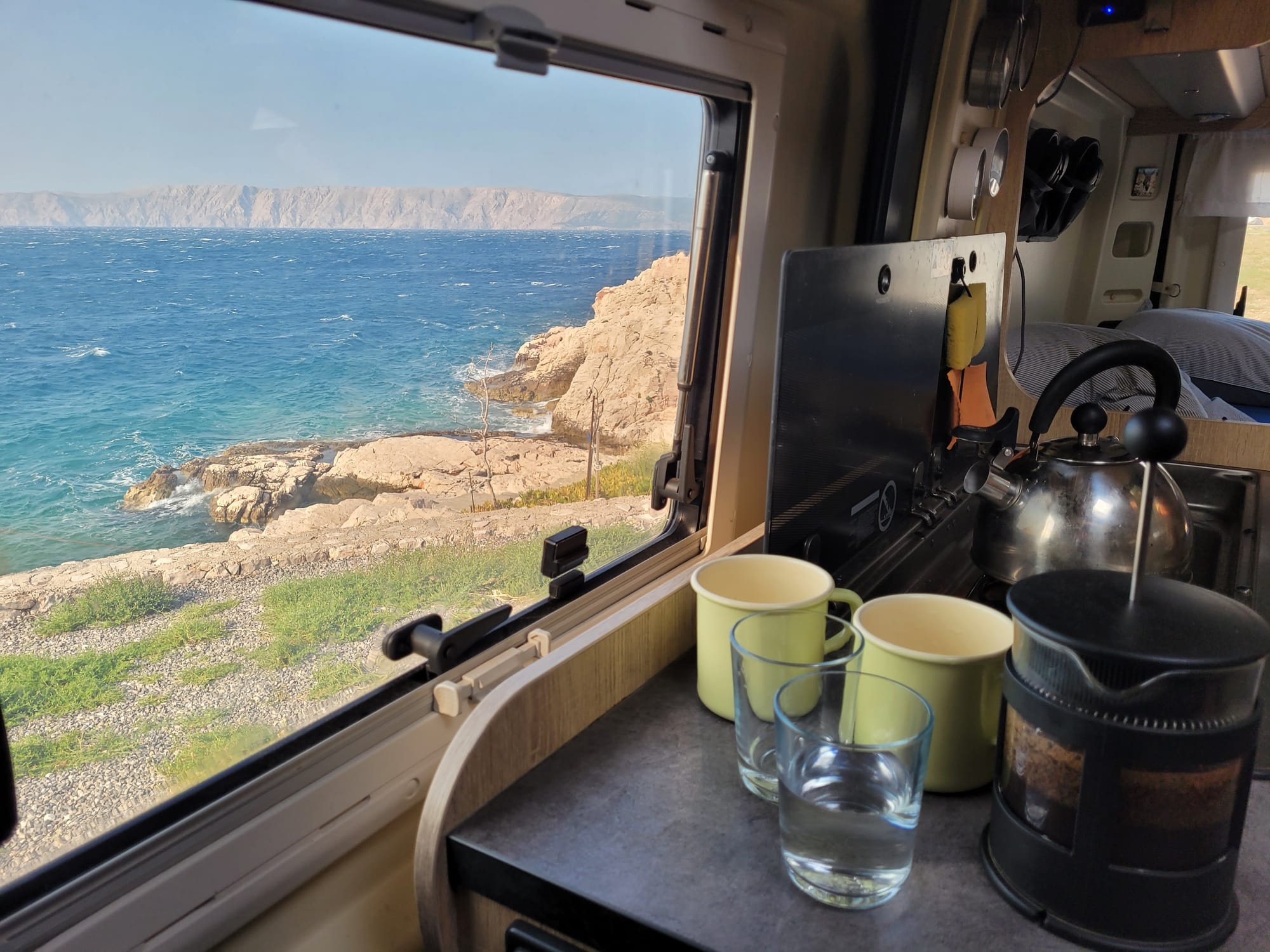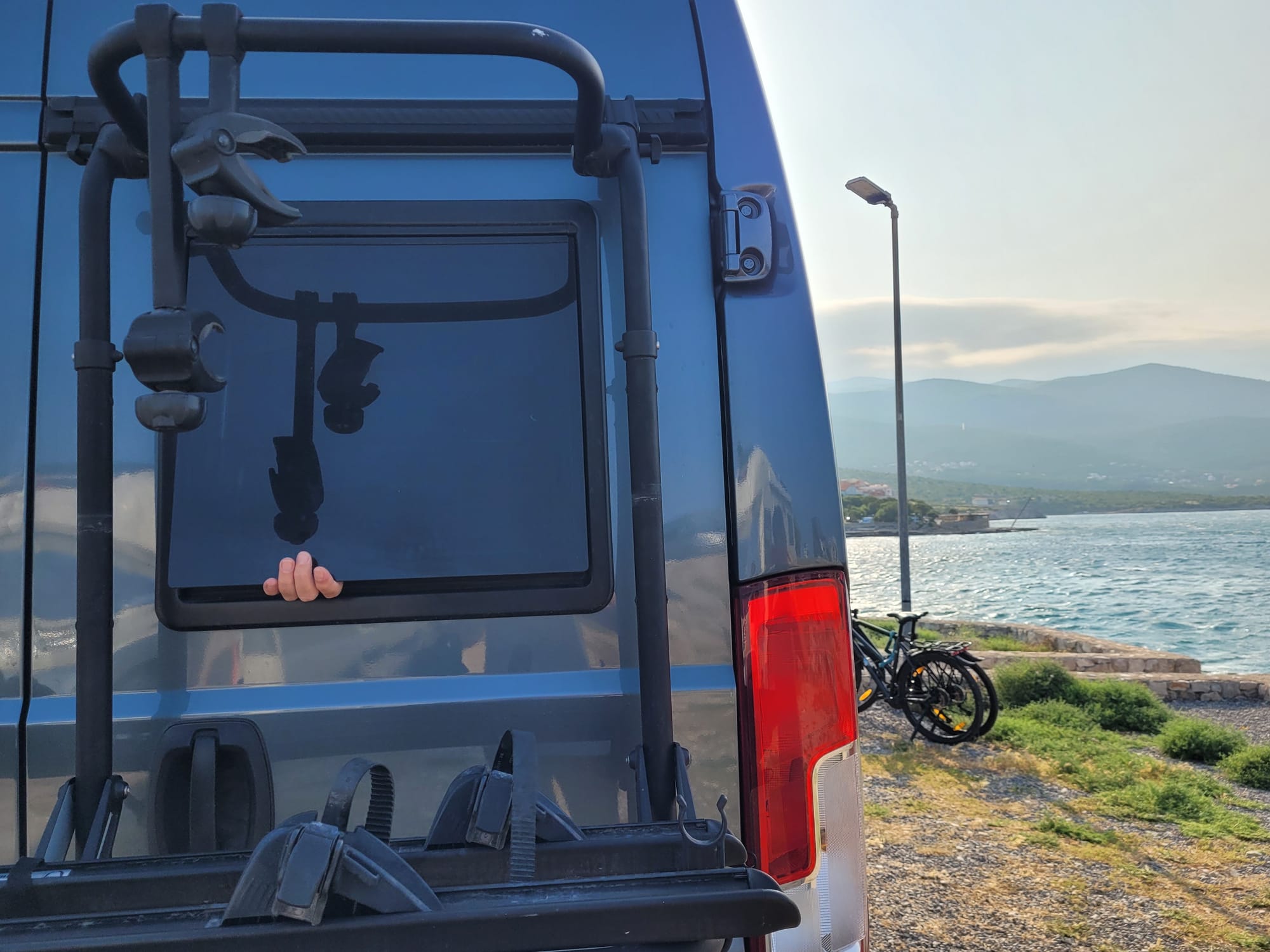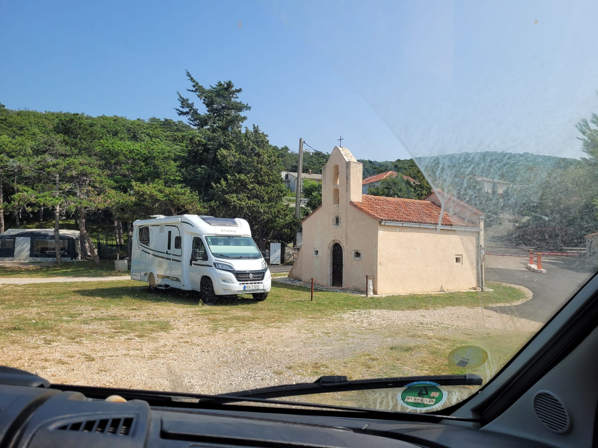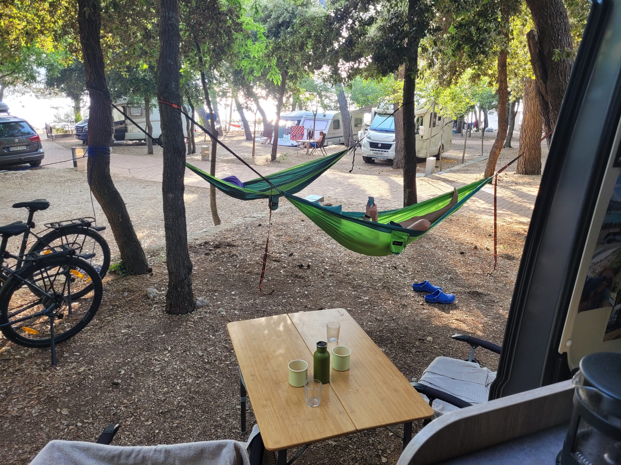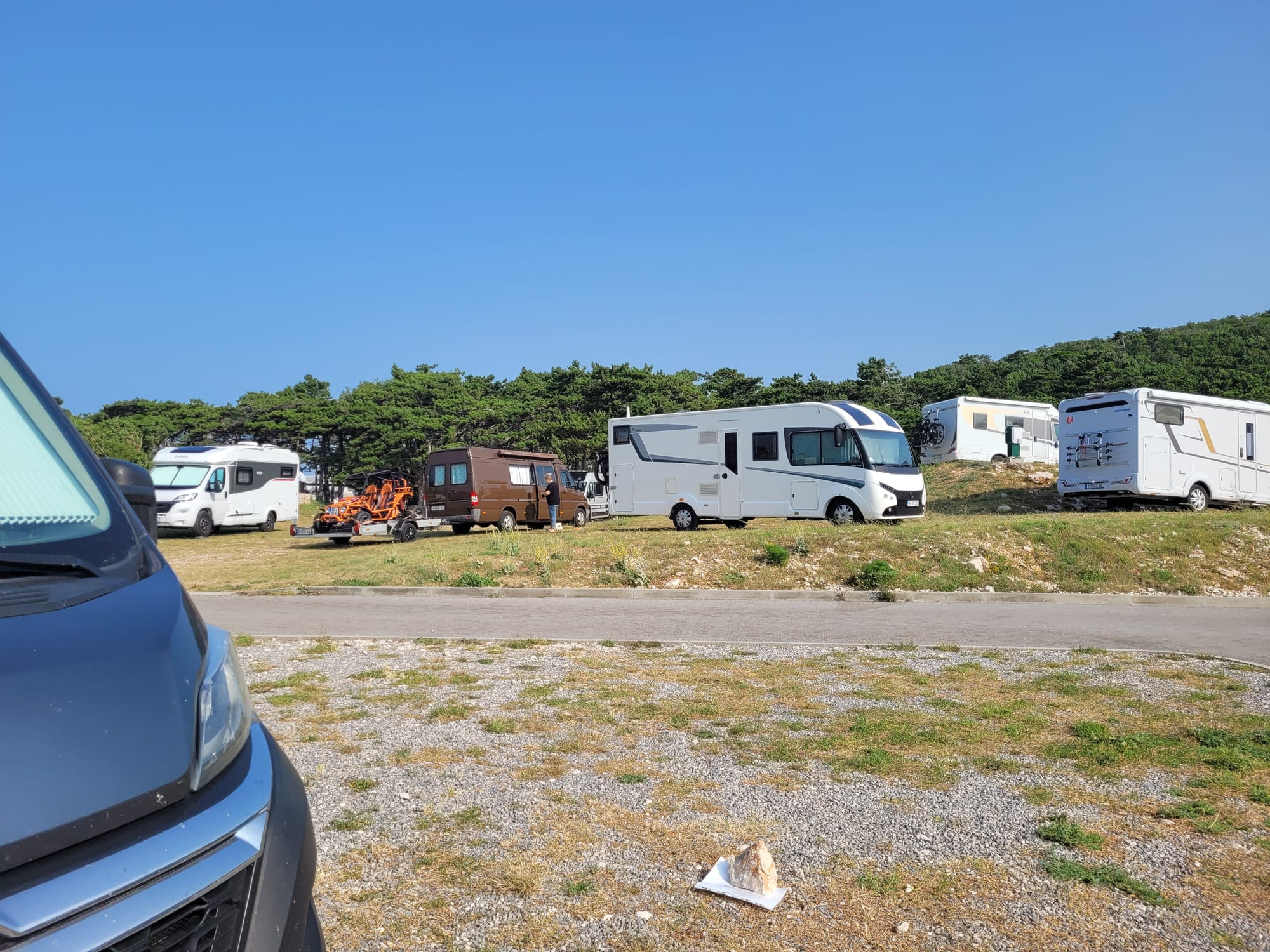Wir müssen beim Camping Park Soline zu Fuß einen Stellplatz aussuchen, aber das ist auch total anstrengend. Und so nehmen wir den erstbesten freien Platz in Meernähe, hinter zwei Großfamilien mit fünf bis sechs Kindern und zwei Hunden. Aber wir haben keine Lust weiter zu suchen.