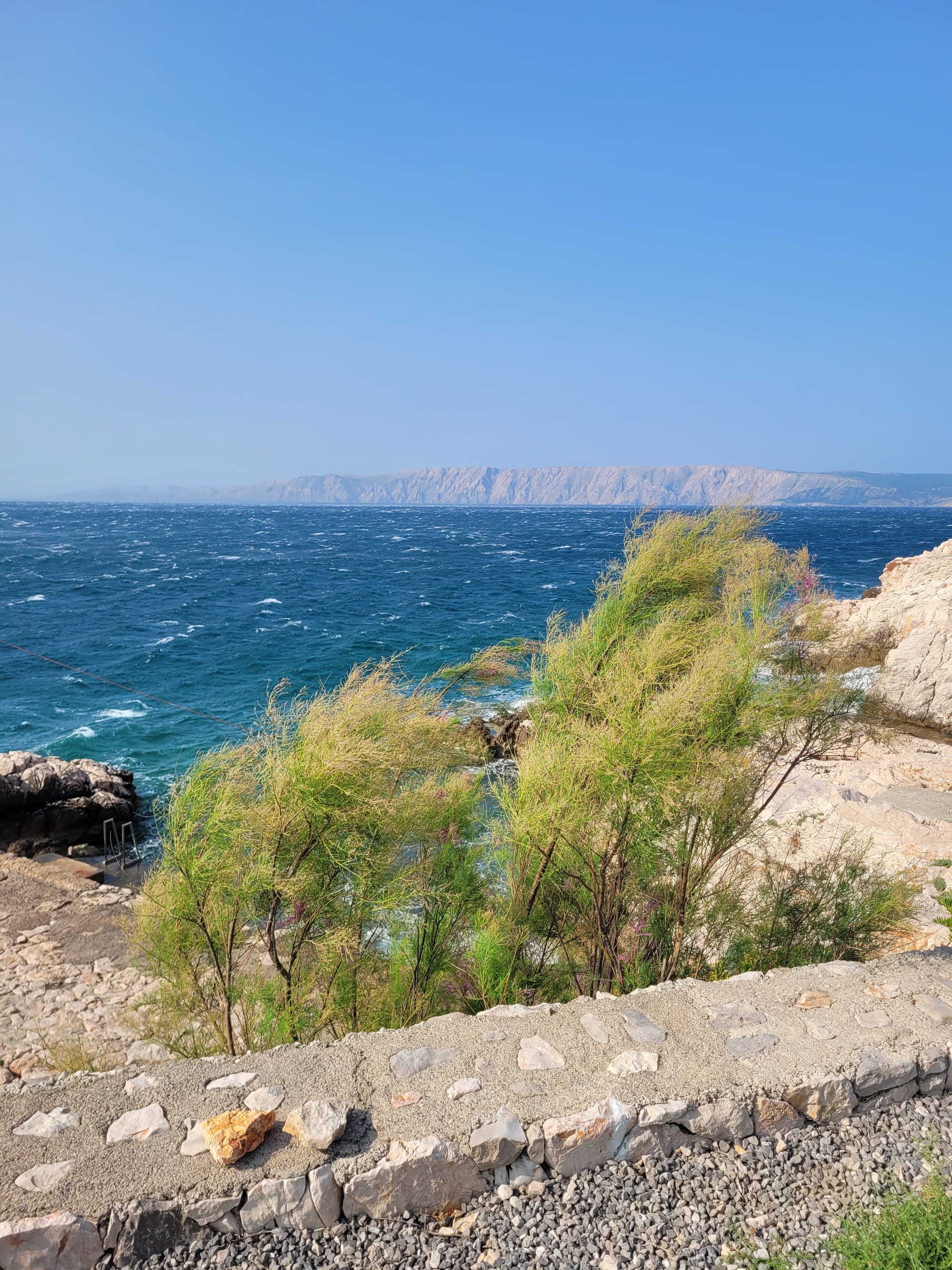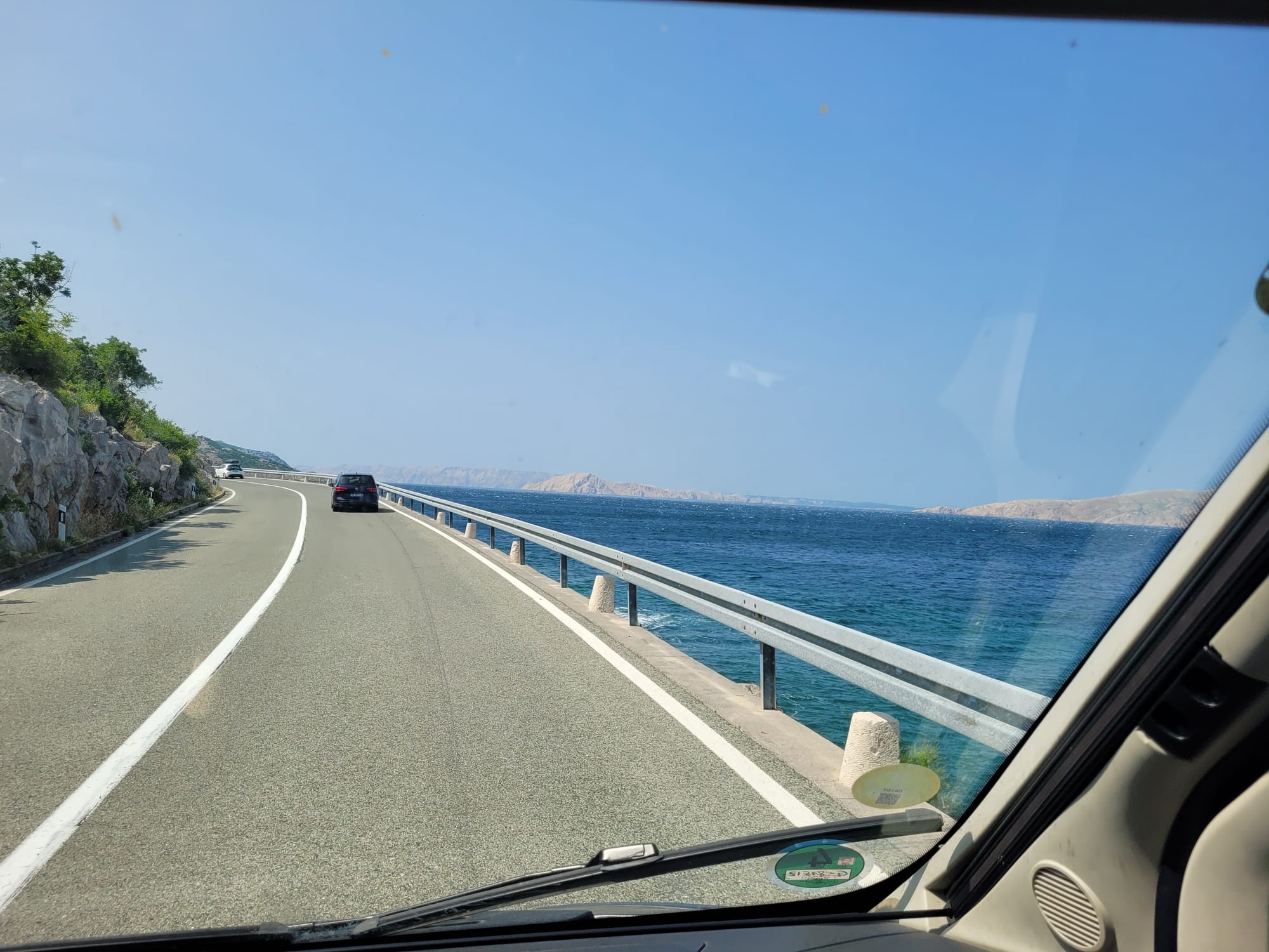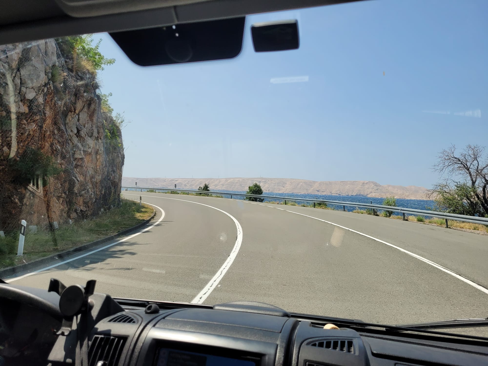 Wir fahren mit Blick auf die kahlen Felsen der Insel Rab entlang.