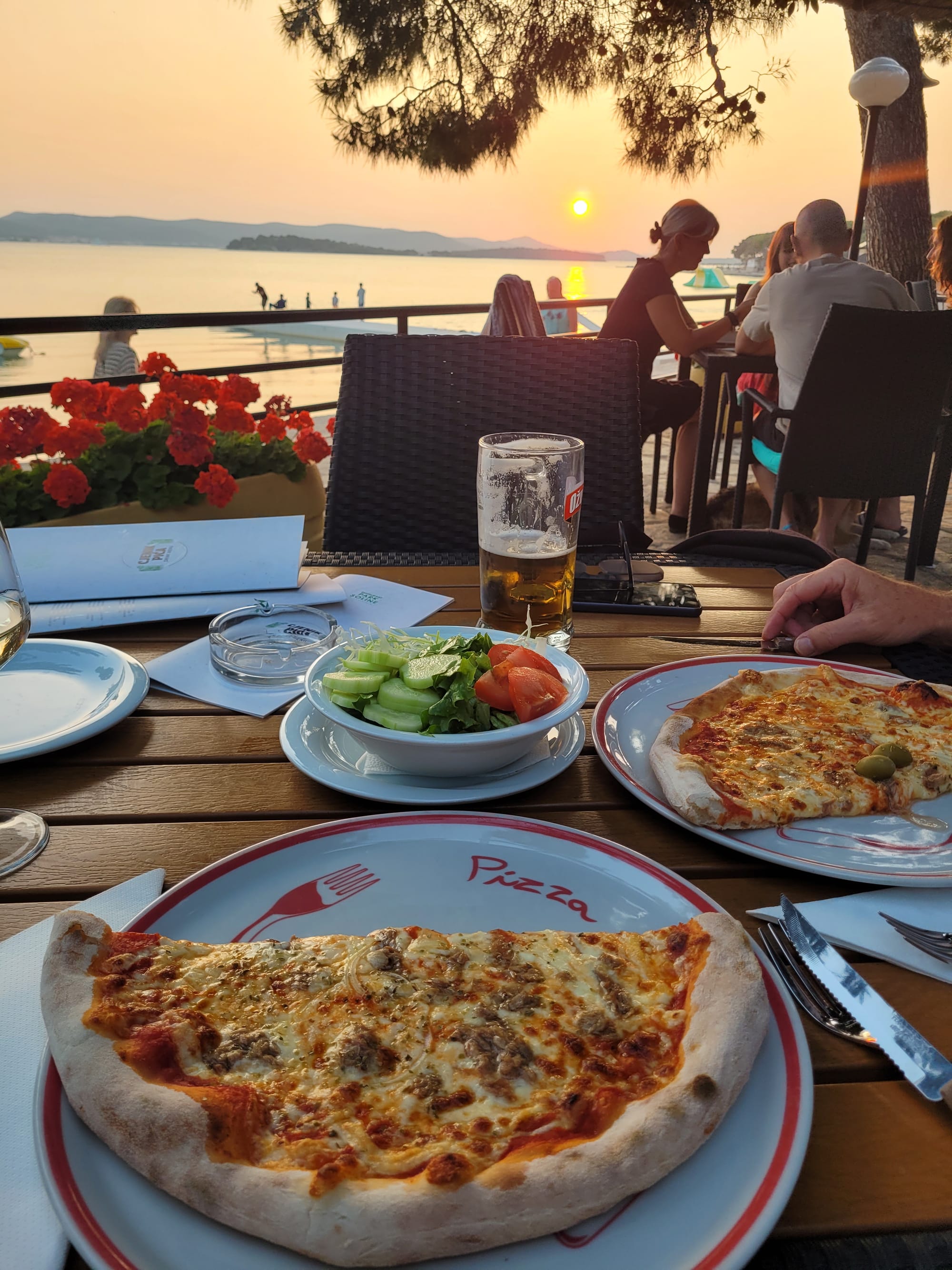 Der Plan war nach Biograd in unsere Stammpizzeria zu radeln, aber dazu sind wir auch zu faul. Wir gehen in die Campingplatz Konoba und teilen uns dort eine Pizza. Auch sehr schön.