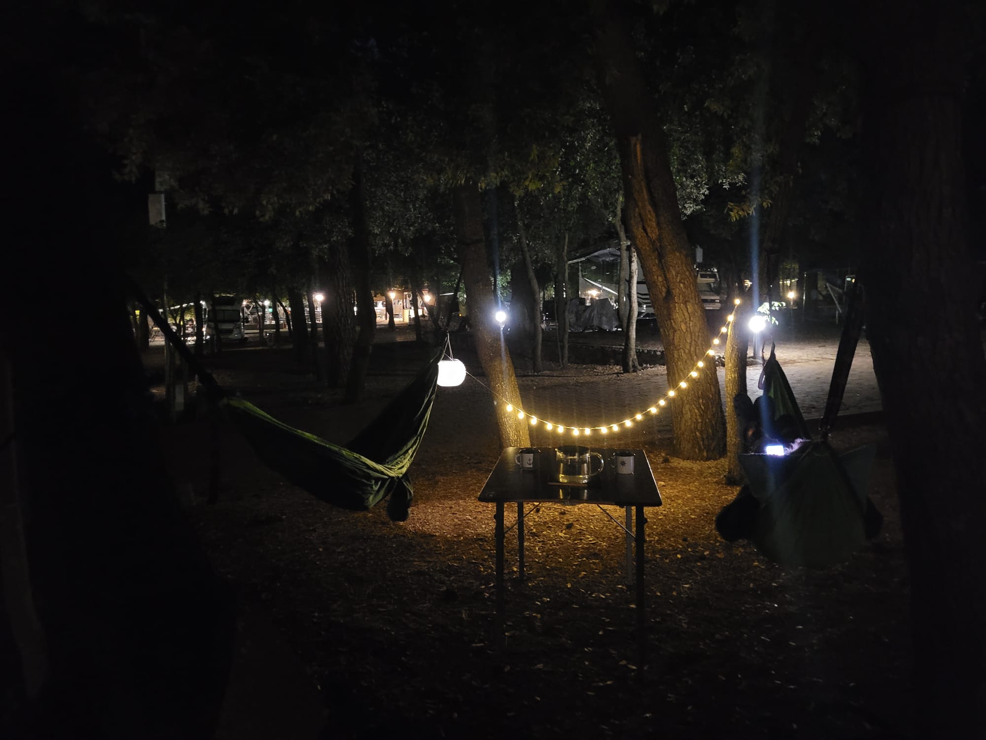 Unser Stellplatz hat viele Bäume, durch die sich Luigi schängeln muss. Schließlich stehen wir aber gut und bemerken, dass er eigentlich genial für unsere beiden Hängematten ist.