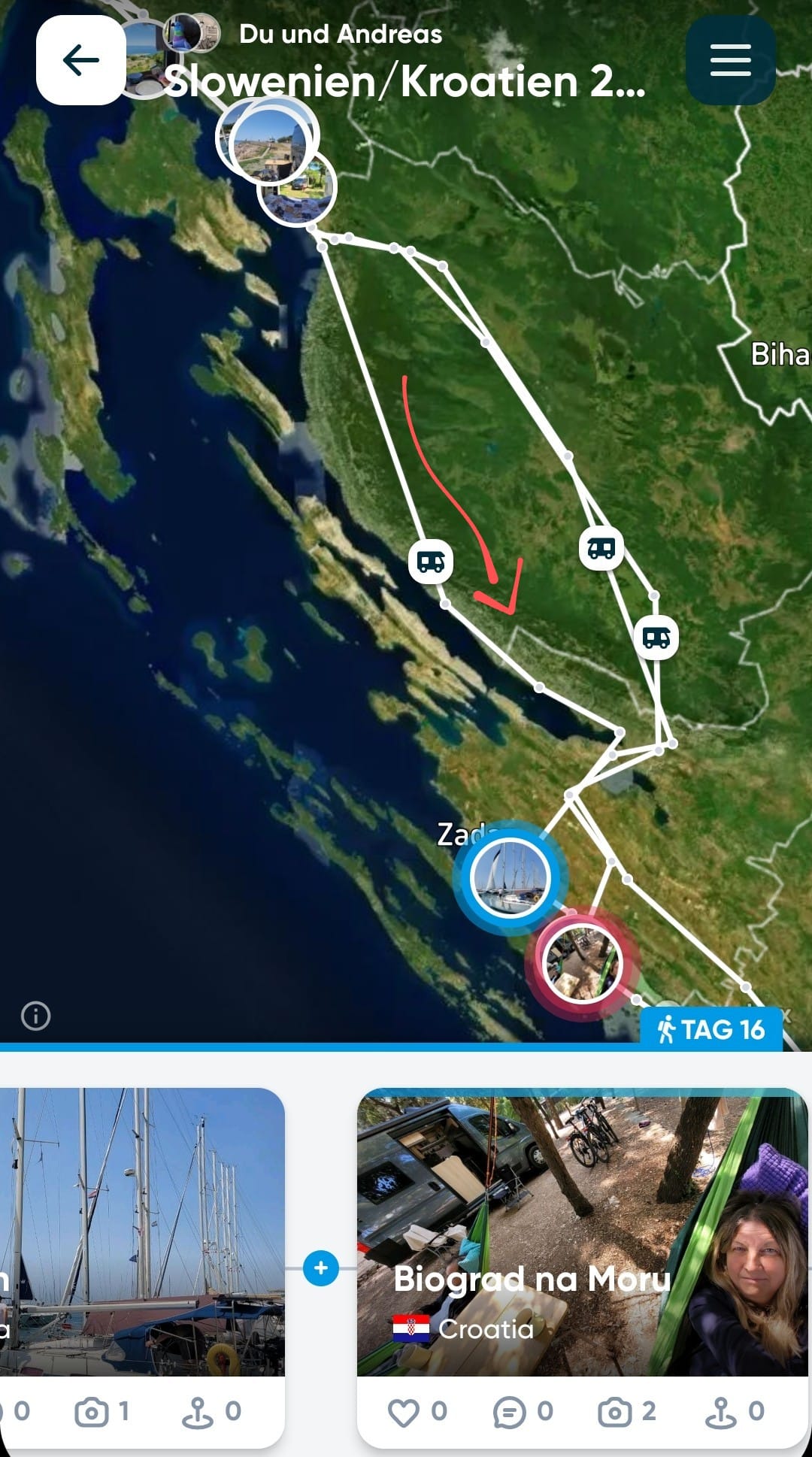 Wir verbleiben, dass wir uns morgen melden und fahren weiter zum Campingplatz in Biograd. Da das Haus von Tobias ein bisschen im Hinterland liegt verhaspelt sich das Navi bei der Route...