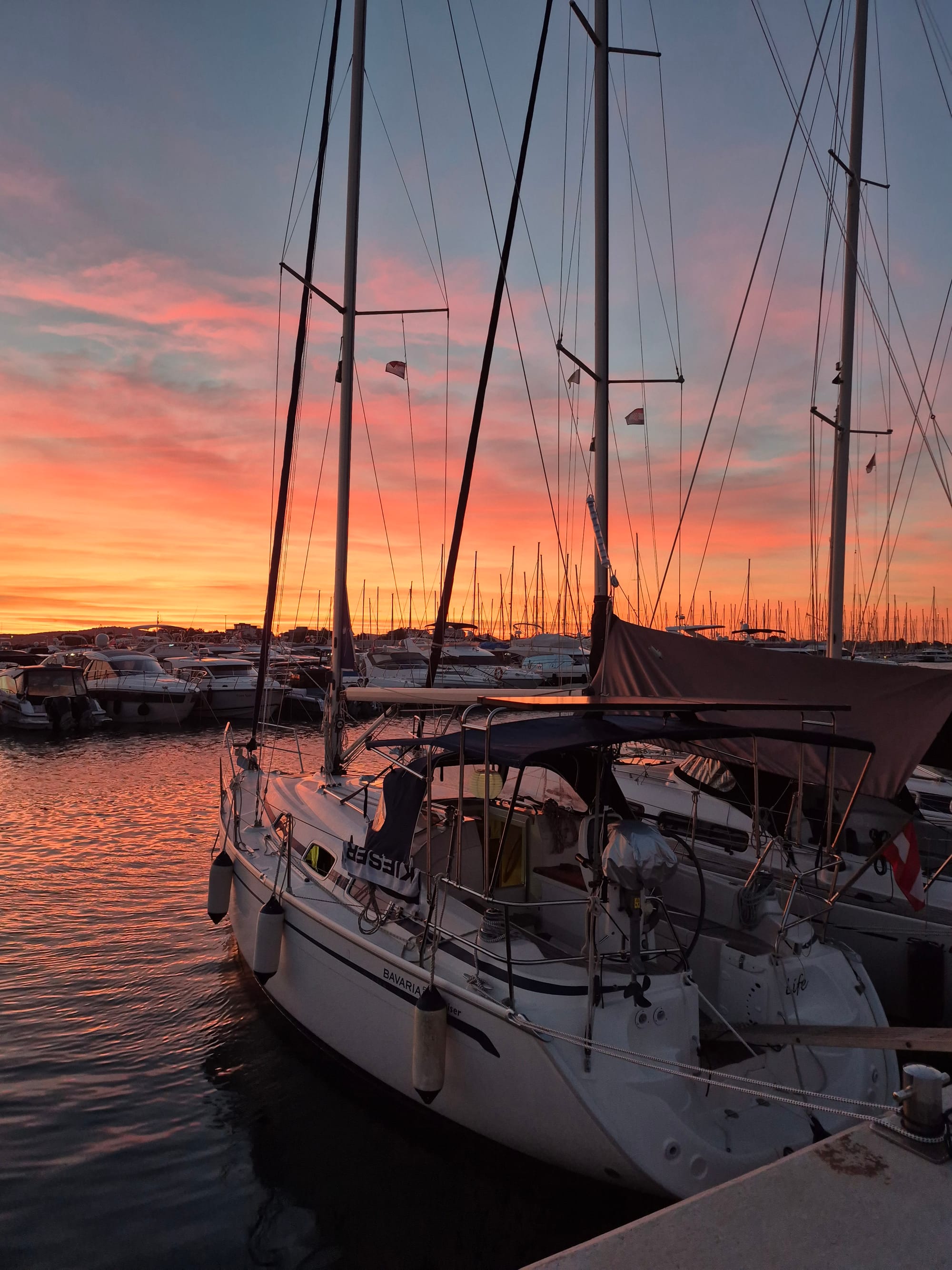 Am Nachmittag genieße ich den Strand der Marina und schaue den auslaufenden Schiffen zu - heute ist wieder Charterbeginn, Samstag.