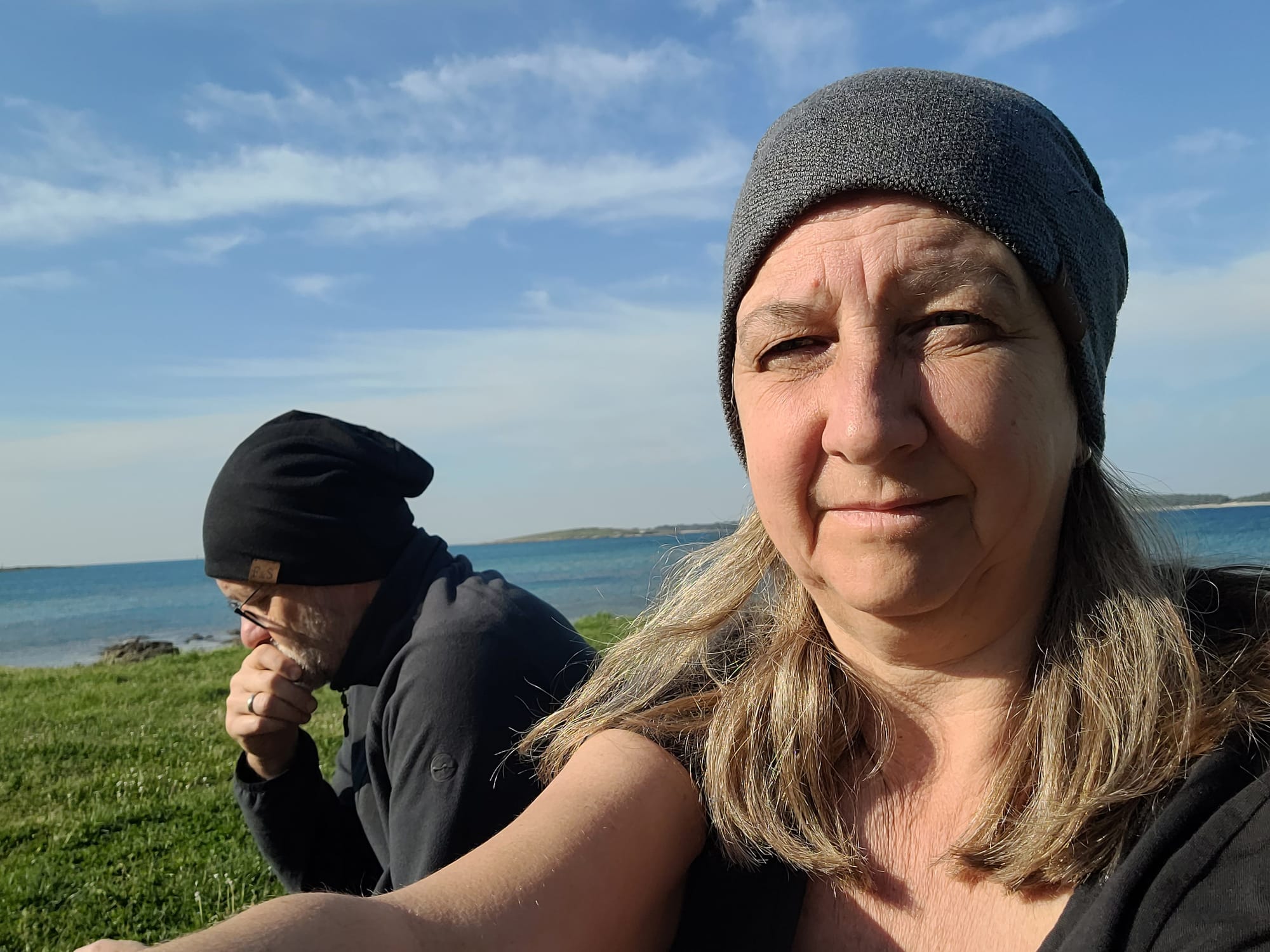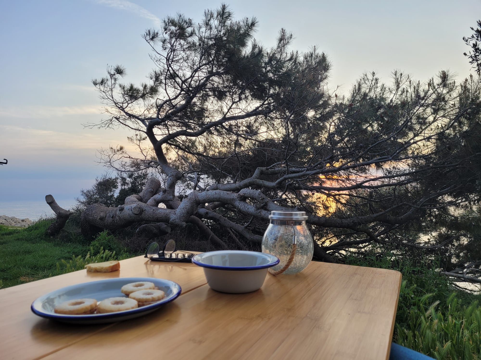 Entweder ist es hier windgeschützter oder der Wind hat etwas nachgelassen. Auf jeden Fall können wir den Nachmittag im Freien mit Meerblick genießen.