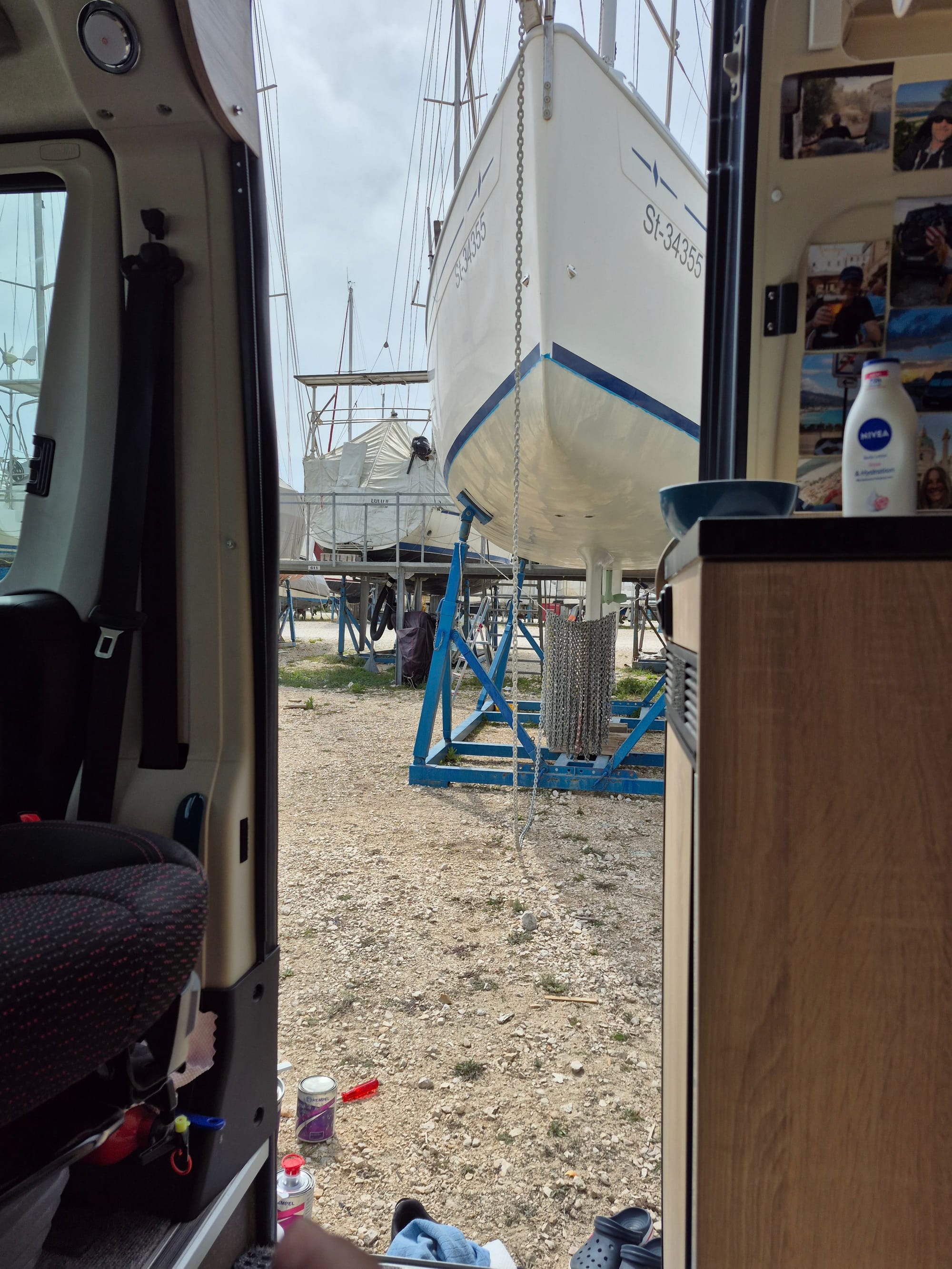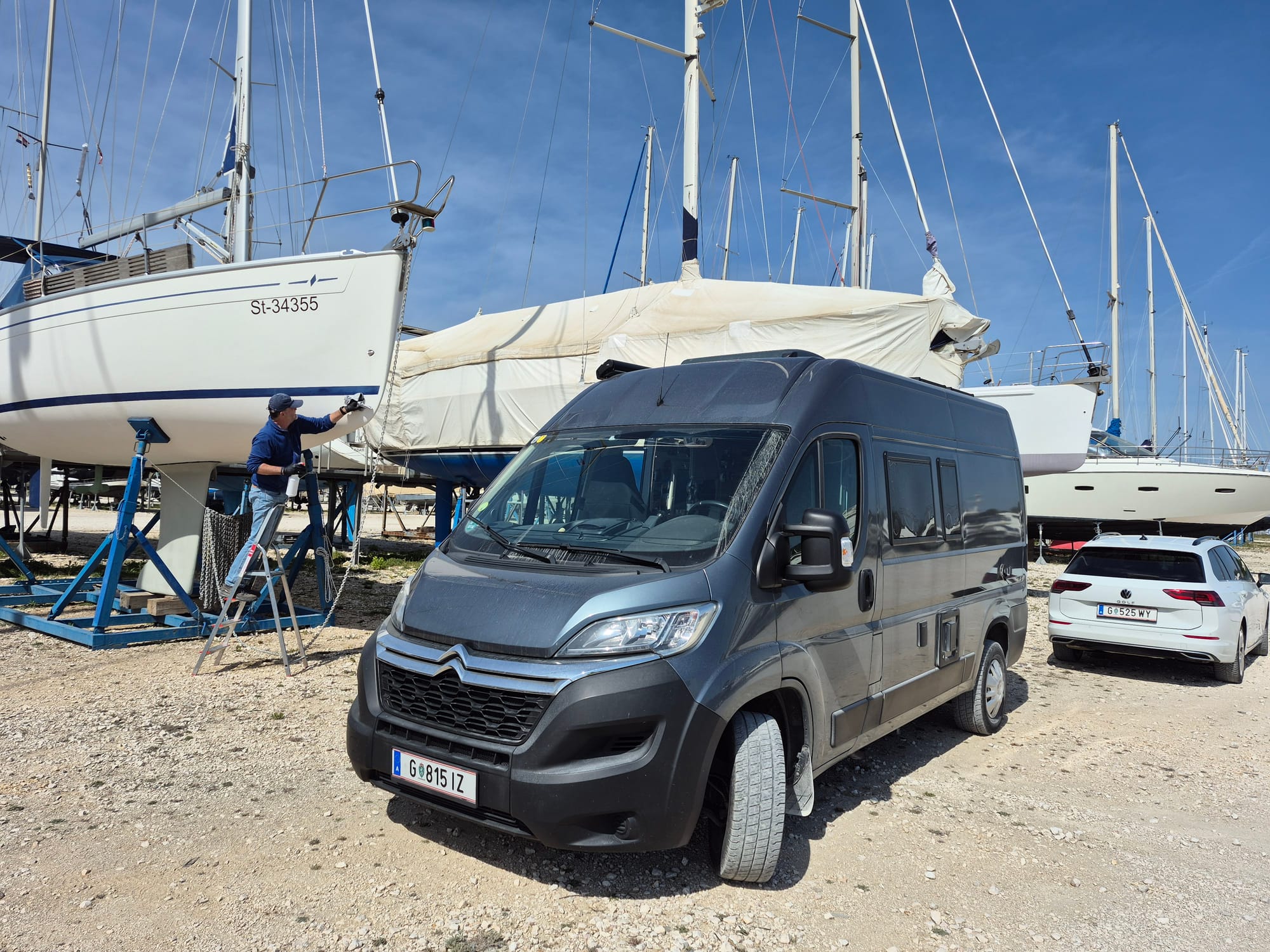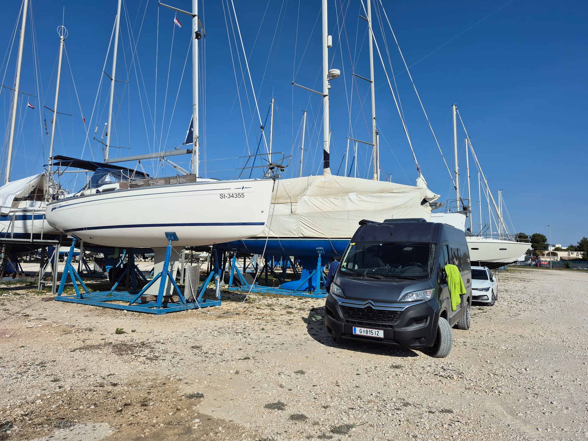 Heute ist auch unser Nachbar hier um an seinem Schiff zu arbeiten, deshalb stellen wir die Autos um.