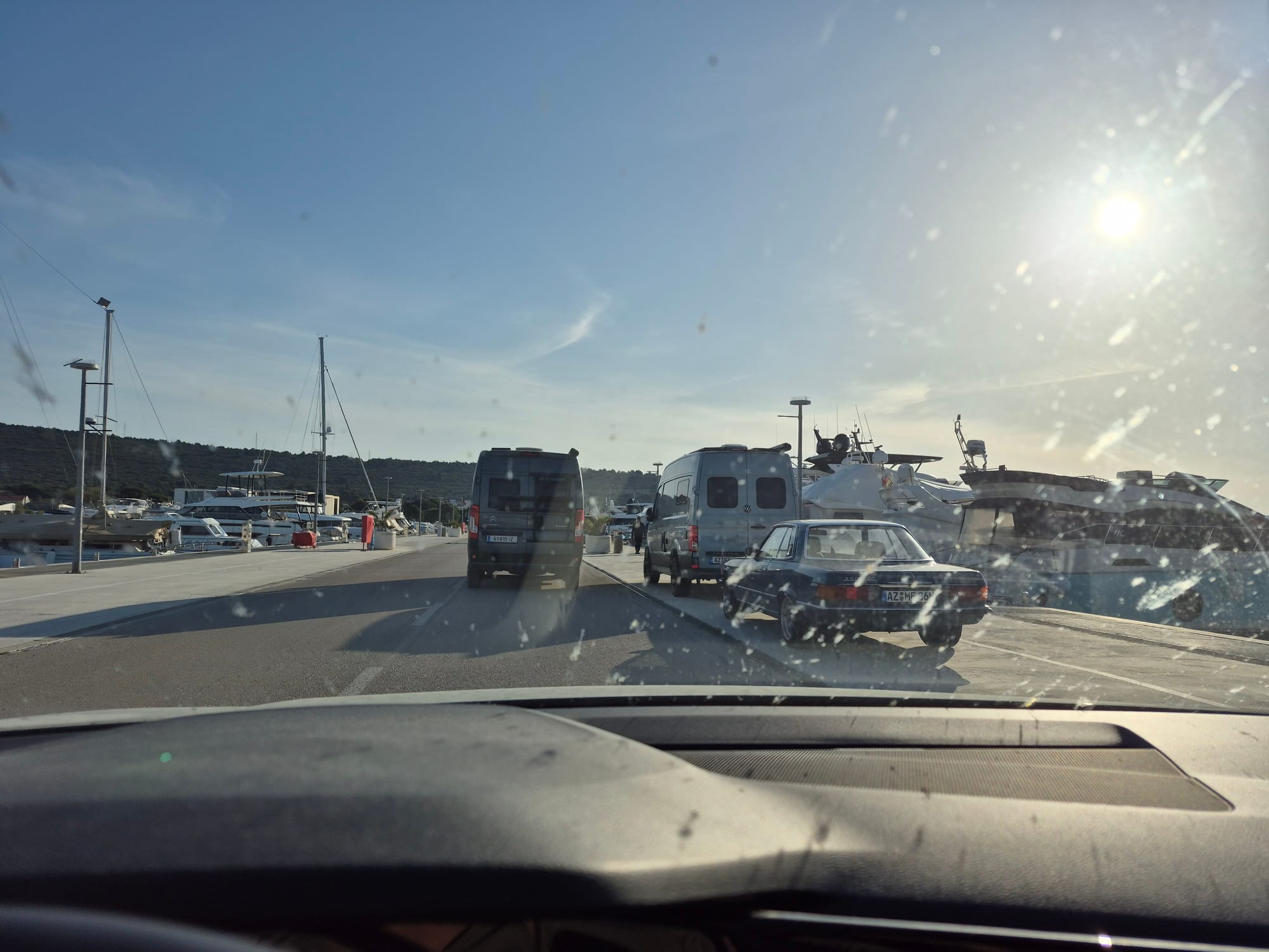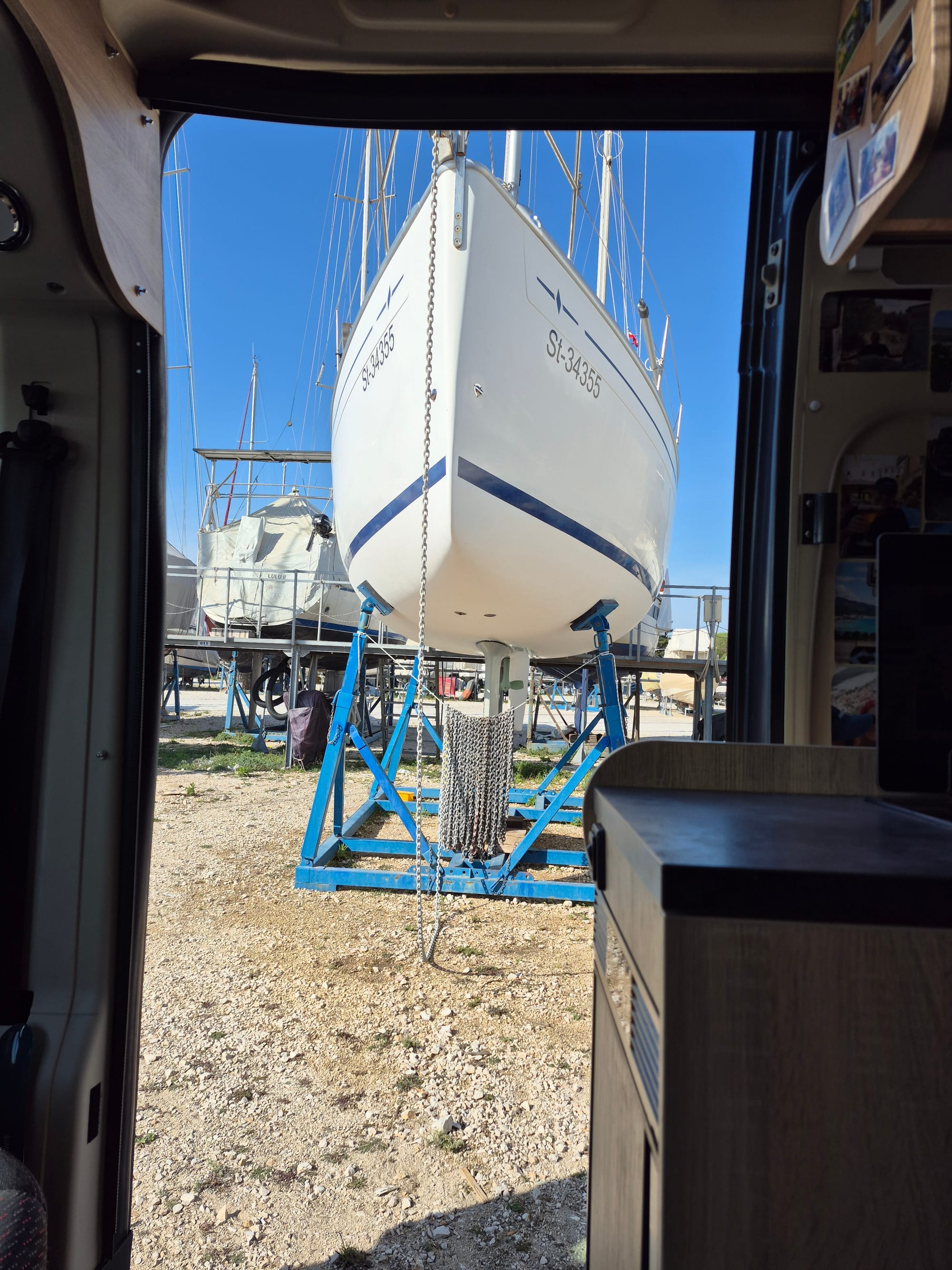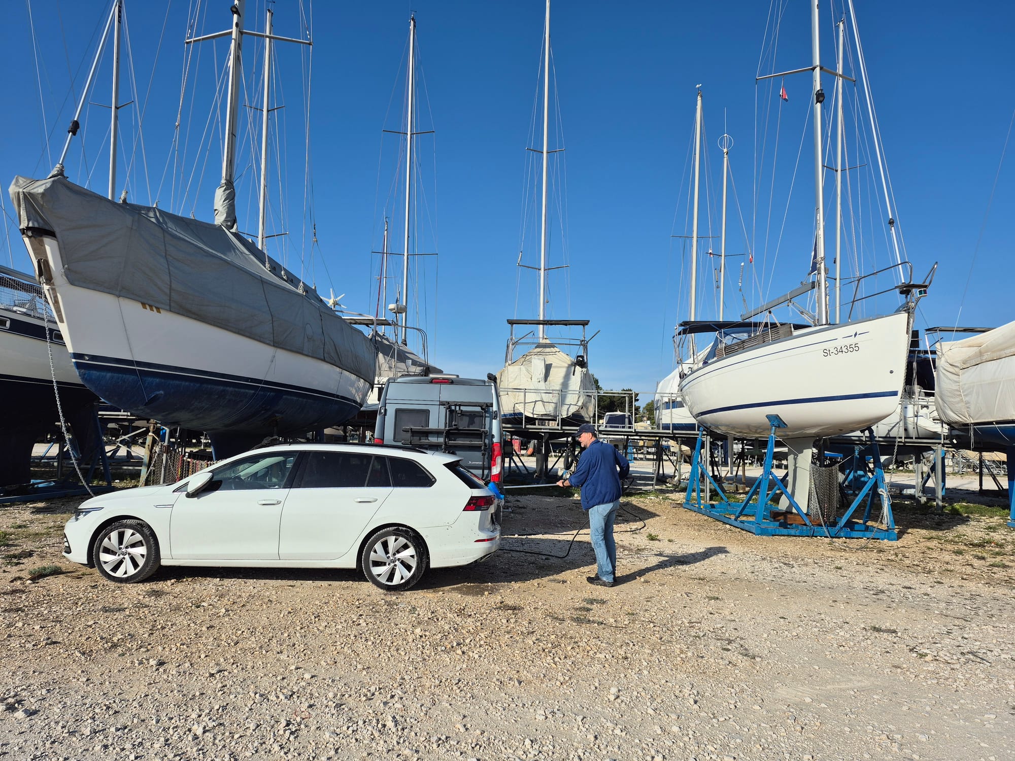Heute ist auch unser Nachbar hier um an seinem Schiff zu arbeiten, deshalb stellen wir die Autos um.