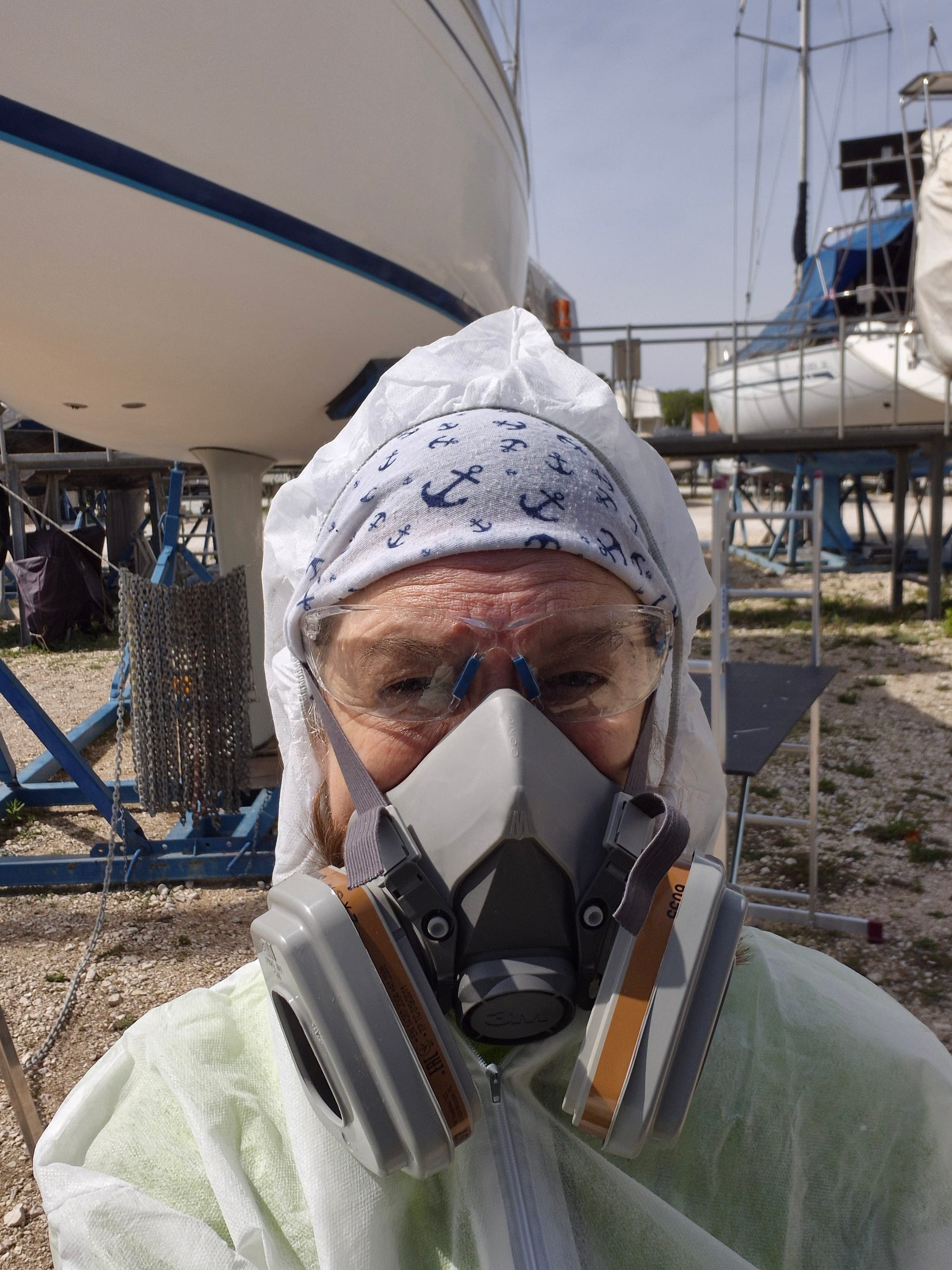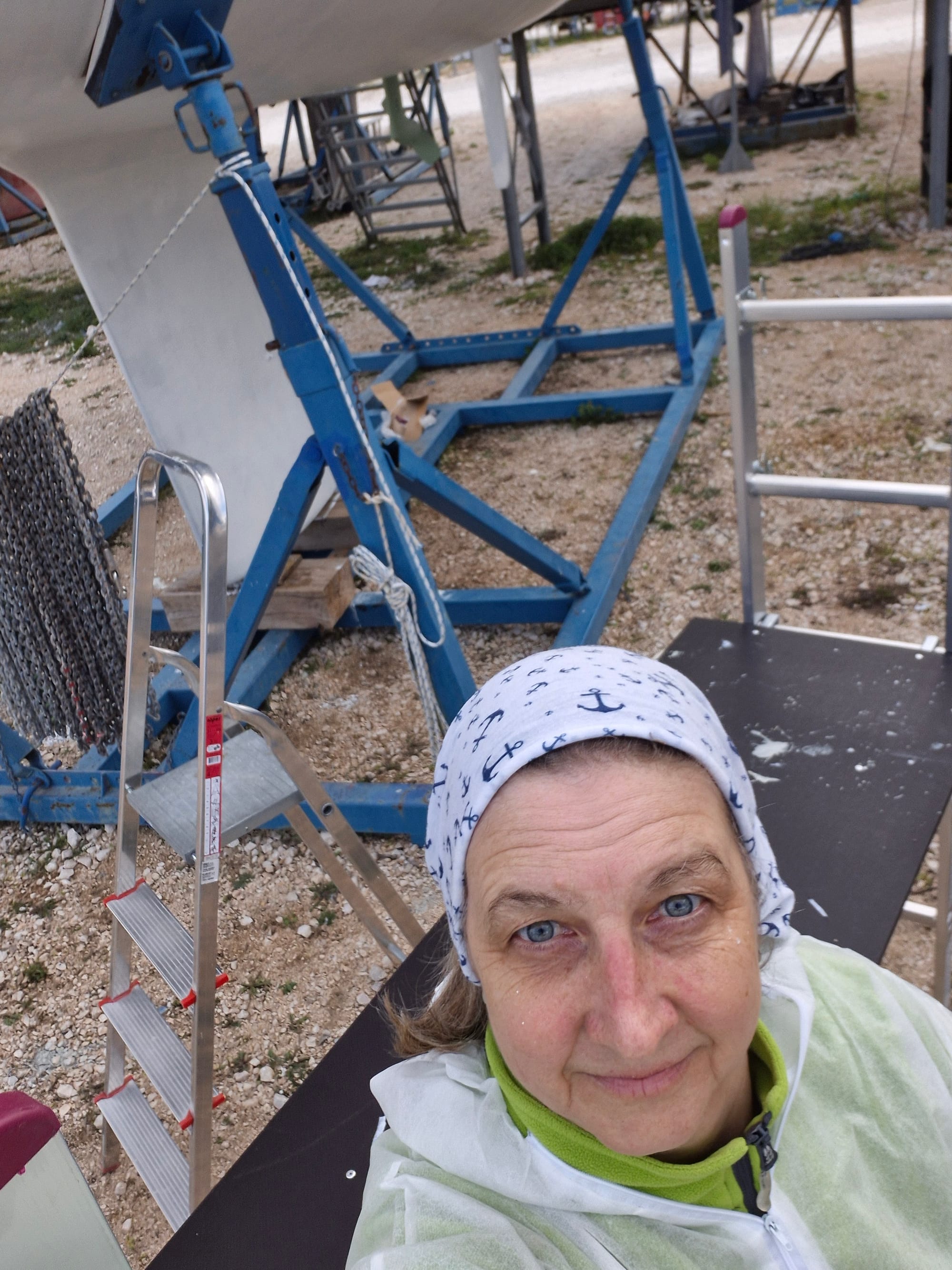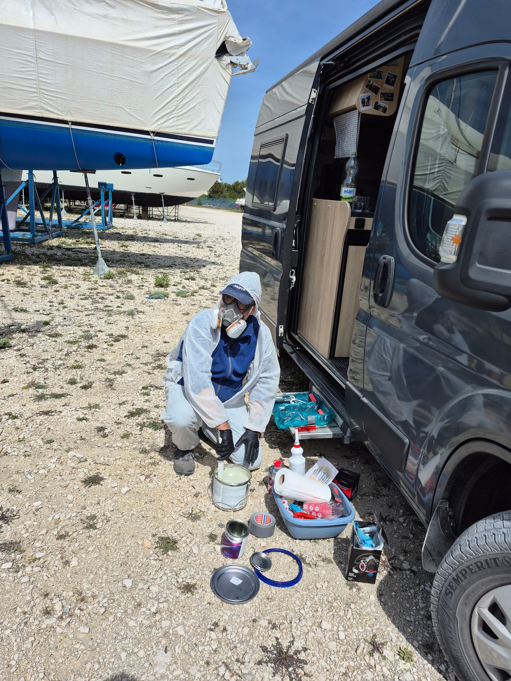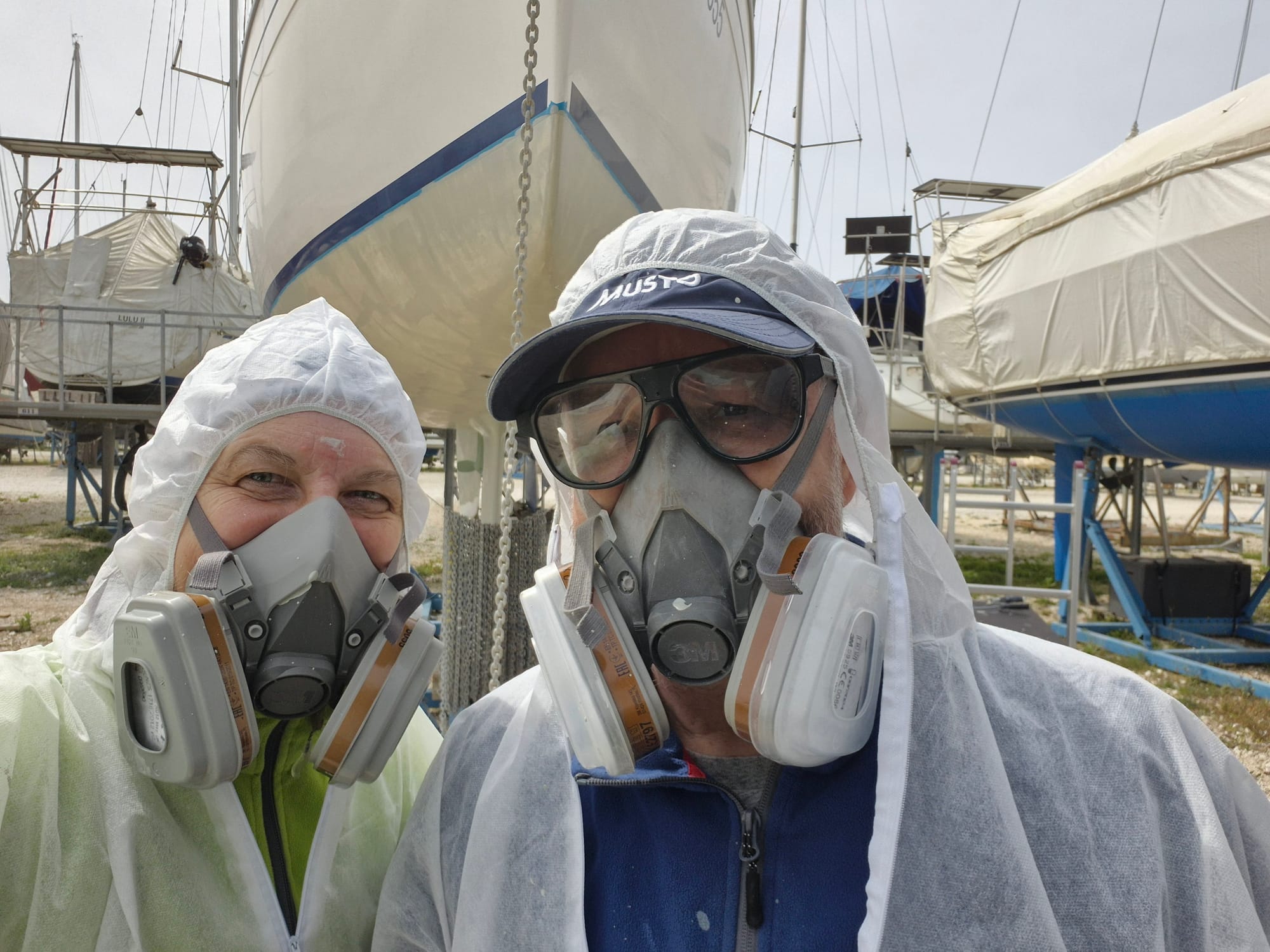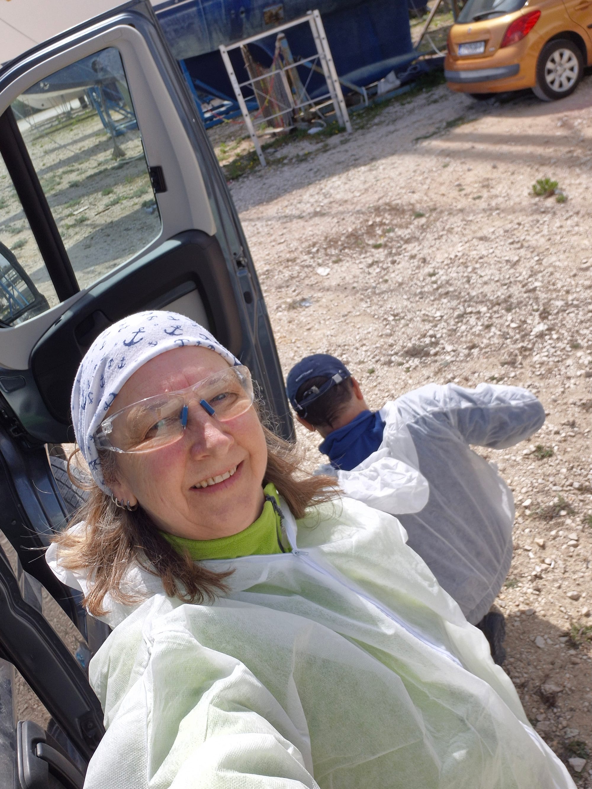 Heute beginnen die Streicharbeiten. Insgesamt müssen wir 7 Schichten auftragen, die je eine Trocknungszeit von 4 Stunden haben. 5 Schichten Primer und abschließend noch 2 Schichten Antifouling.