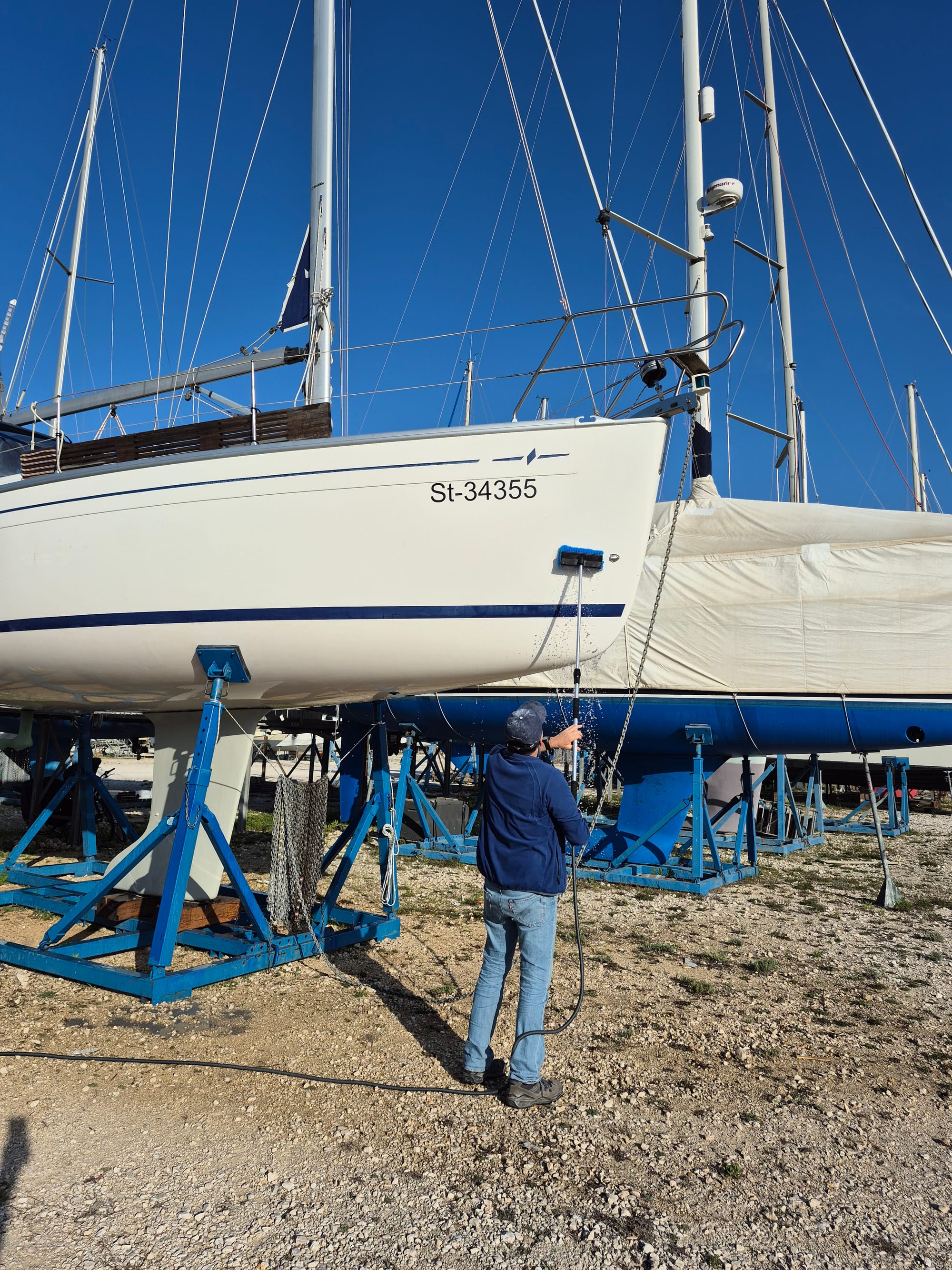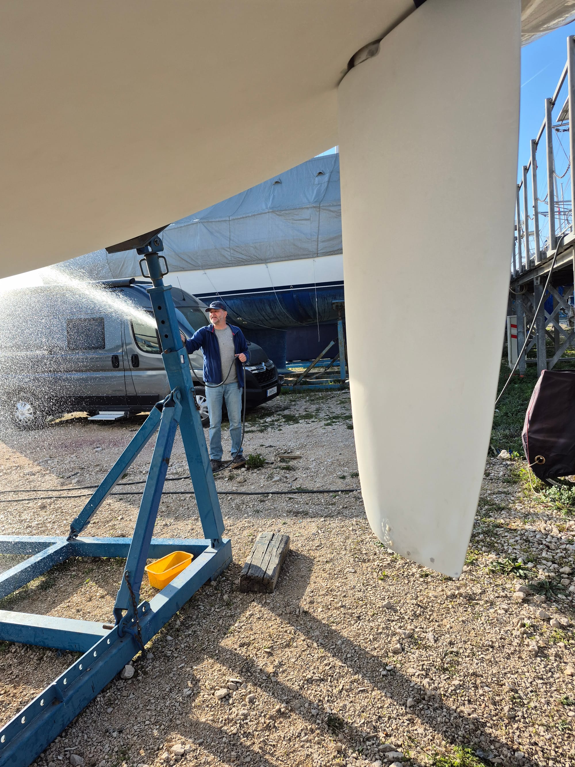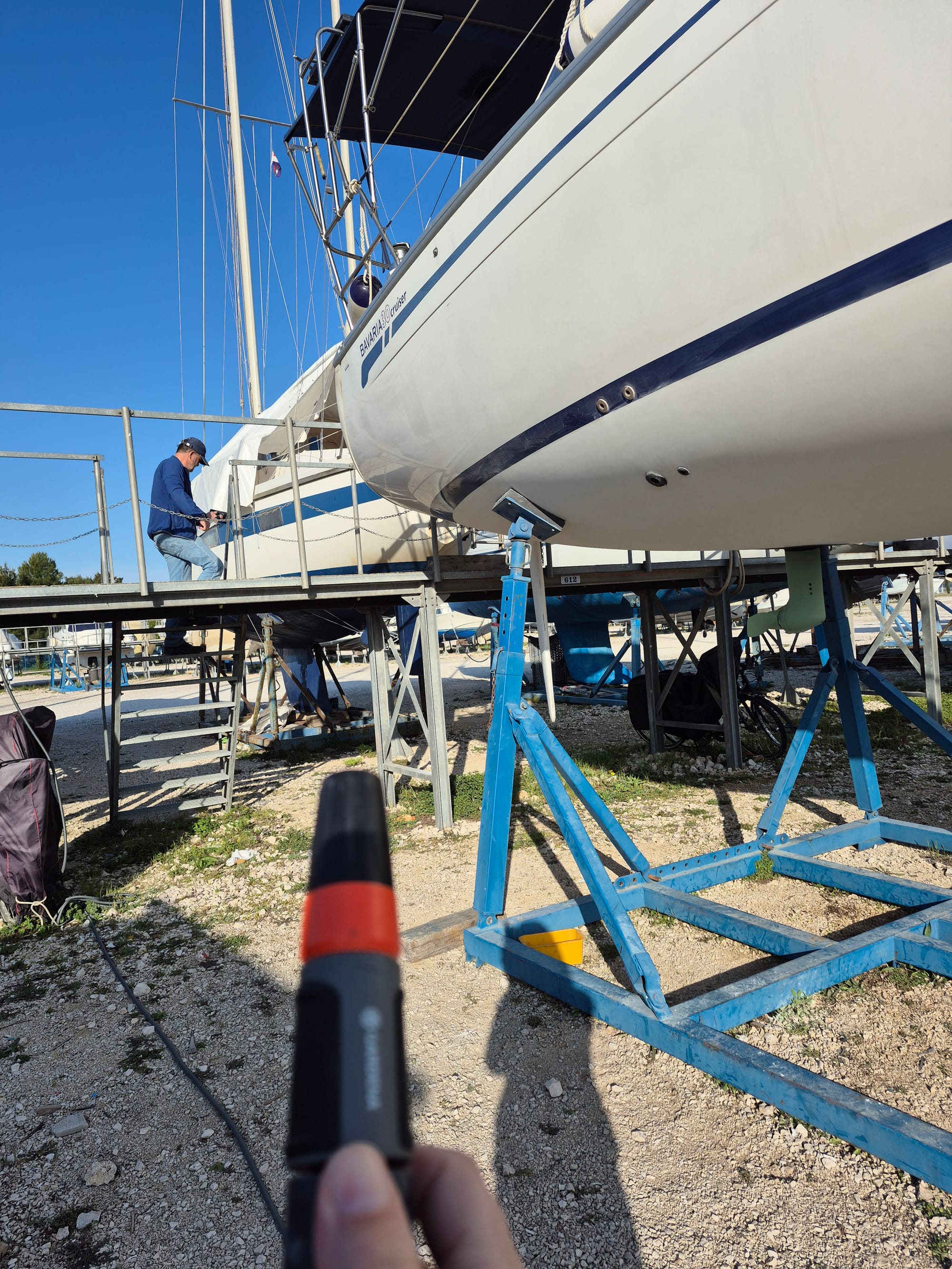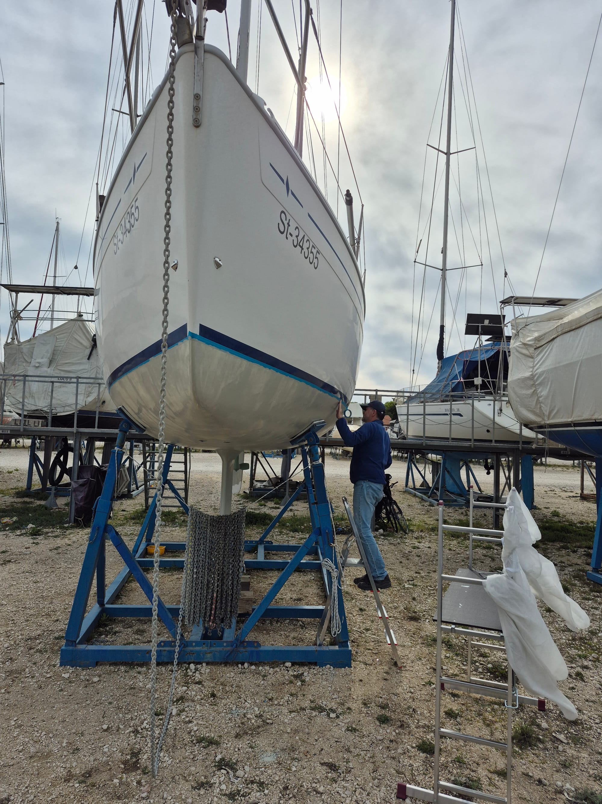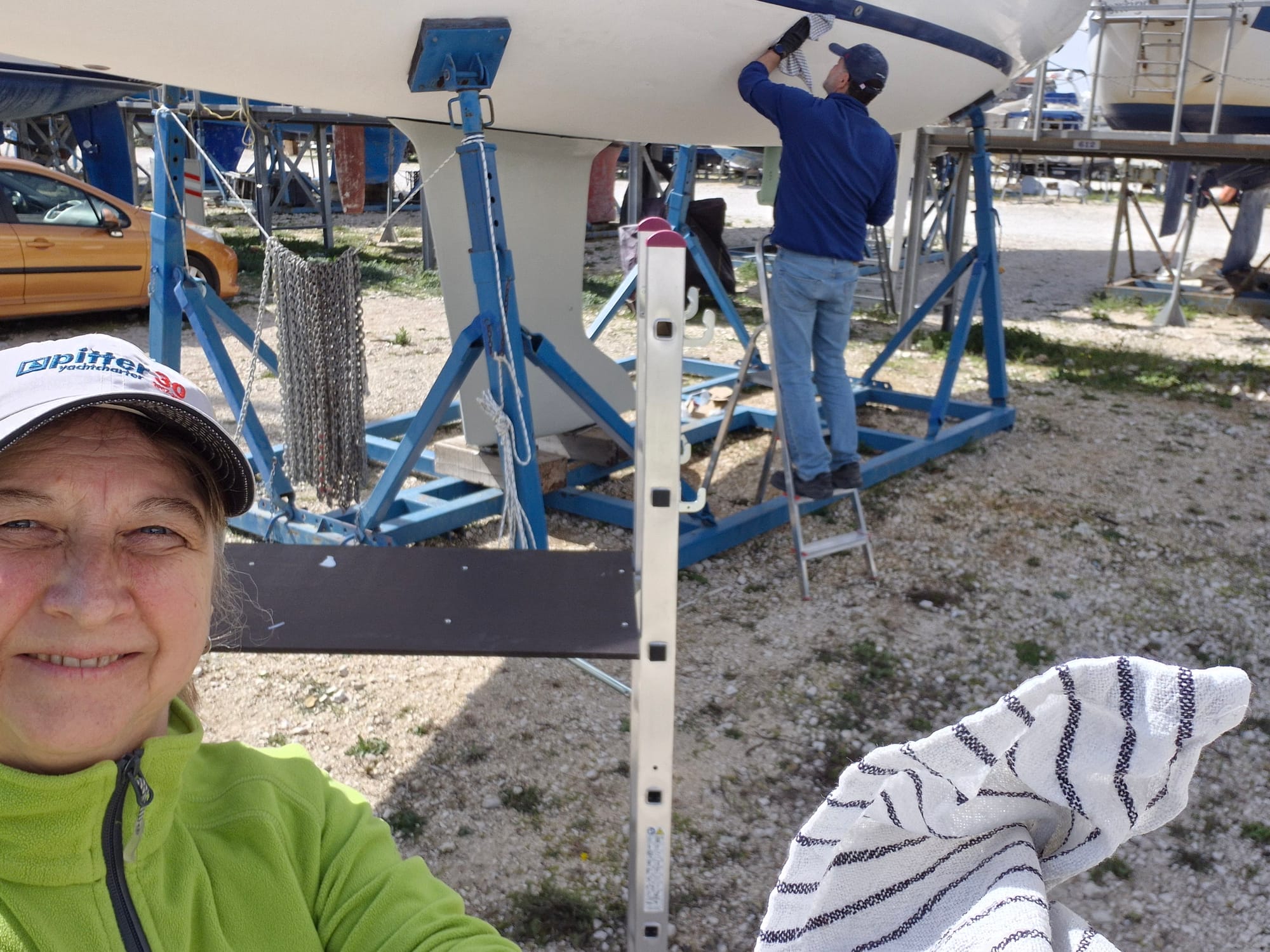 Heute beginnen die Streicharbeiten. Insgesamt müssen wir 7 Schichten auftragen, die je eine Trocknungszeit von 4 Stunden haben. 5 Schichten Primer und abschließend noch 2 Schichten Antifouling.