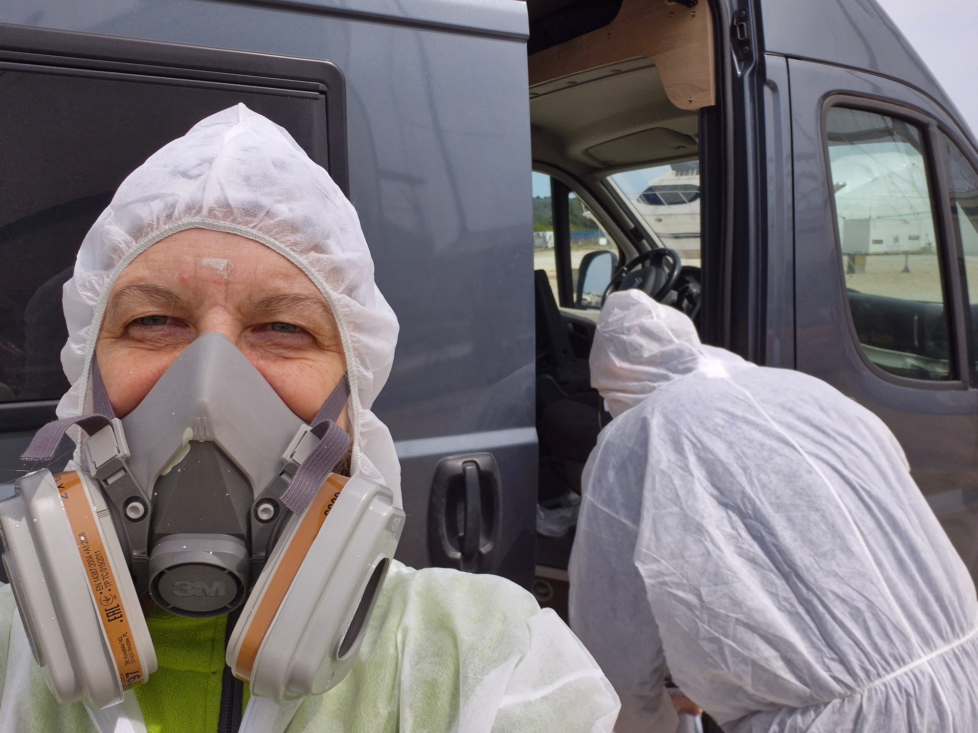 Und dann geht's los: Schutzanzug an, Schutzbrille auf...