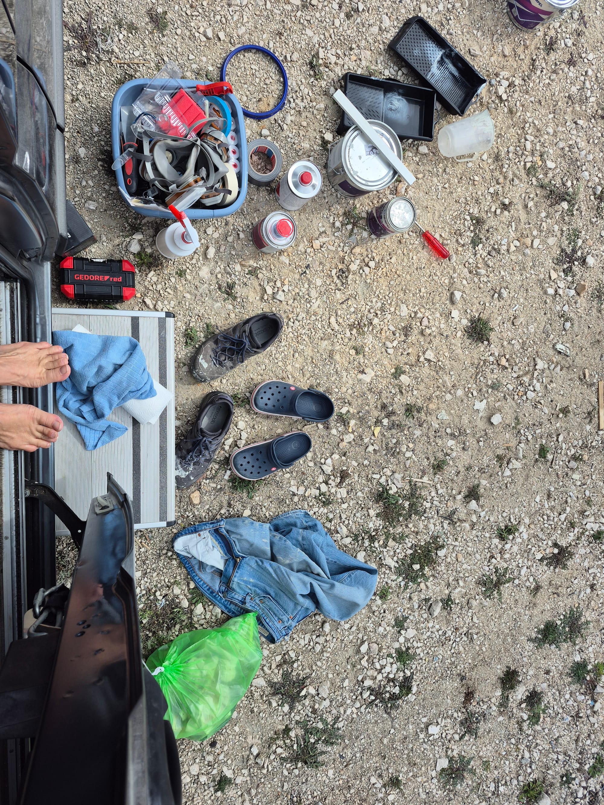 Gegen 11:00 machen wir uns wieder an die Arbeit. Der Wasserpass wird abgeklebt...