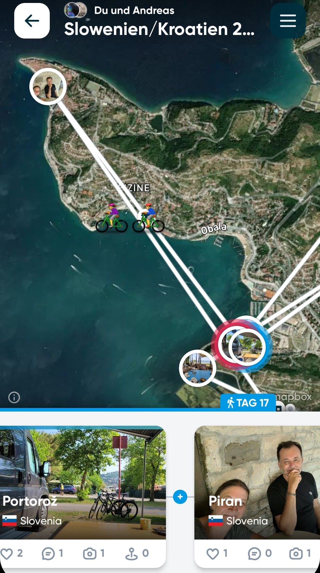 Gegen 18:00 schwingen wir uns auf unsere Räder und fahren die schon oft gefahrene Route am Strand und der Touristenpromenade von Portorož und Piran entlang. Diesmal sind wir aber nicht so dick angezogen wie sonst und es sind auch viel mehr Leute unterwegs, wir müssen immer wieder ausweichen.