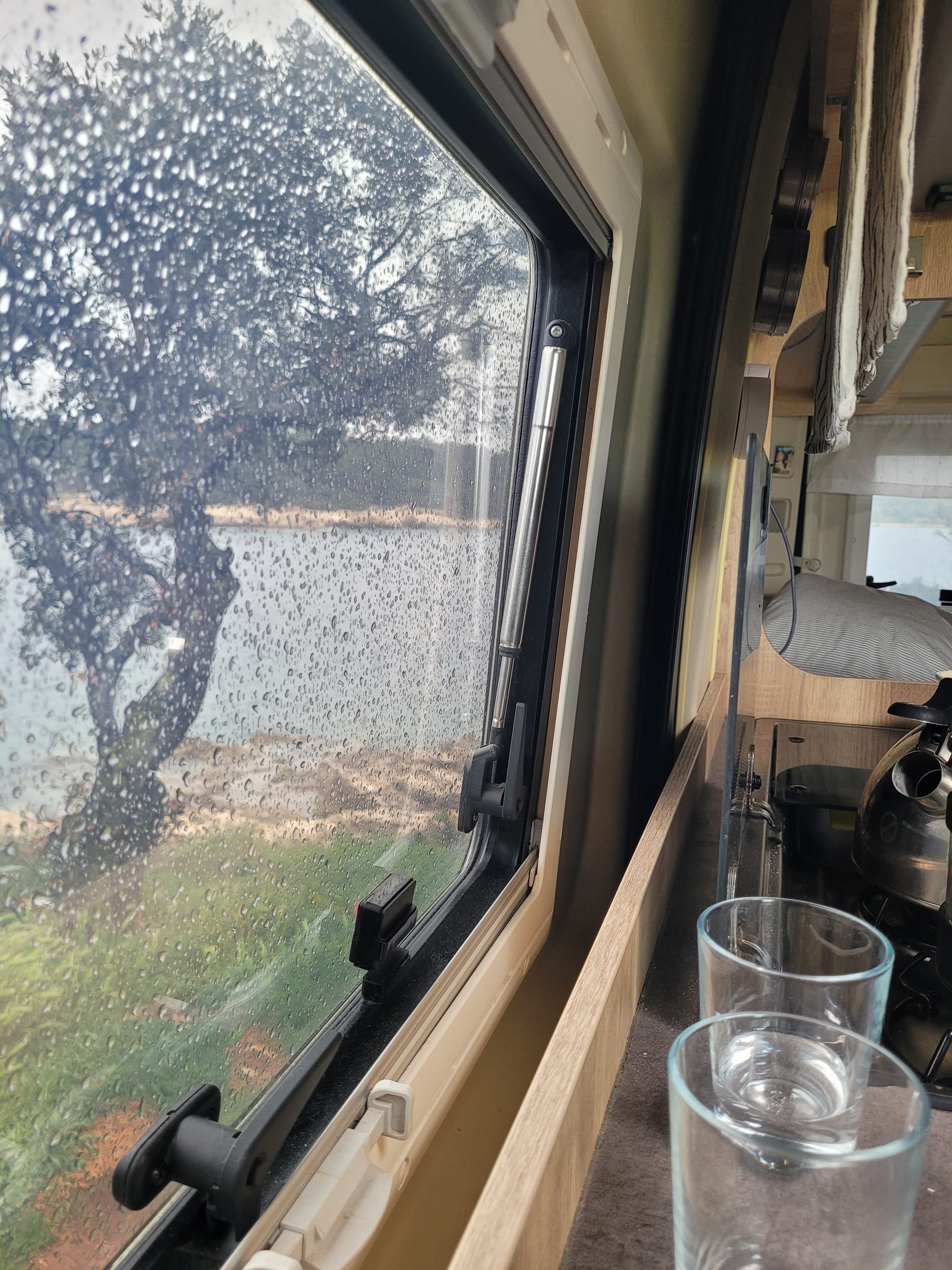 ...doch während der Kaffee in der French Press zieht, beginnt es zu tröpfeln und dann regnet es gleich einmal heftig.
