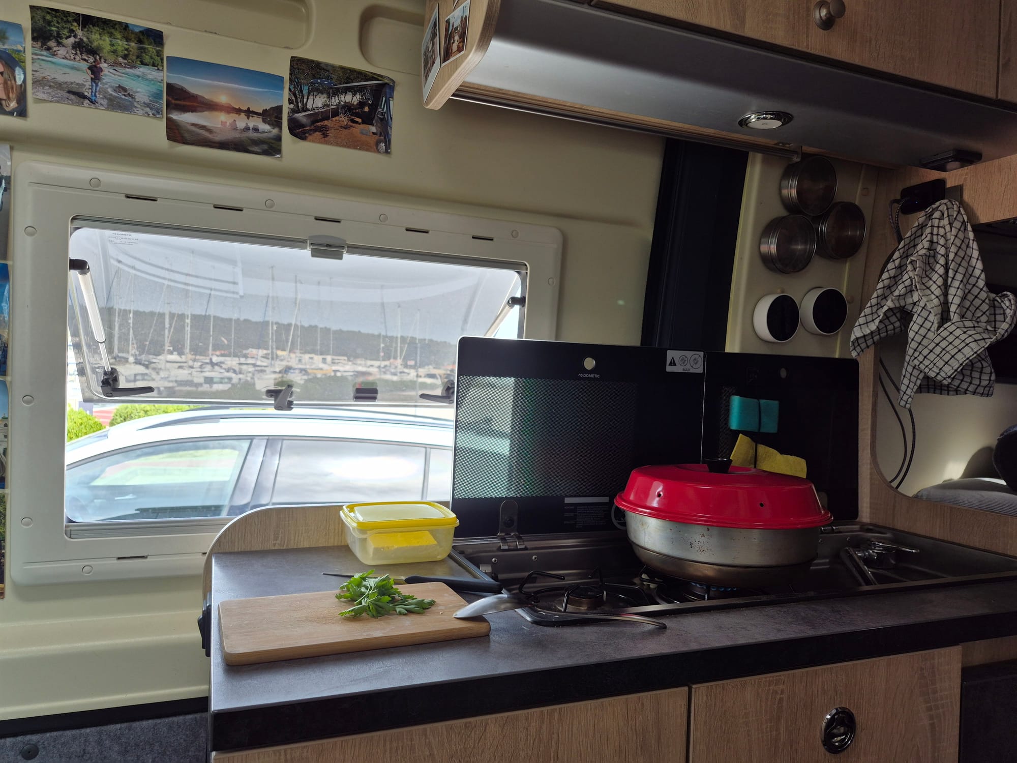 Dann verziehen wir uns in den Luigi, der wieder einmal heftig von den Böen geschüttelt wird. Heute ist uns langweilig. Um mich zu beschäftigen koche ich Bratartoffeln.