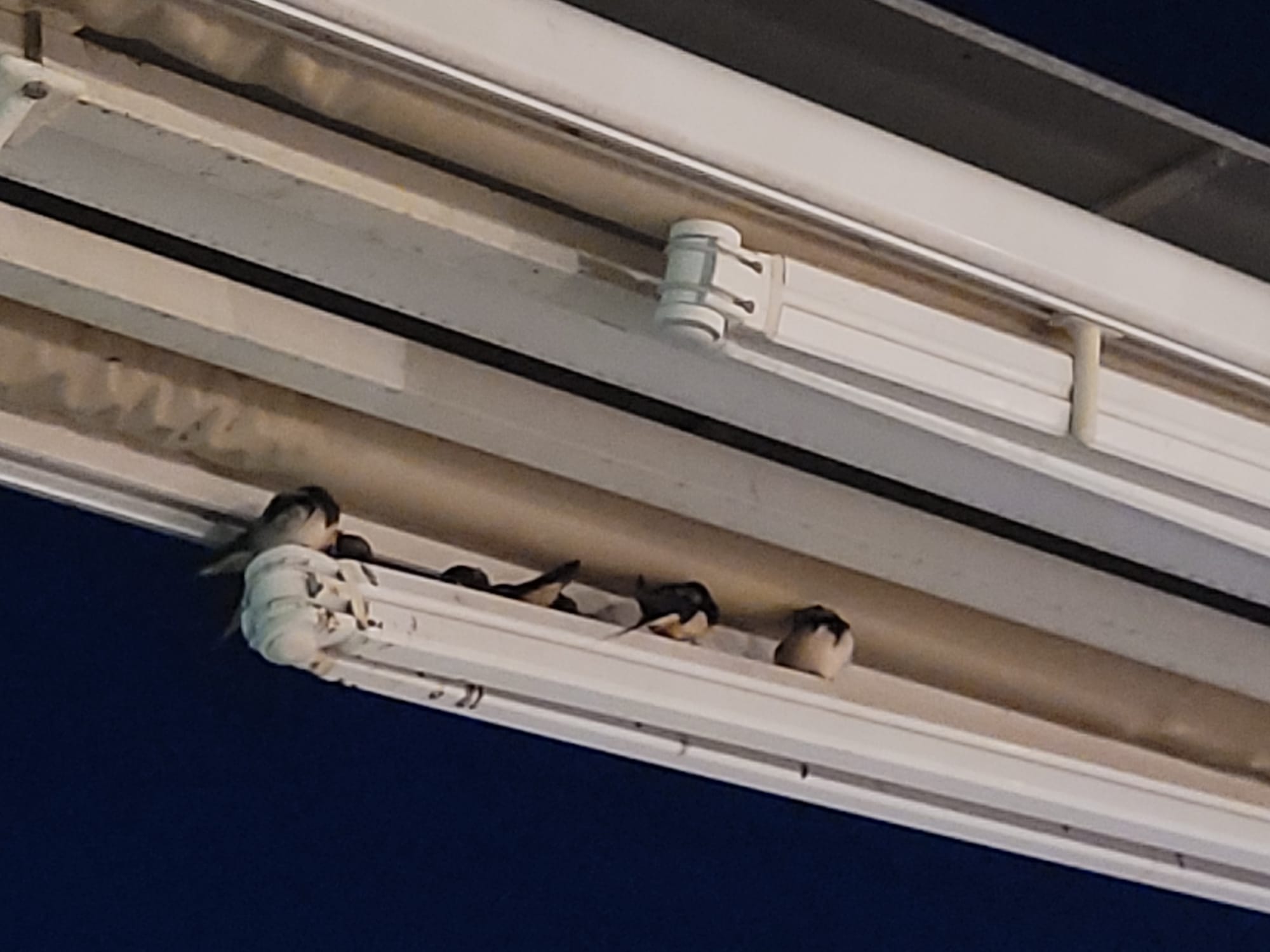 Sechs Vögel vom Schalbenschwarm haben ihren Platz in der Markise gefunden,...