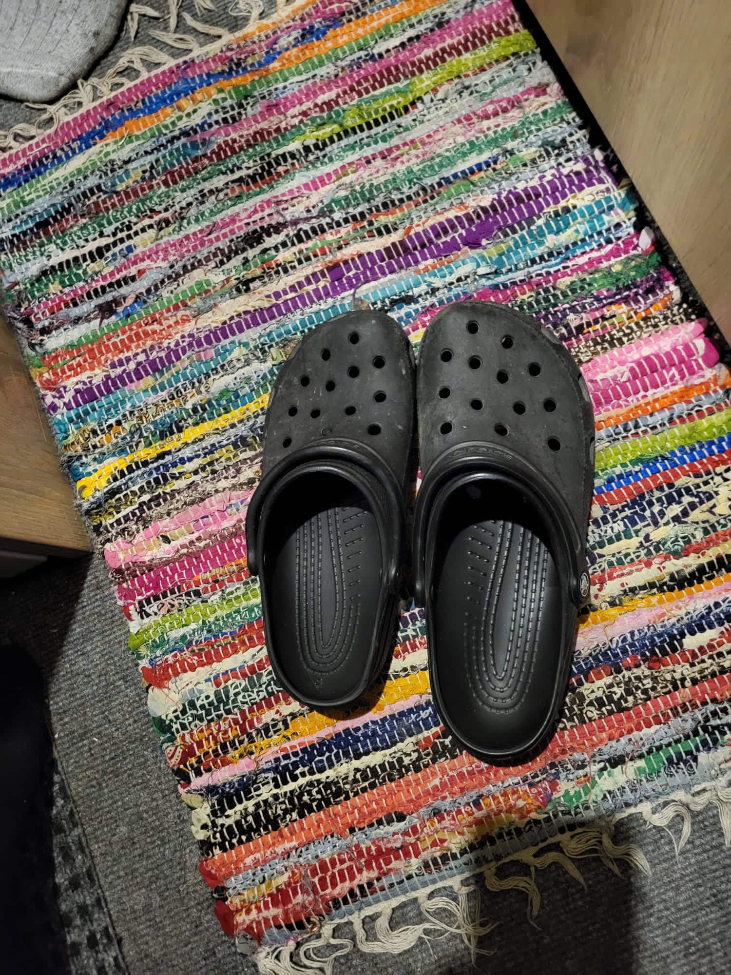 Zu Hause hat er wieder zahlreiche Umbauarbeiten im Luigi getätigt und dabei war die Heizung natürlich immer an und der eine Croc war zu nahe beim Heizungsauslass und ist geschrumpft. 😄🤣😄