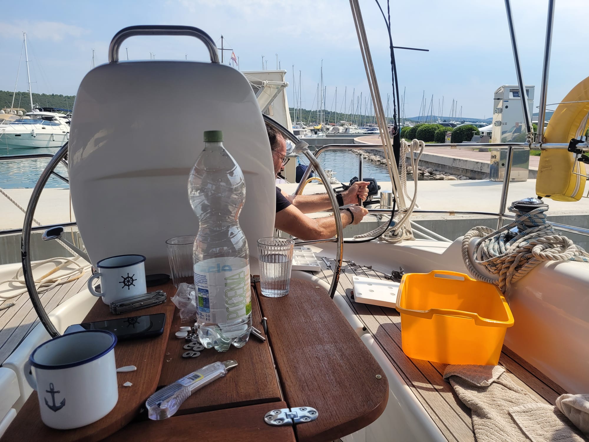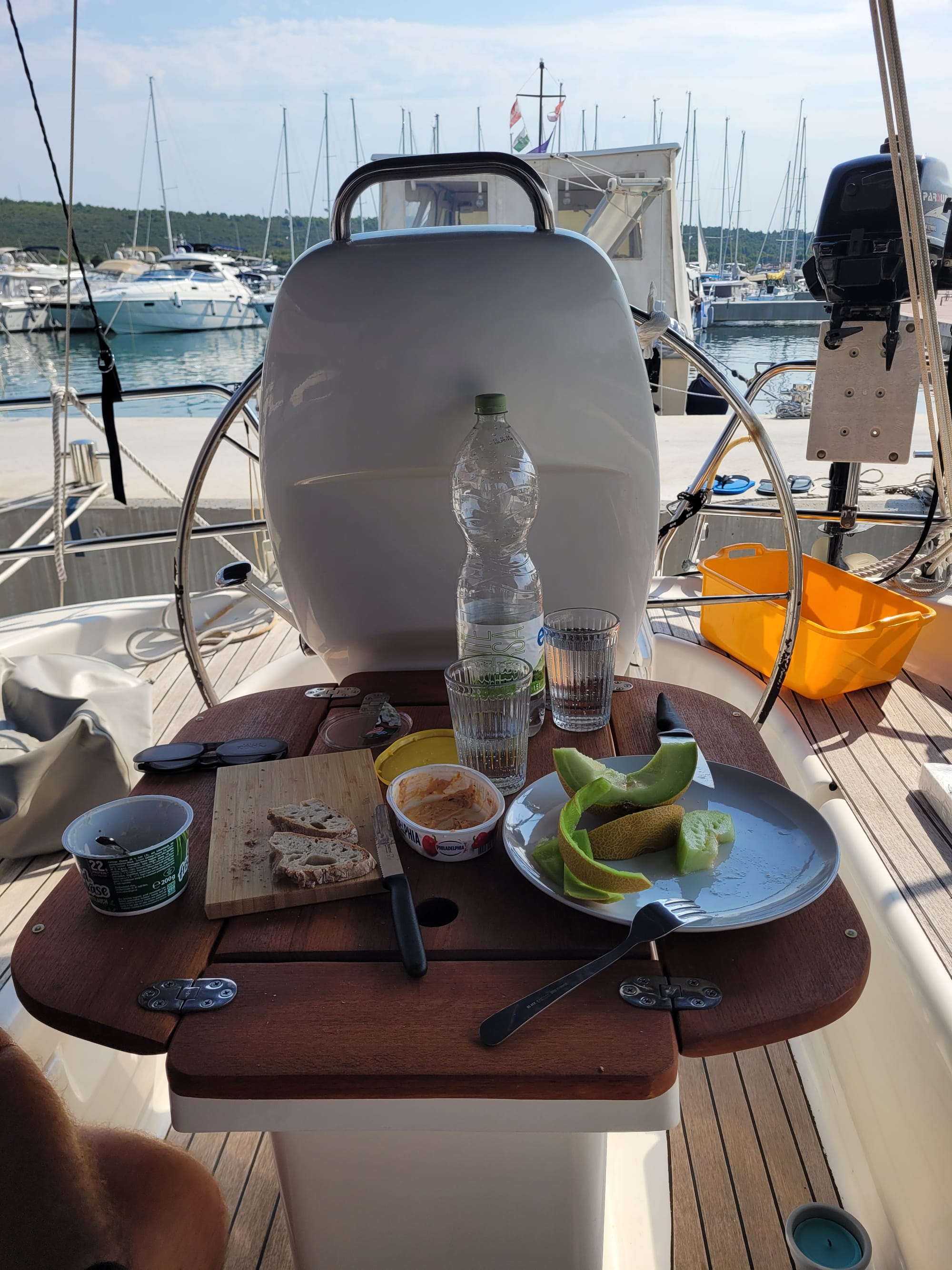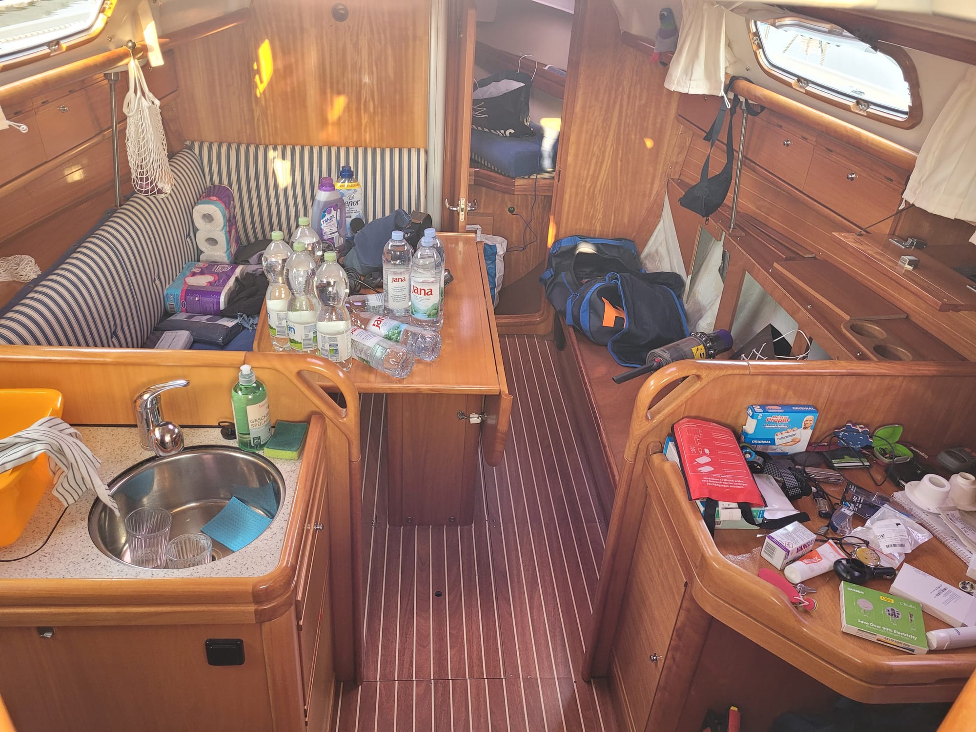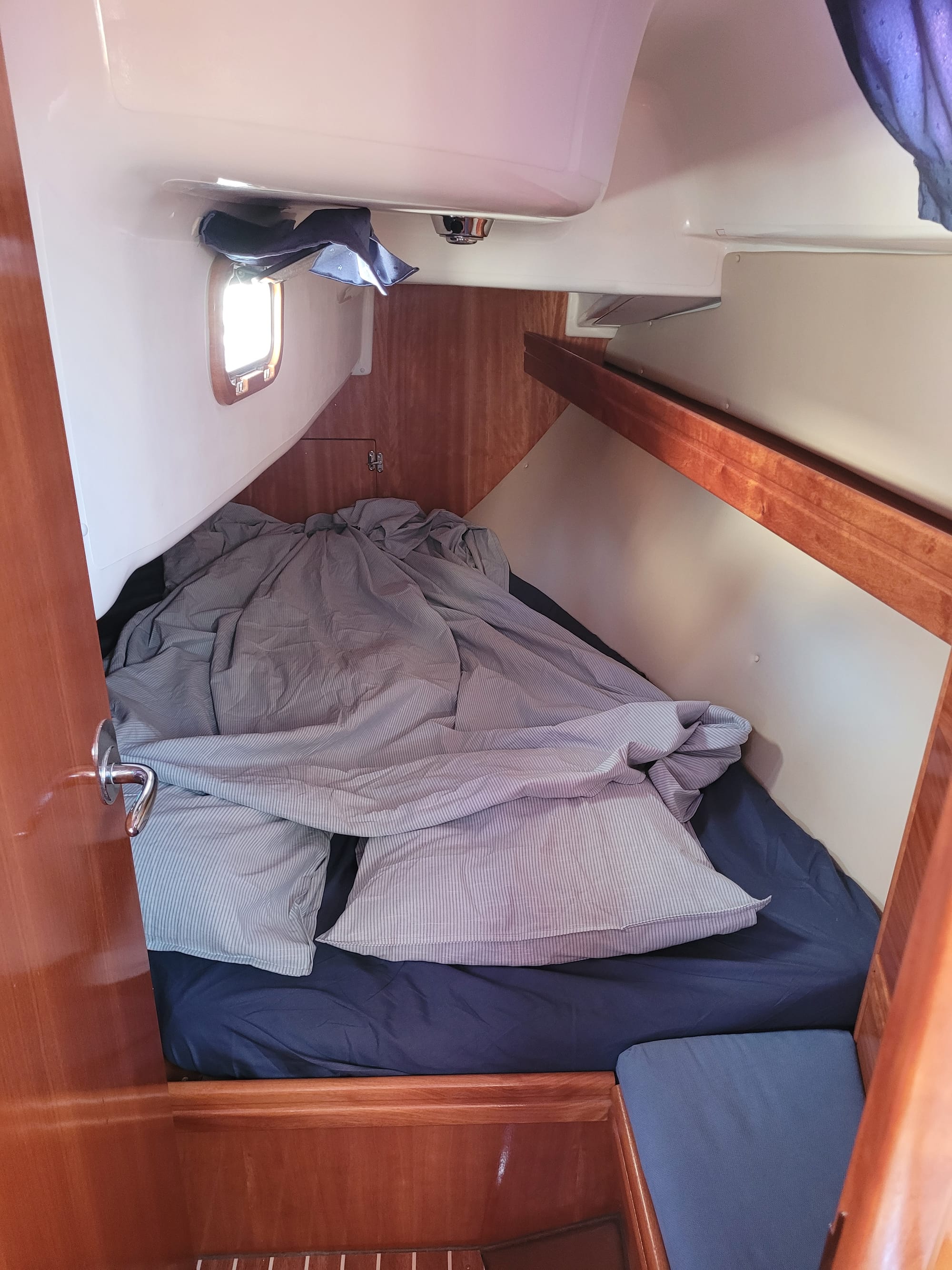 Wir haben sehr gut geschlafen. Das liegt einmal daran, dass wir am Schiff immer austariert liegen, im Gegensatz zum Luigi. Zum anderen waren wir so erschöpft vom Arbeiten, dass wir total schnell ein- und total fest ge-schlafen haben. Die Heckkabine ist außerdem wirklich sehr geräumig.