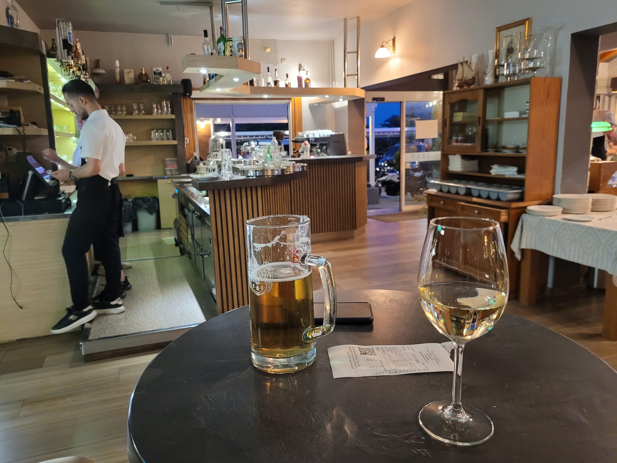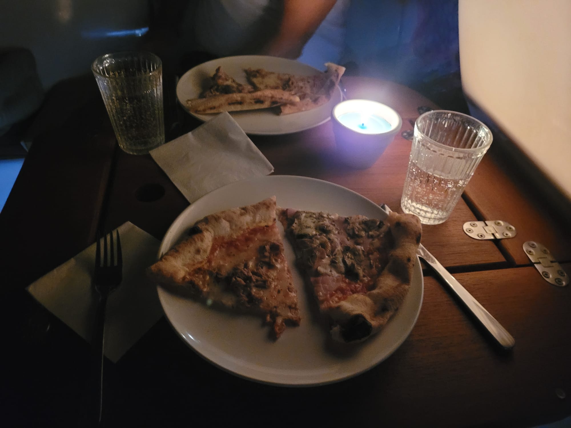 Zum Abendessen gibt's heute Pizza, die uns bekannte vom Hotel Joso, mit Selbstabholung. Das Lokal ist total voll, 20 Minuten dauert unsere Pizza, wird uns gesagt - da brauchen wir eine Runde für die Wartezeit.