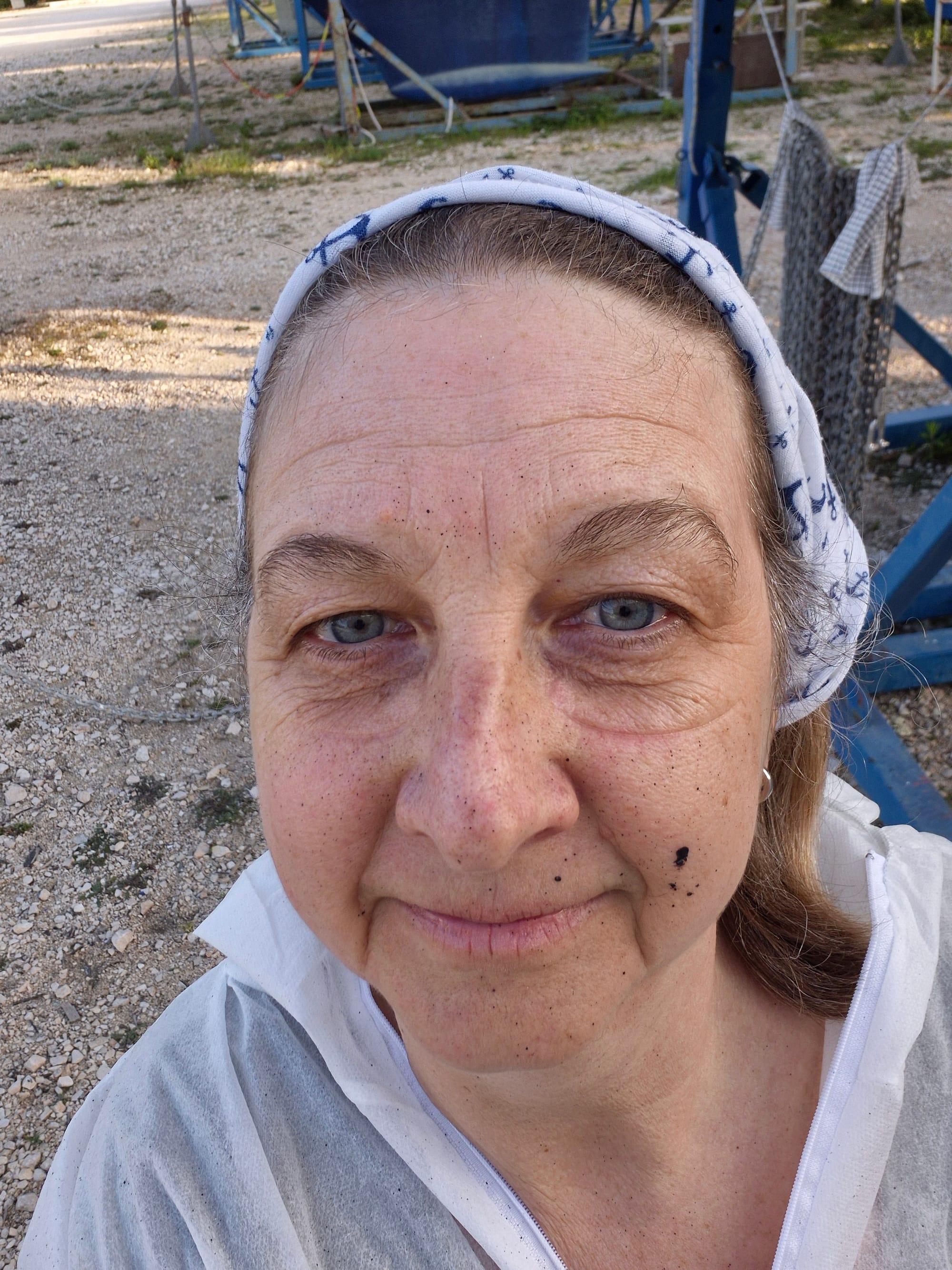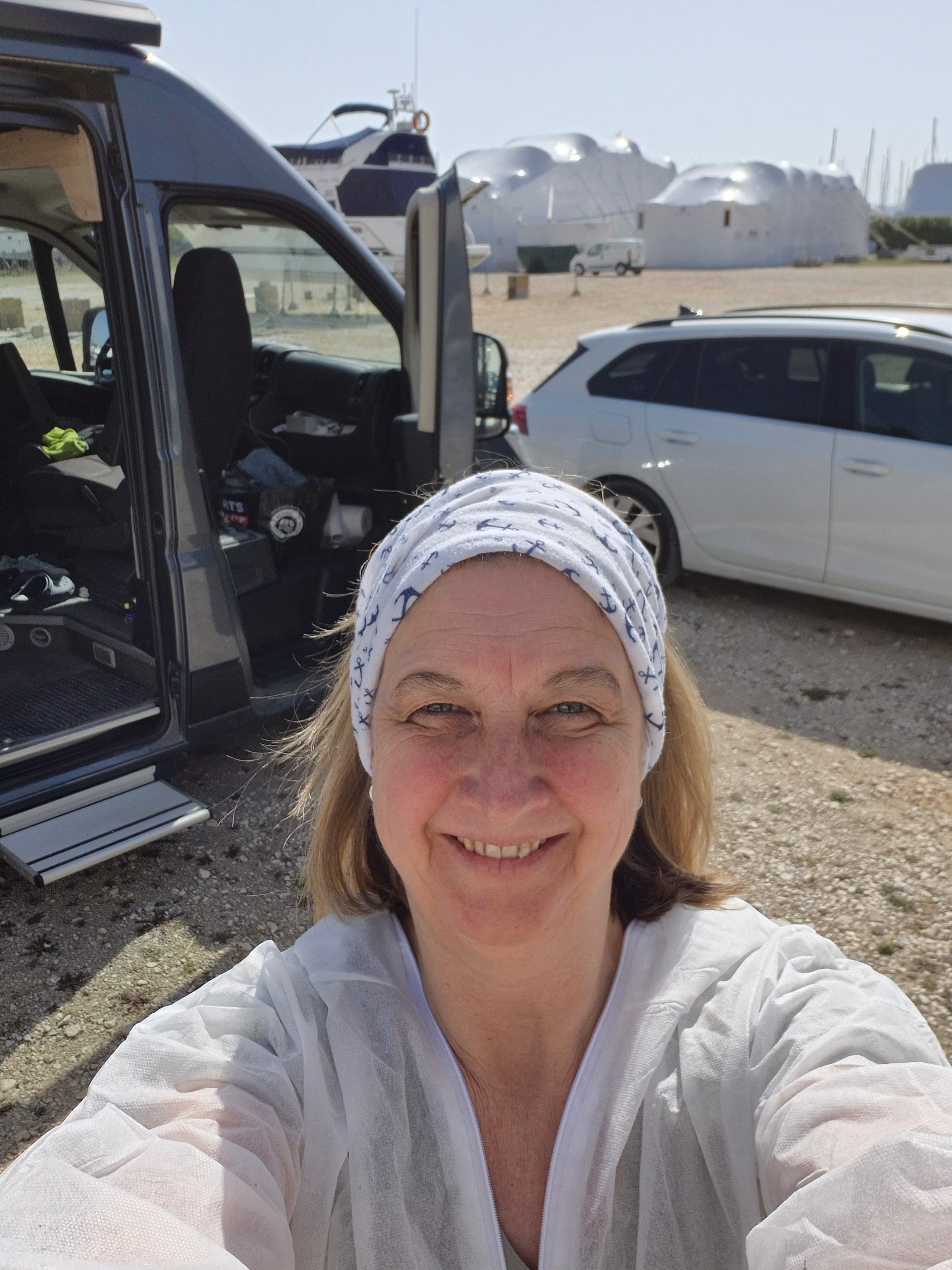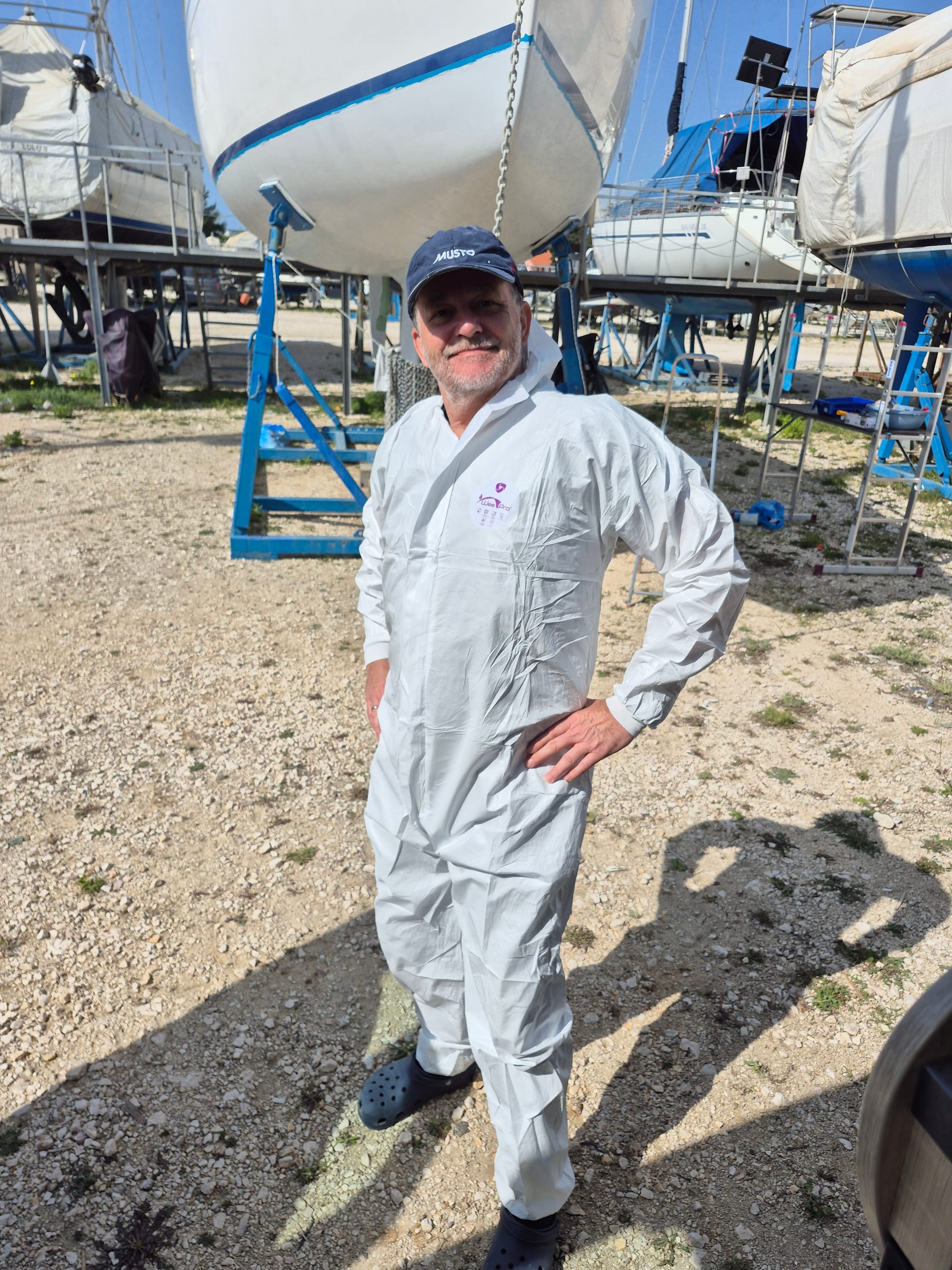 Wir werfen uns in die Arbeitskluft, Andreas hat einen neuen Anzug vom Nautic Shop bekommen.