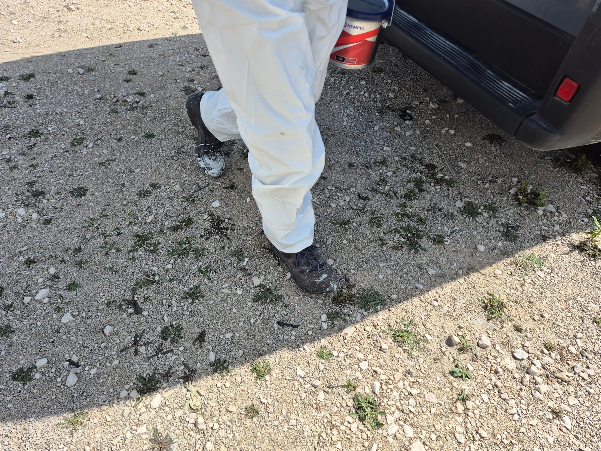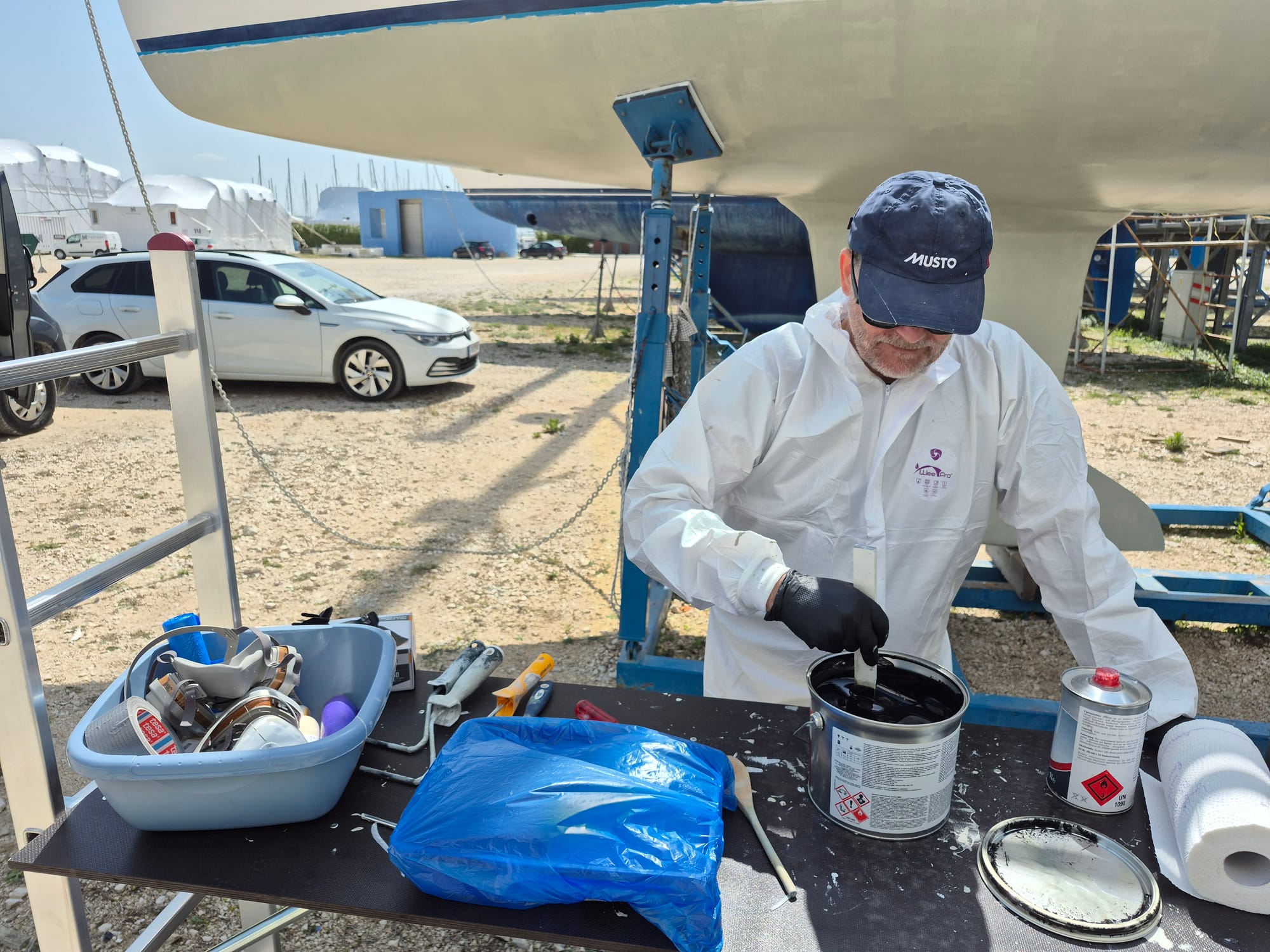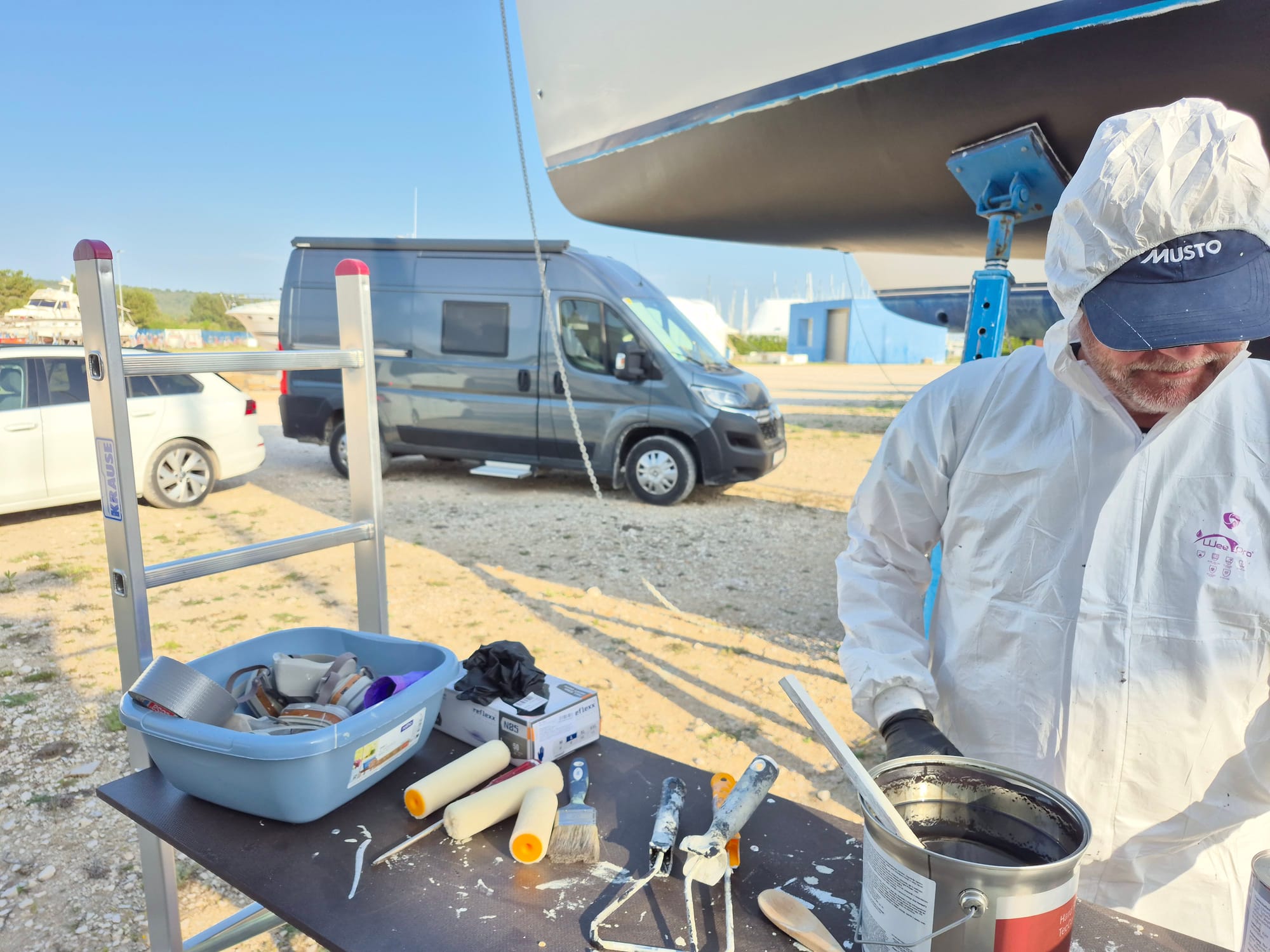 Ohne Trocknungszeit wird jetzt direkt die erste Antifouling Schicht aufgetragen - noch anstrengender. 🥴