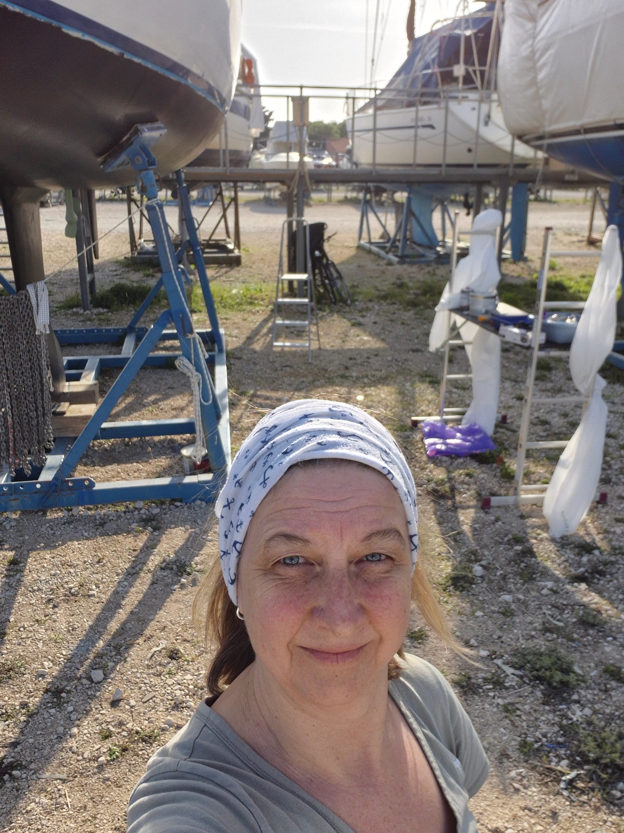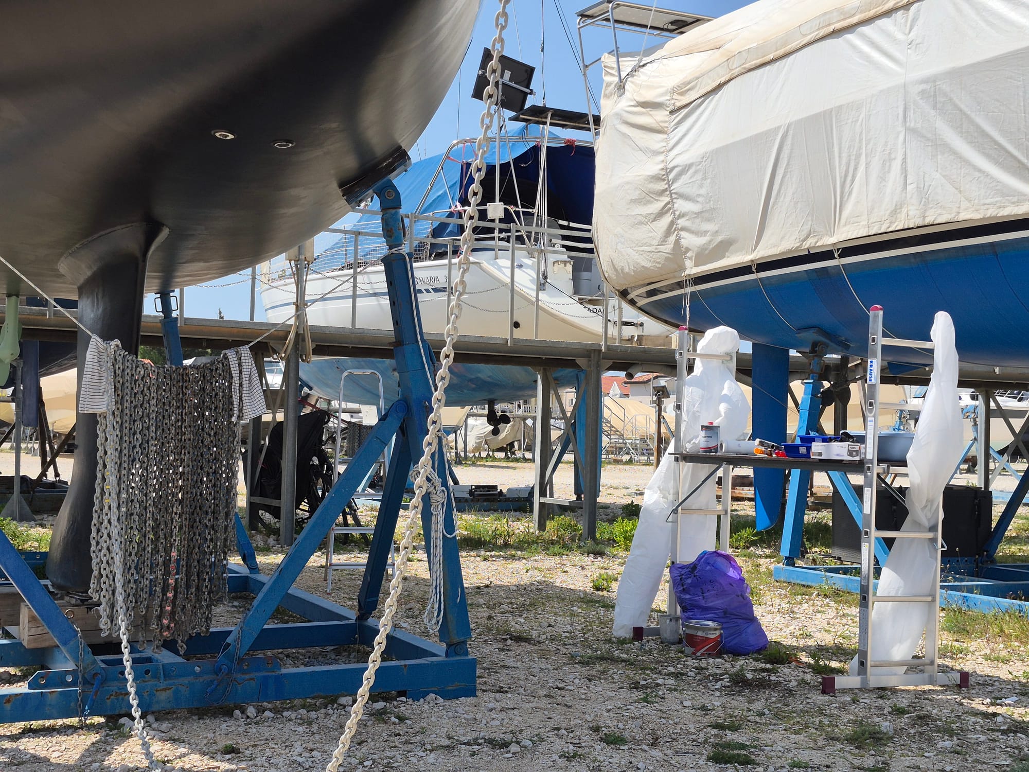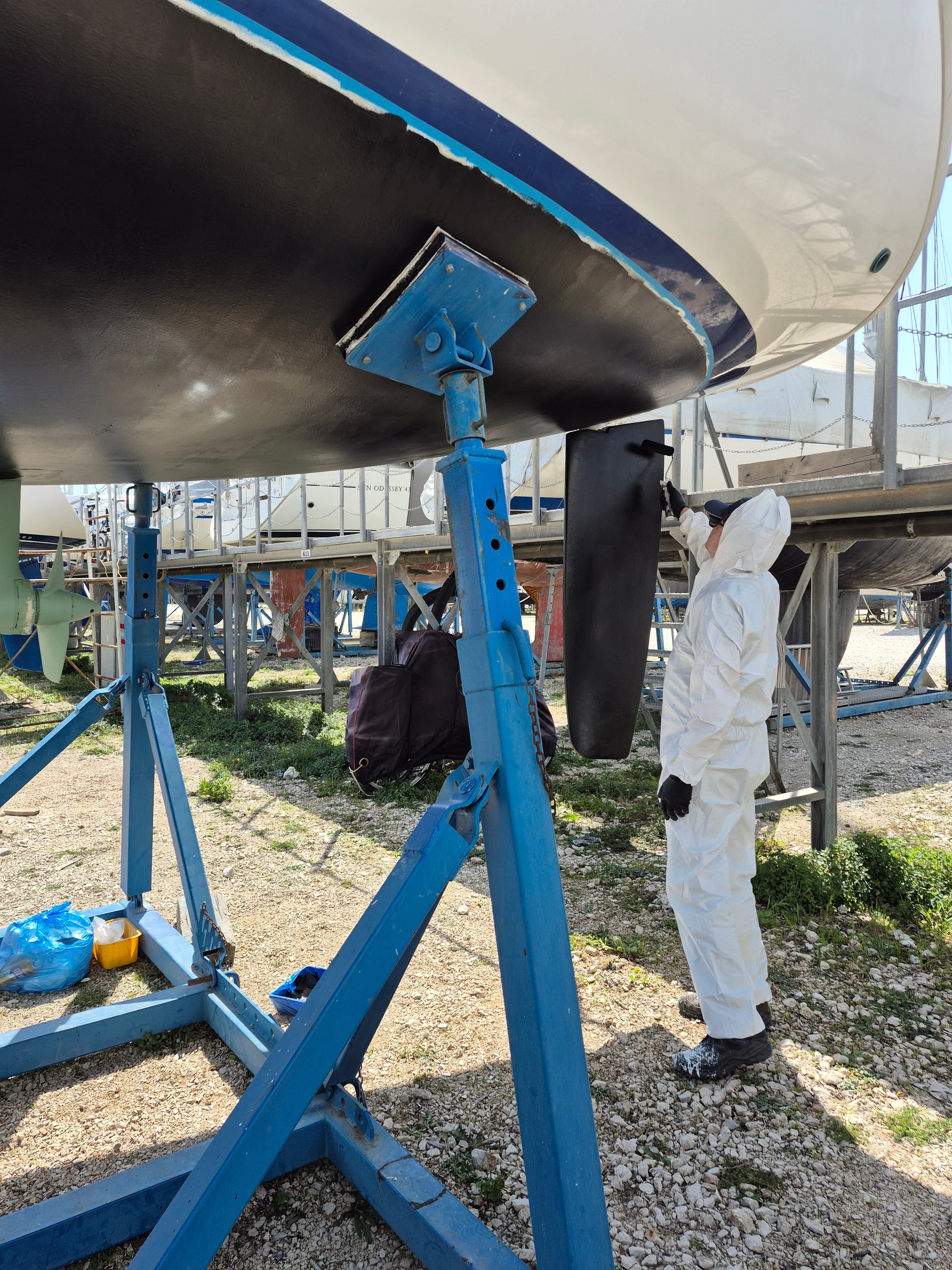 Heute sind drei Schichten geplant. Zuerst die letzte Primerlage in grau und dann noch 2 mal Antifouling.
