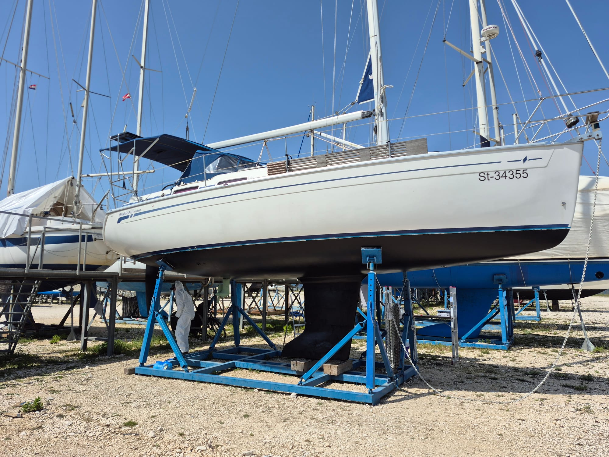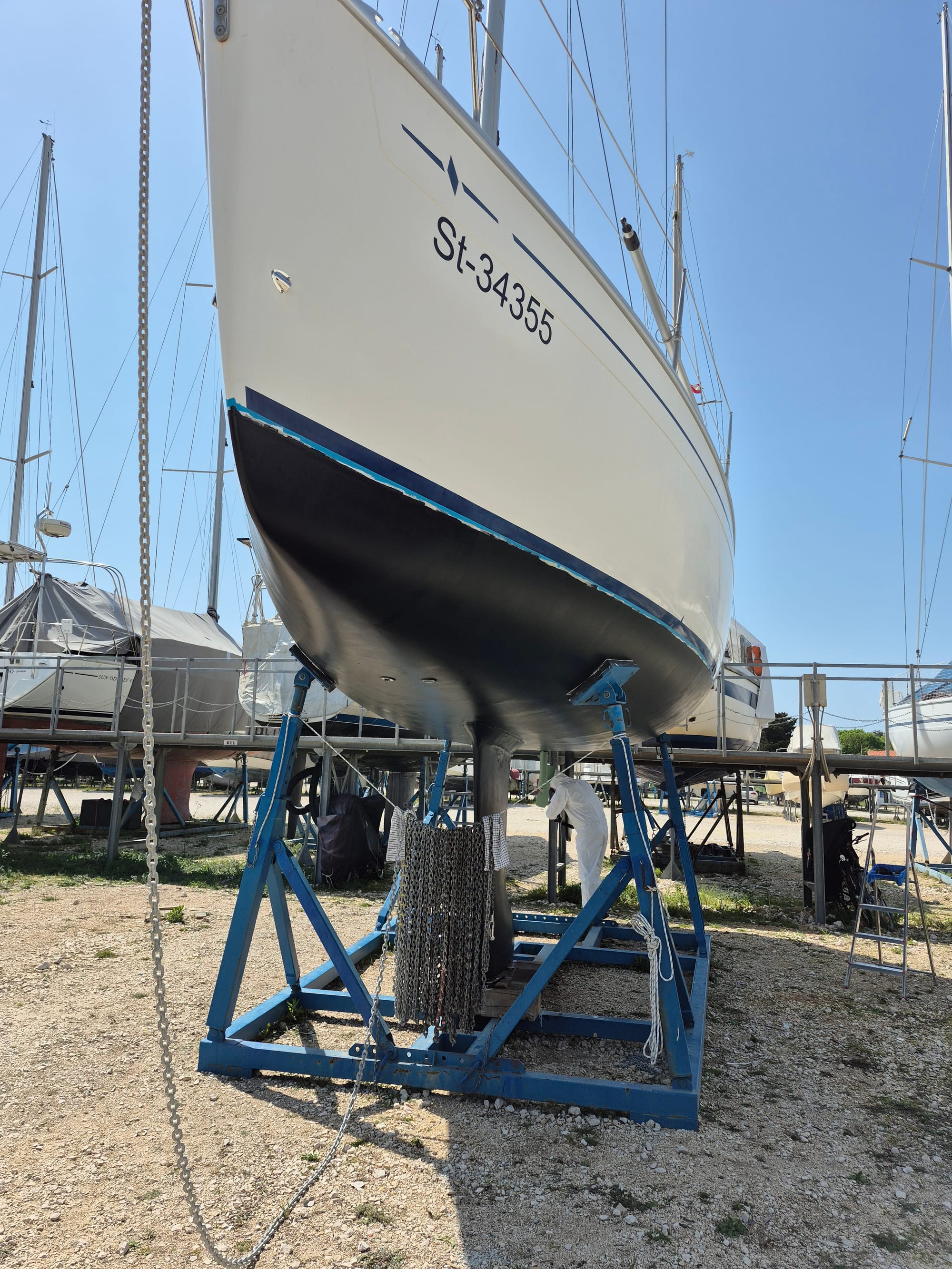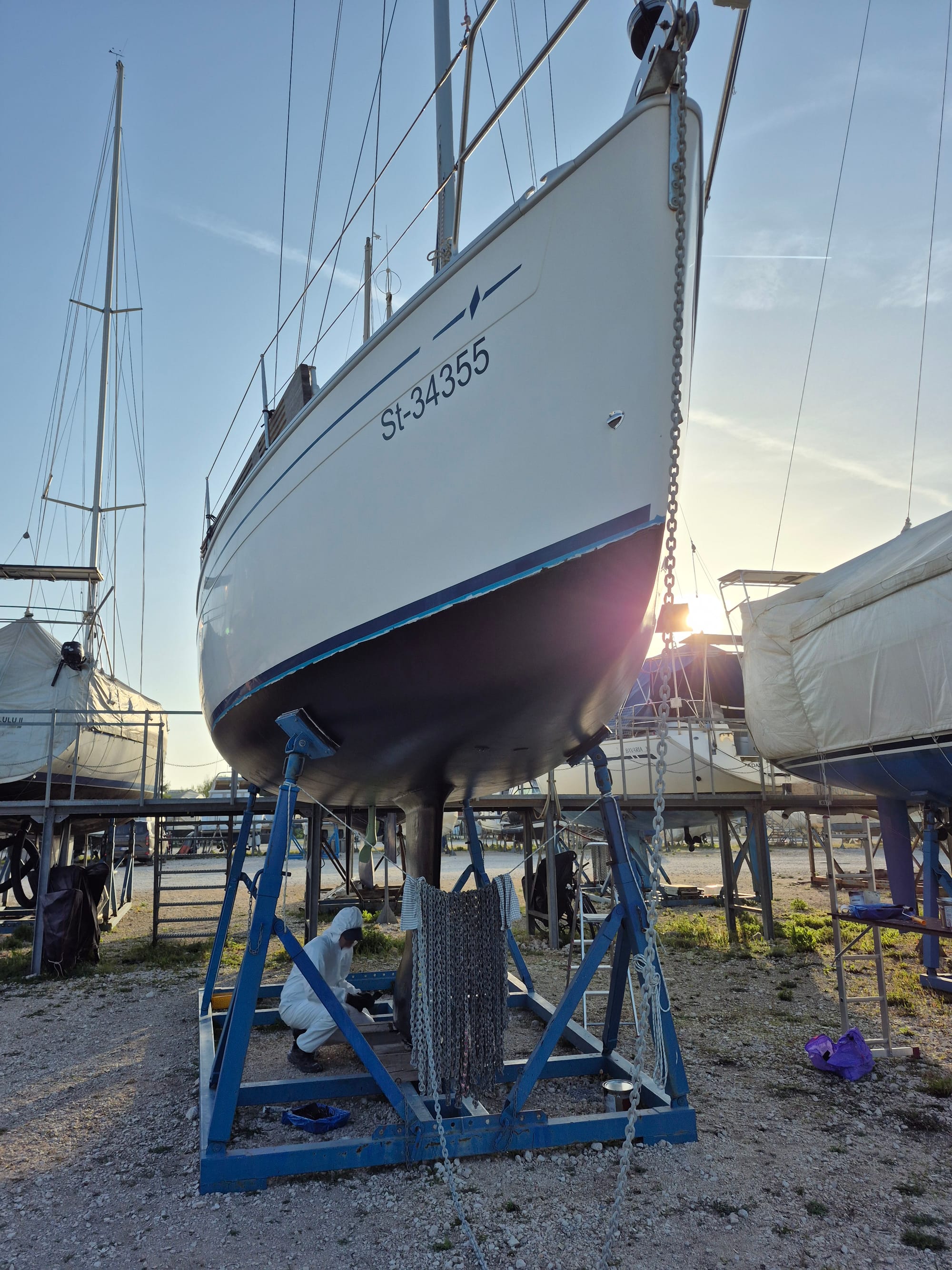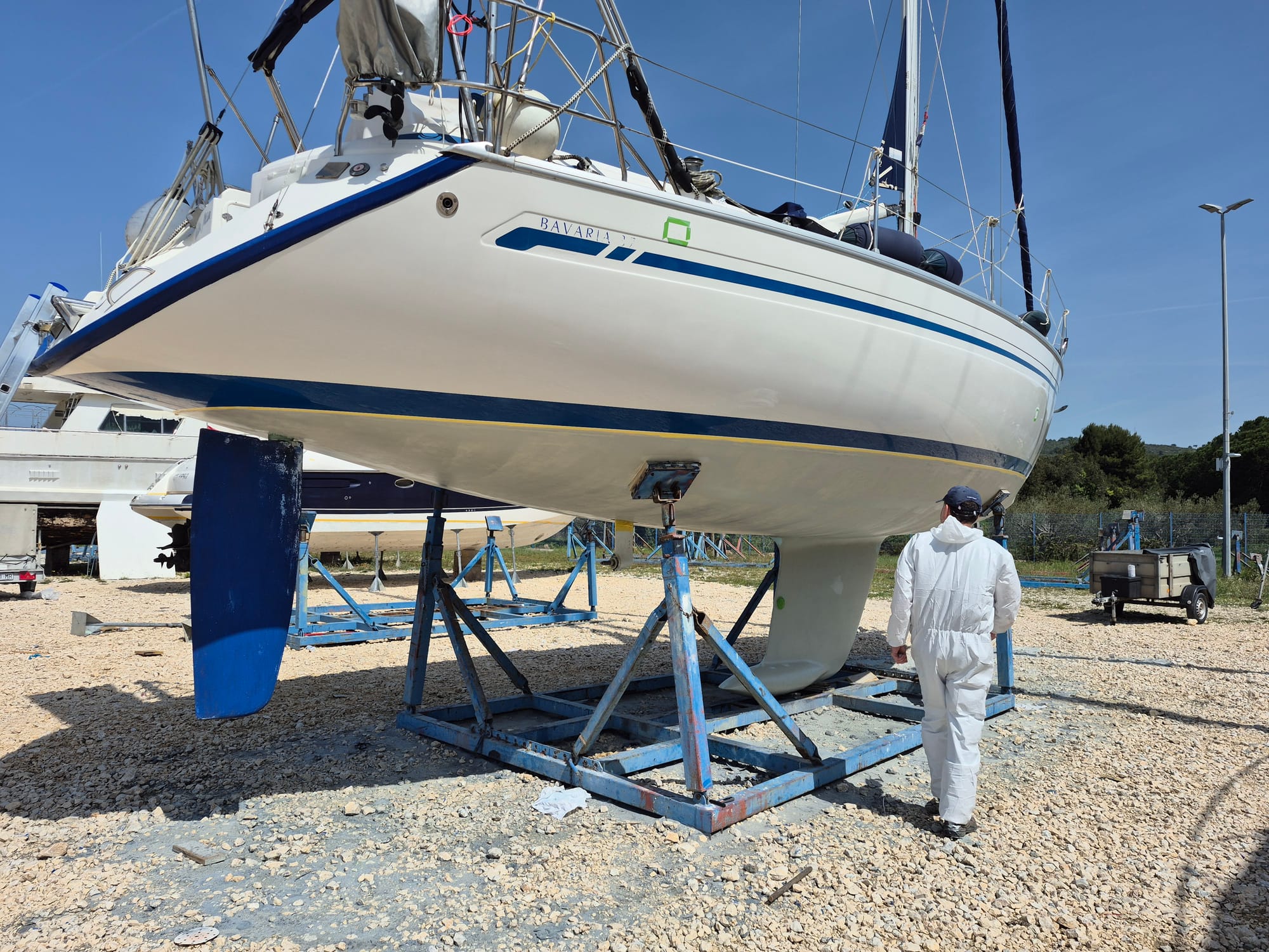 Heute sind drei Schichten geplant. Zuerst die letzte Primerlage in grau und dann noch 2 mal Antifouling.