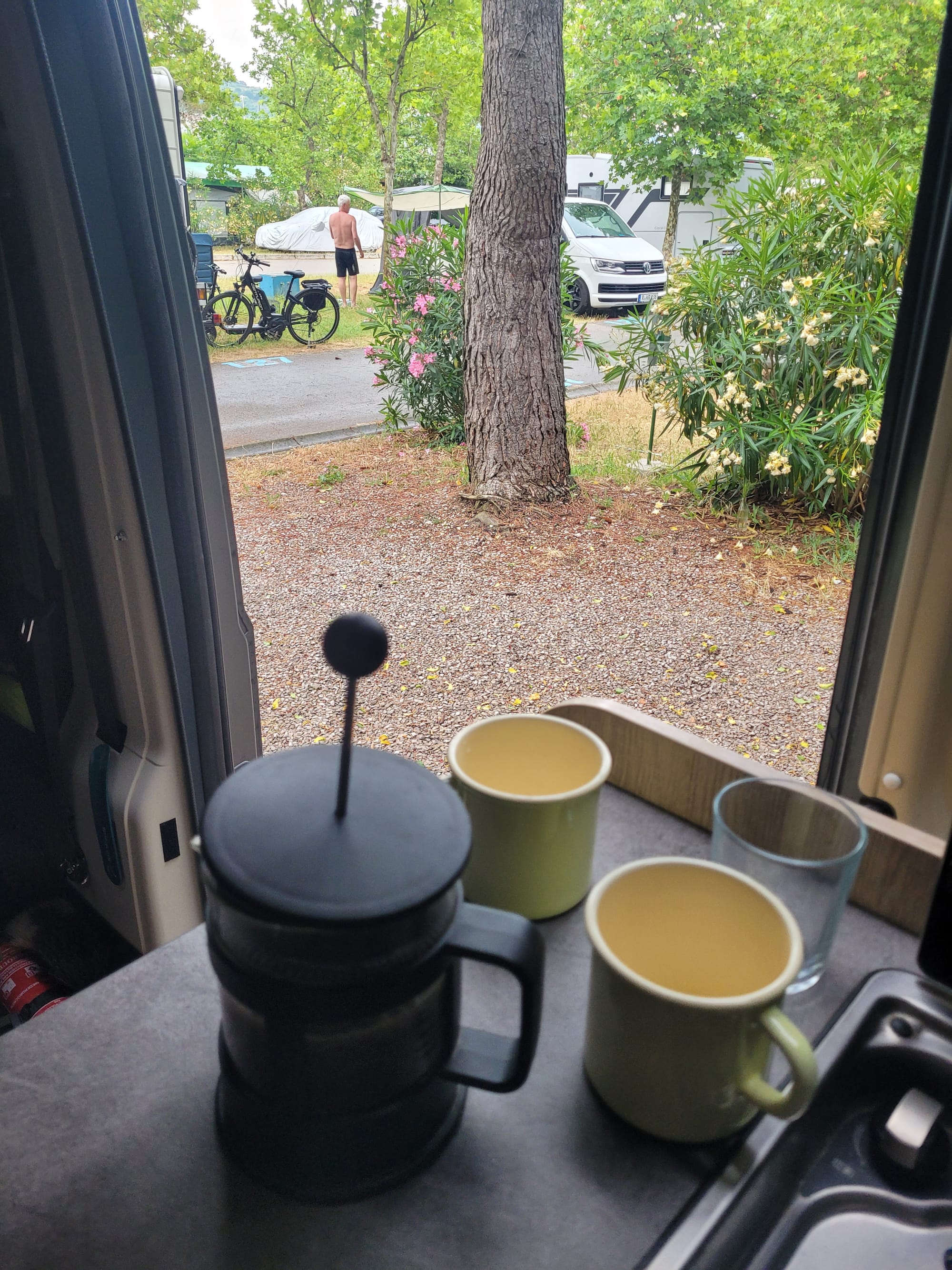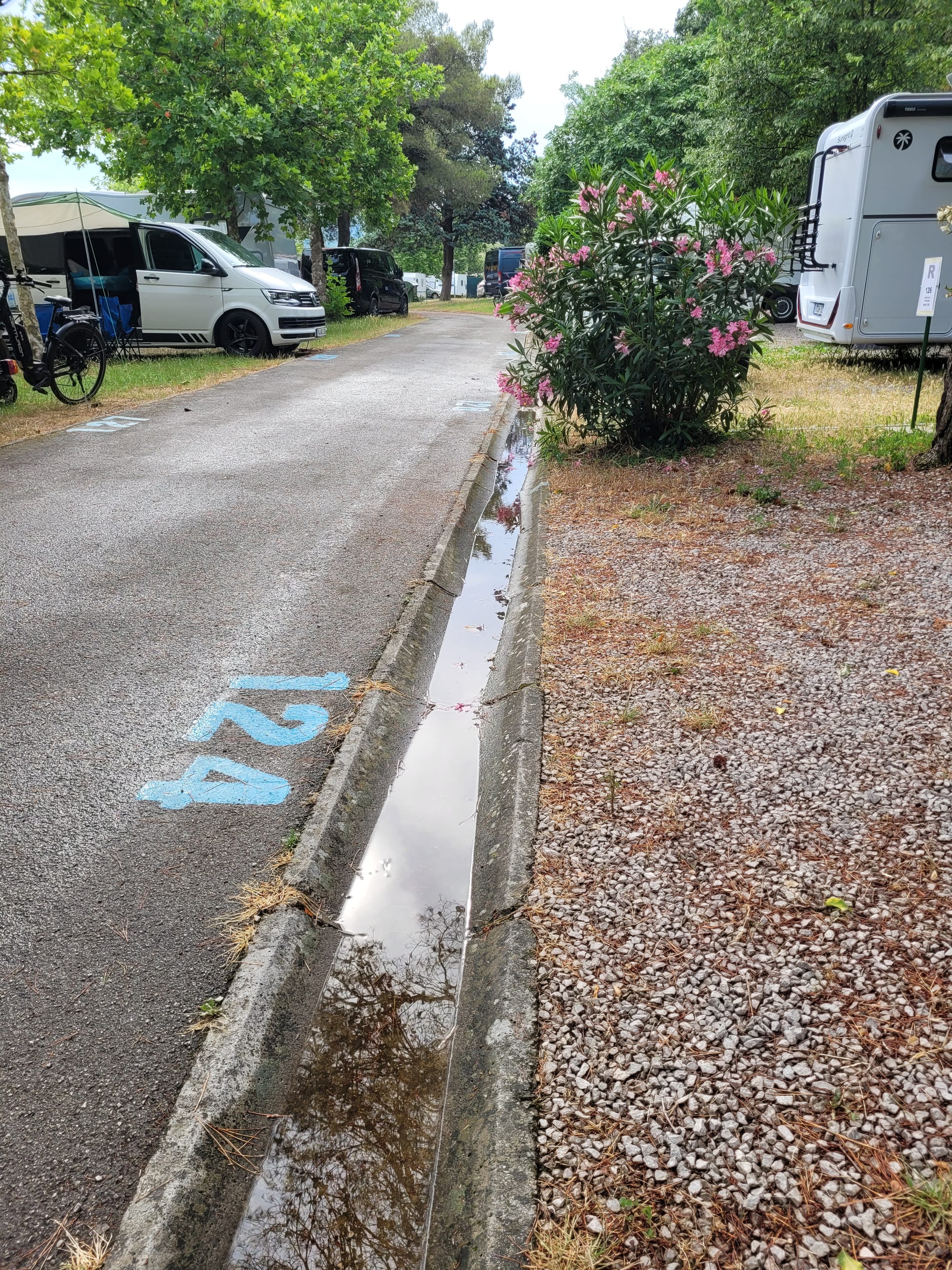 Eine halbe Stunde später ist das Gewitter über uns vorbeigezogen, aber jetzt setzt der Wind ein. Andreas und ich beschließen kurzfristig doch jetzt schon alles einzuräumen. Im Nieselregen und bei böigem Wind säubern und verstauen wir alles, und zurück im Camper beginnt es plötzlich richtig stark zu regnen. Das war Maßarbeit.