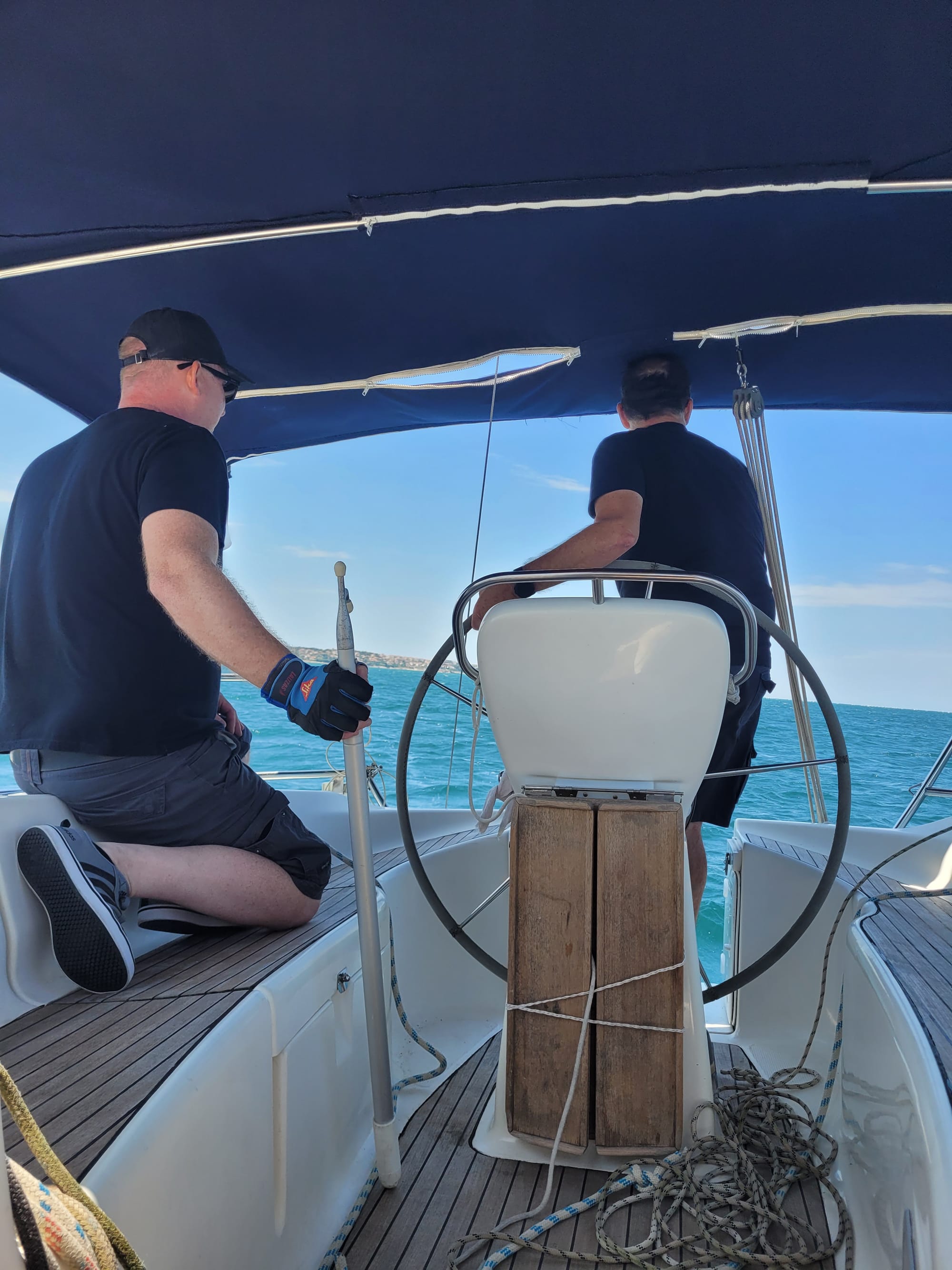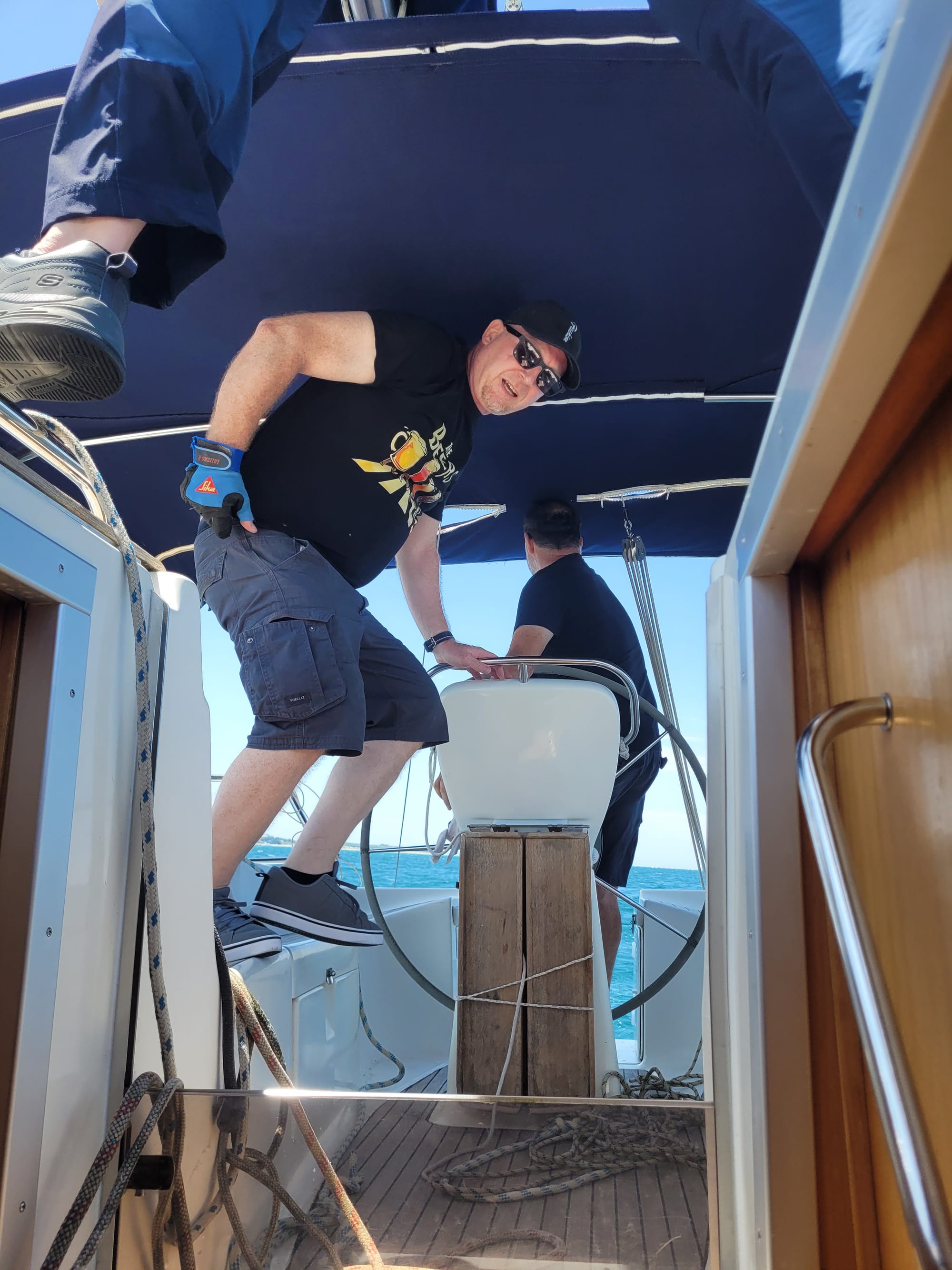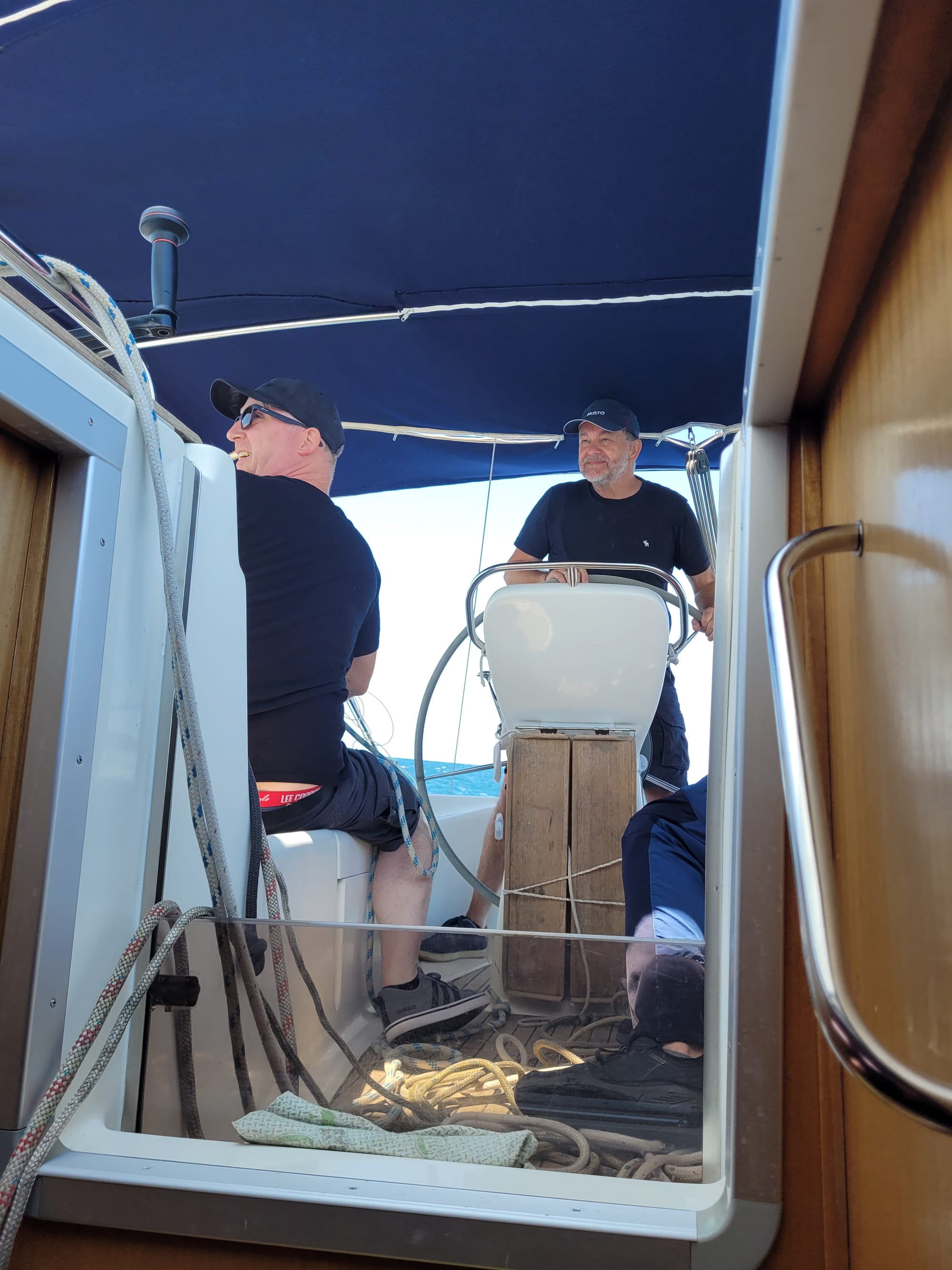 Während der Wartezeit bespricht Andreas einiges mit Dejan und Torsten, am Deck sitzend...