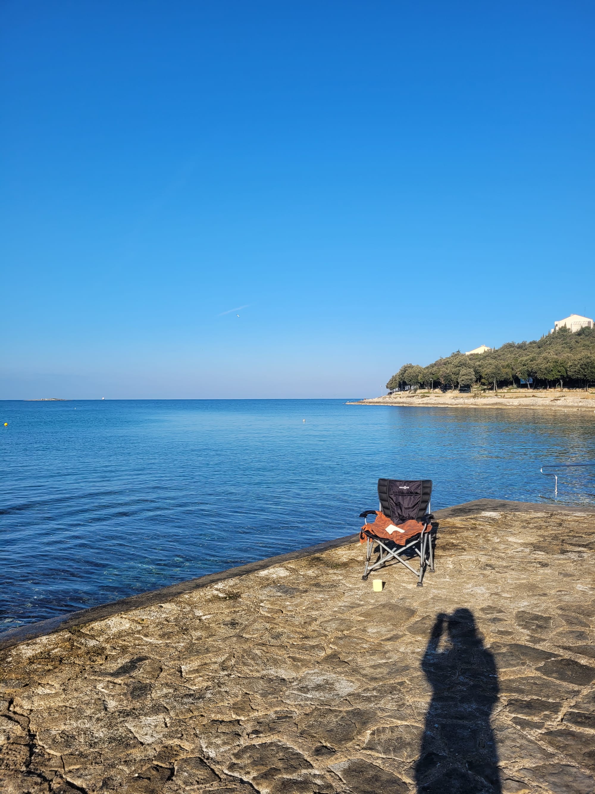 Den Morgenkaffee genieße ich heute in der Sonne am Meer. Ich trage meinen Sessel an den Strand...