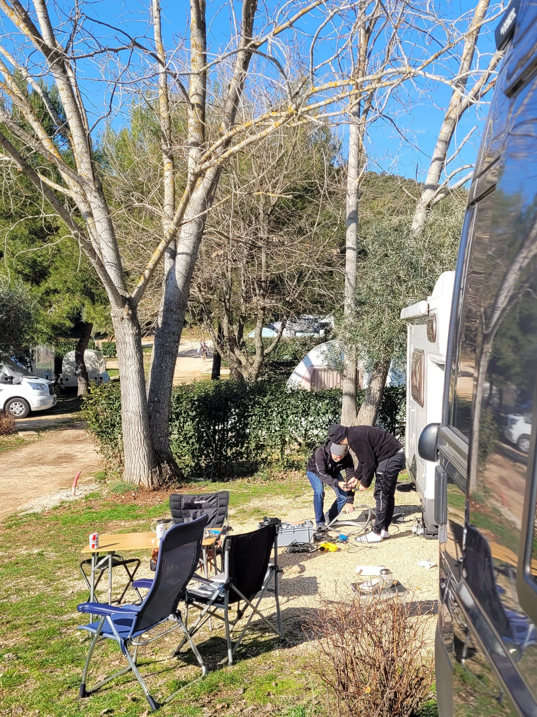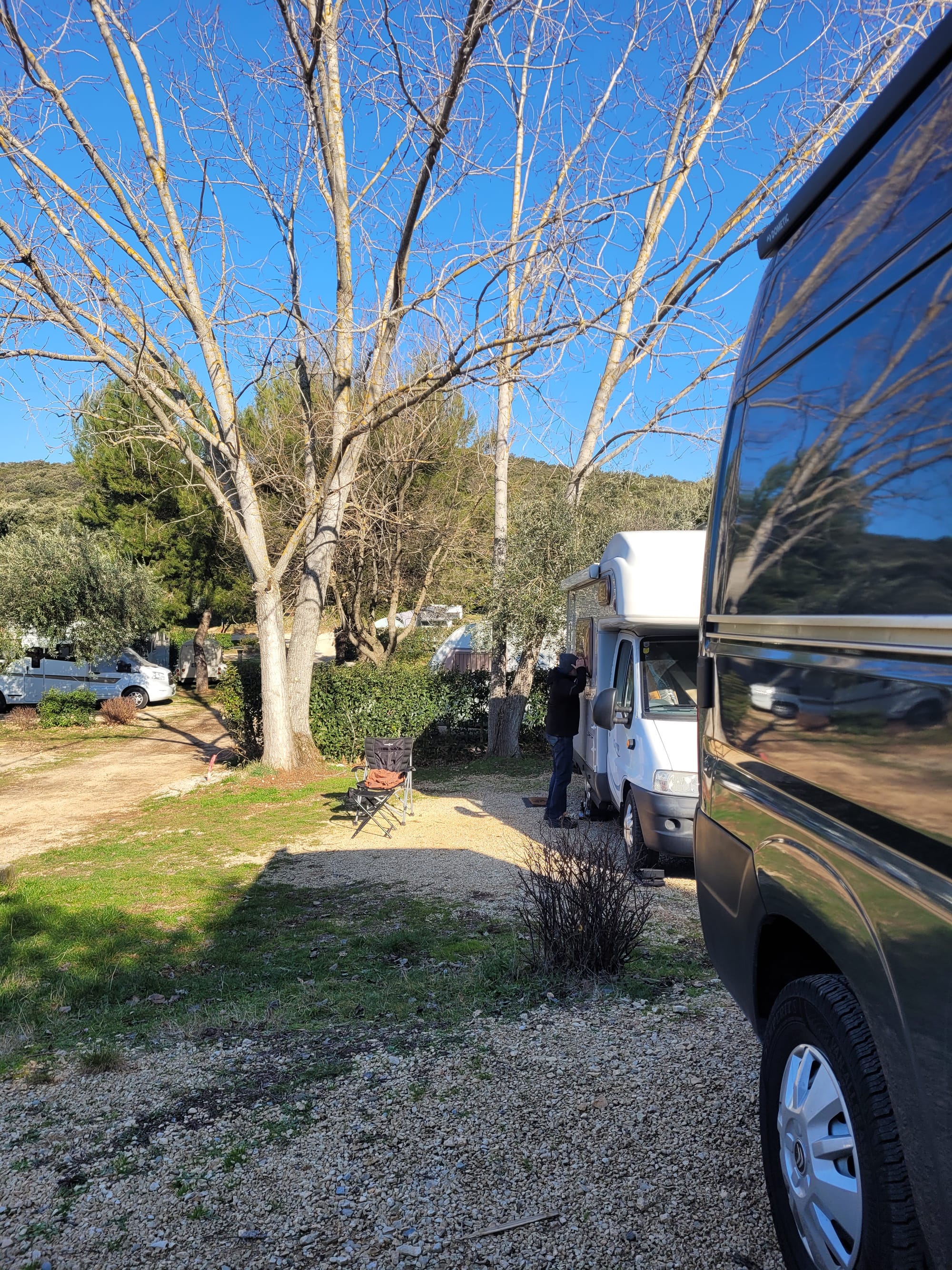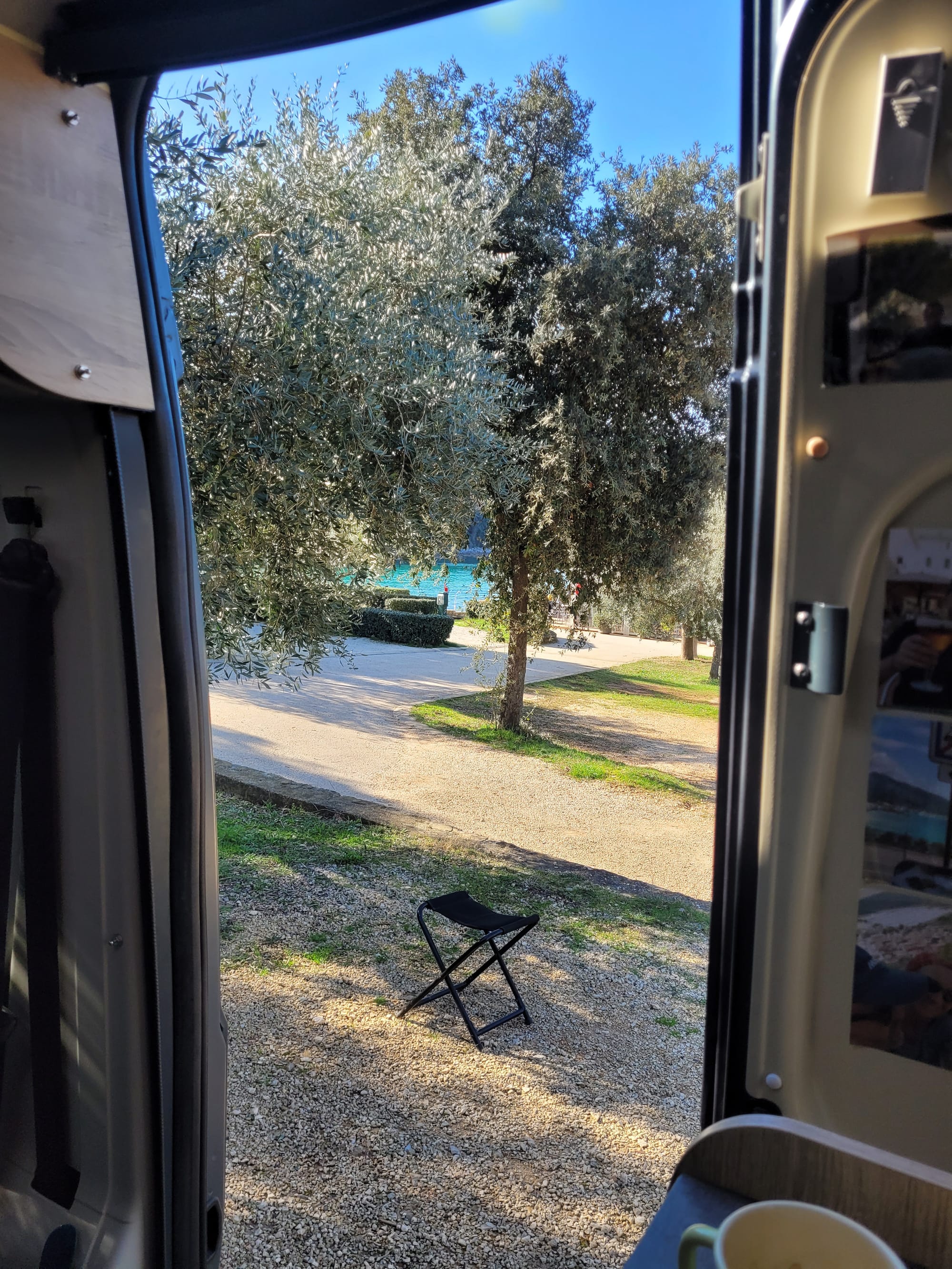 Vor Luigi ist durch die Olivenbäume auf unserem Stellplatz immer noch Schatten, deshalb verlegen wir unsere Campingmöbel zur Schnecke.
