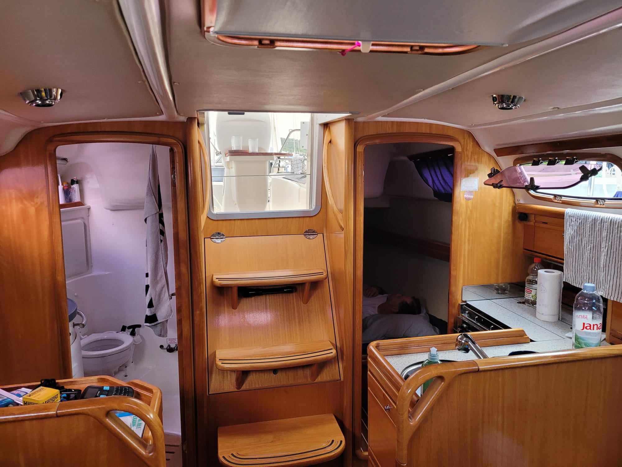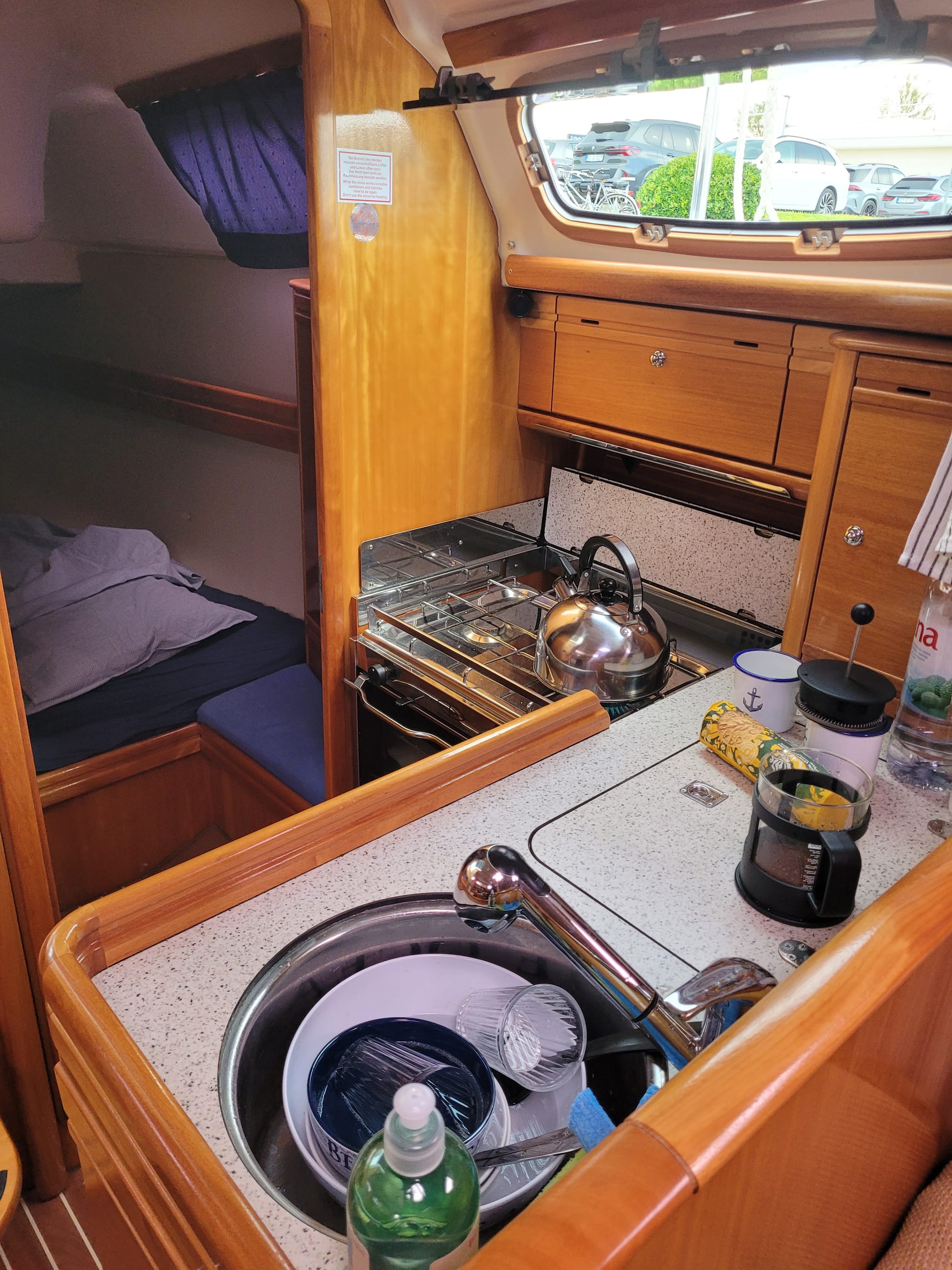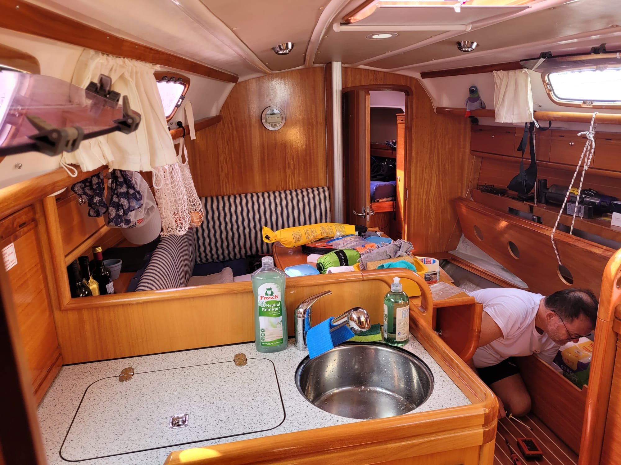 ...aber einige Bereiche sind schon fertiggestellt: Heckkoje, Küchenbereich,...