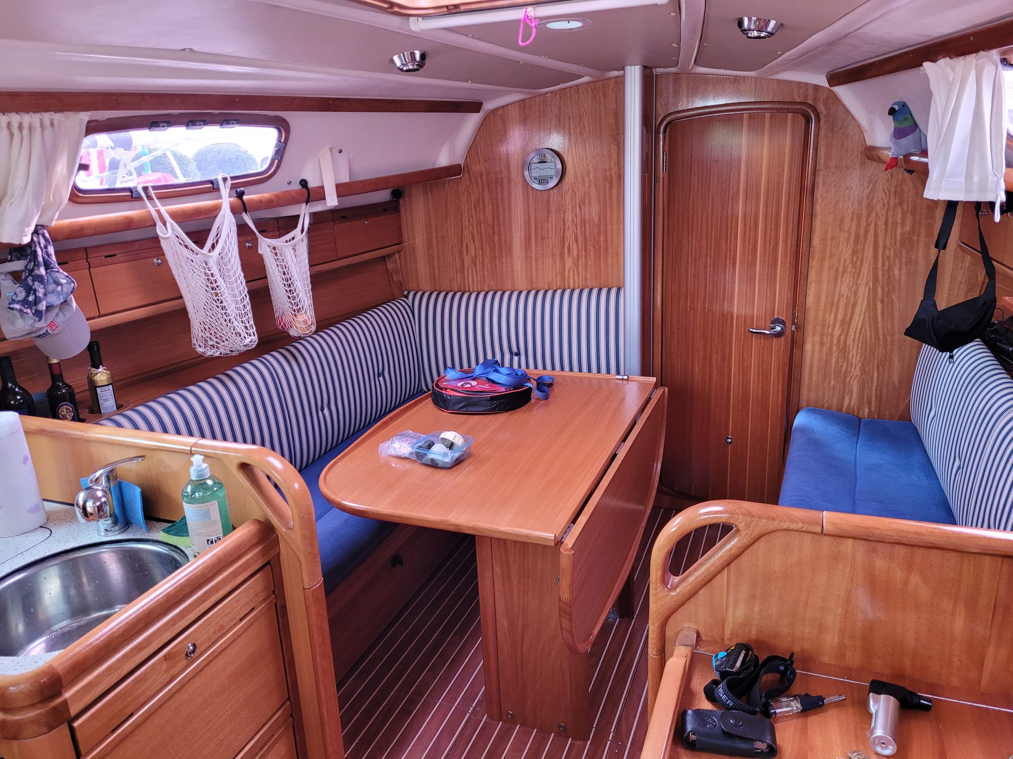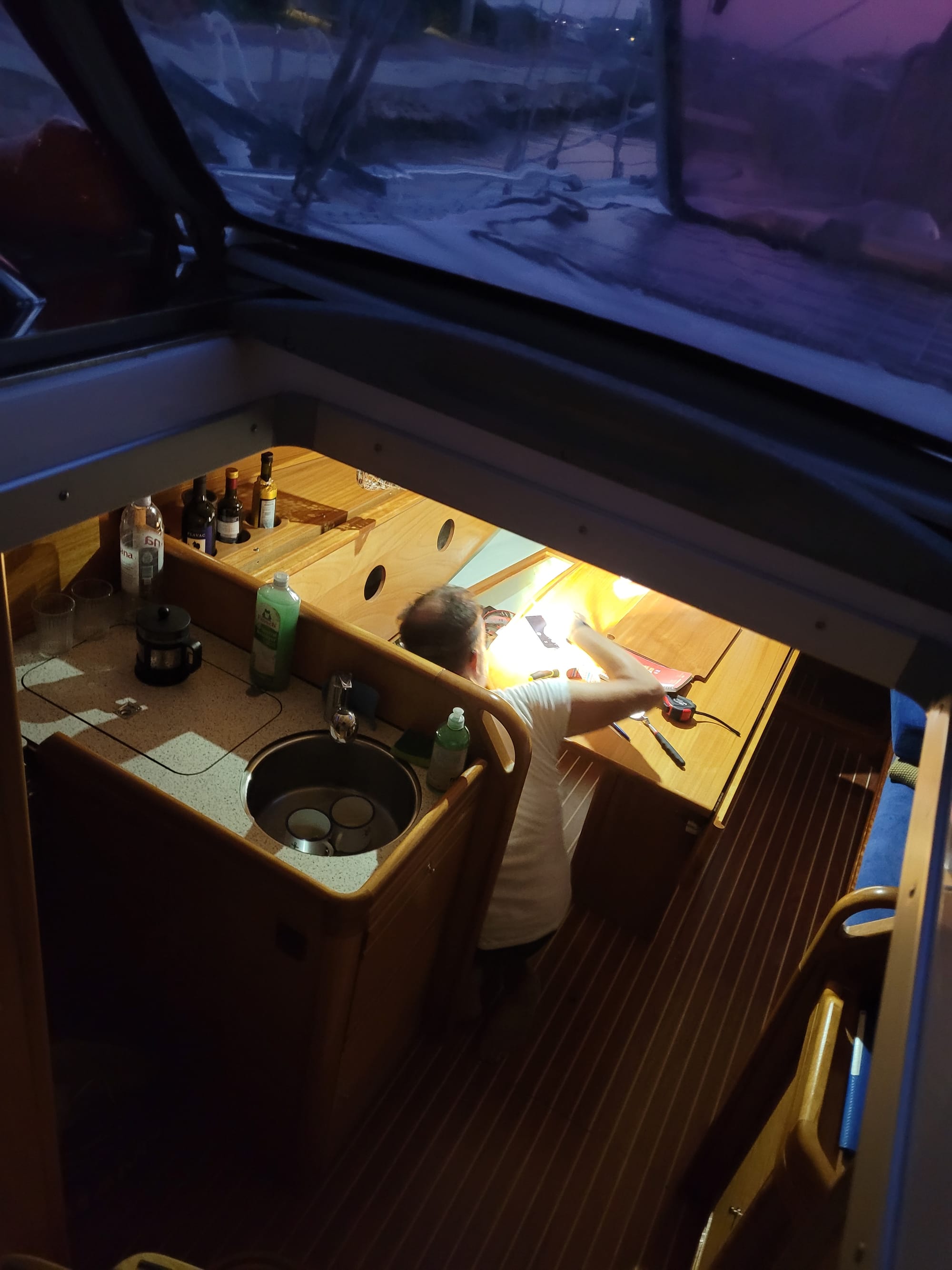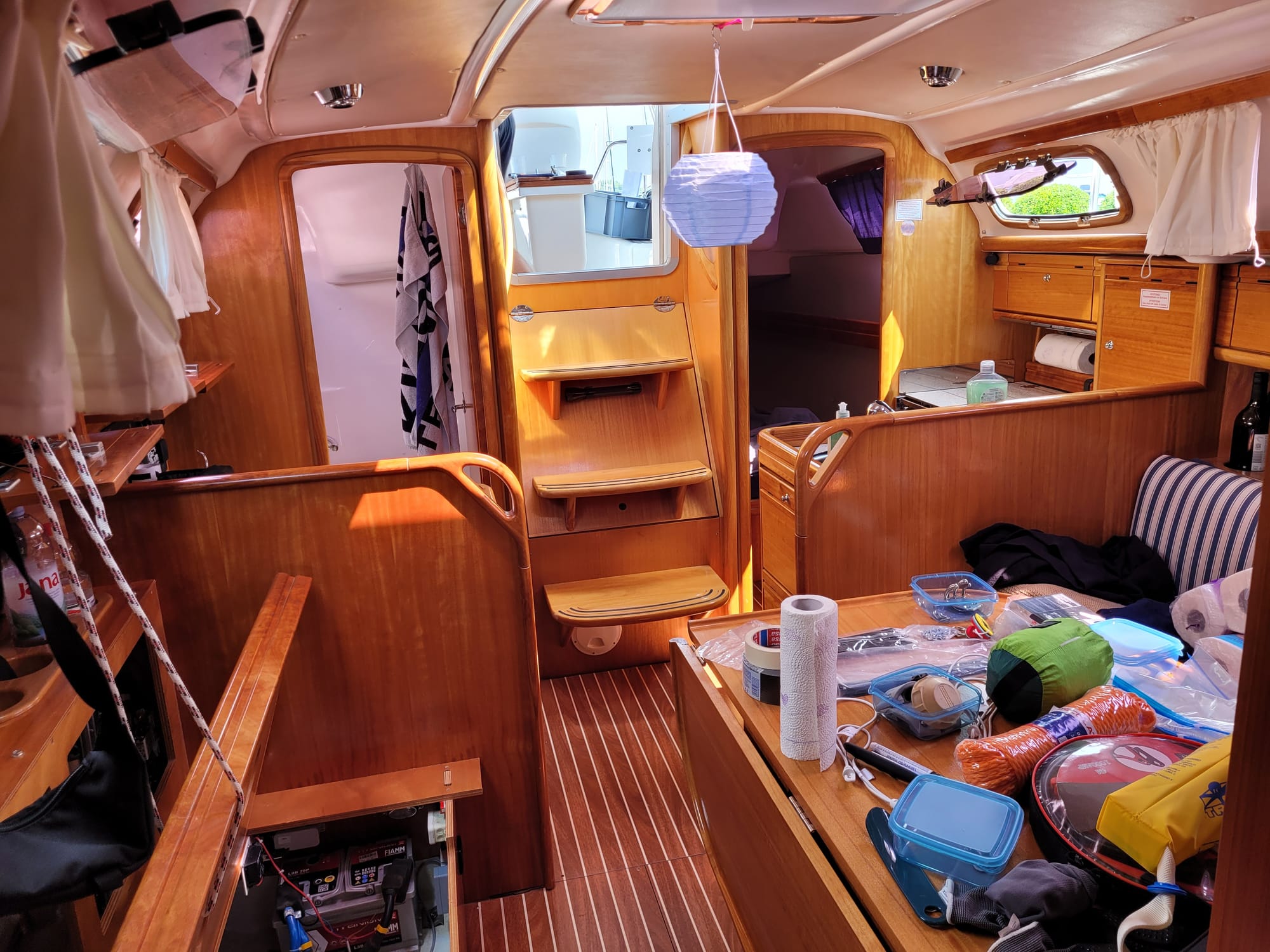 ...aber einige Bereiche sind schon fertiggestellt: Heckkoje, Küchenbereich,...