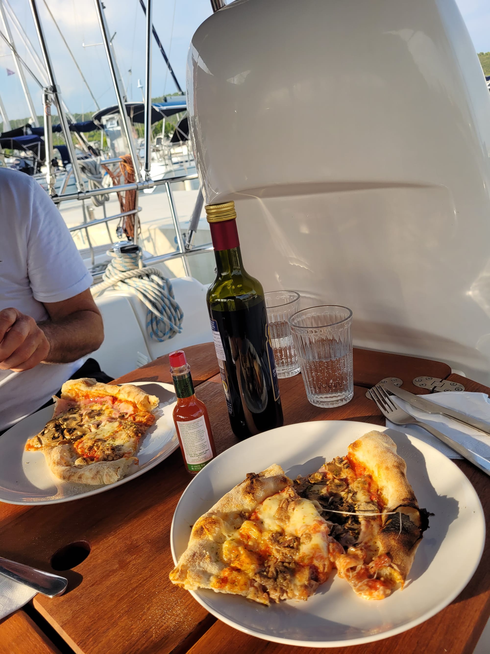 Uns interessiert es nicht, wir essen die Pizza an Board.