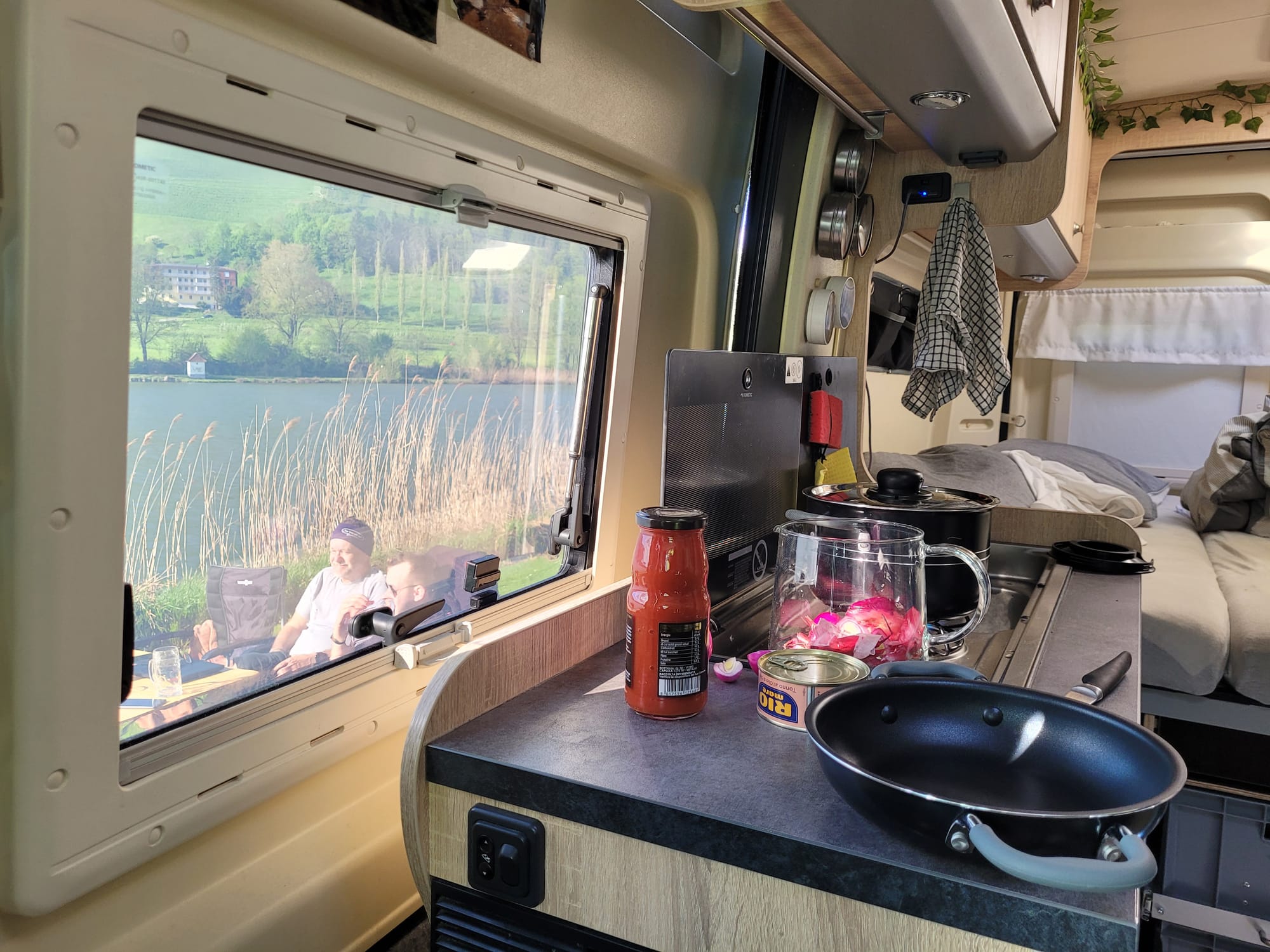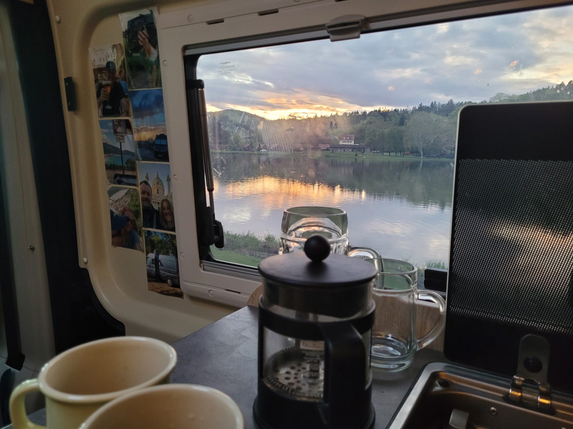 ...aber den Sonnenuntergang genießen wir trotzdem im Camper.