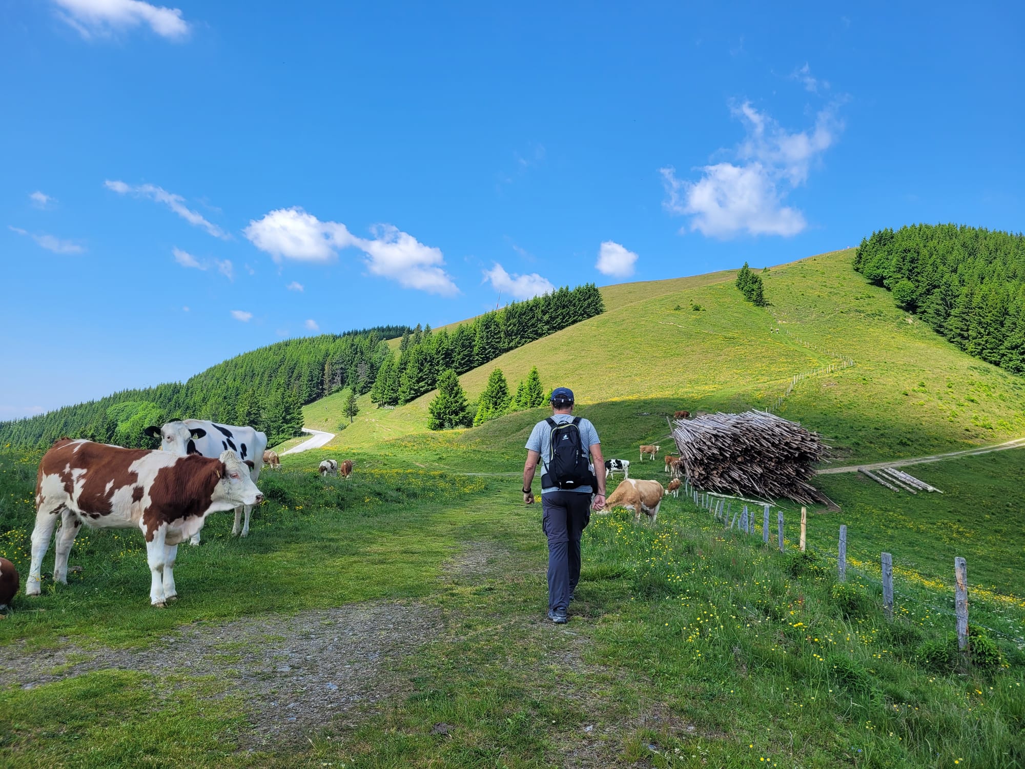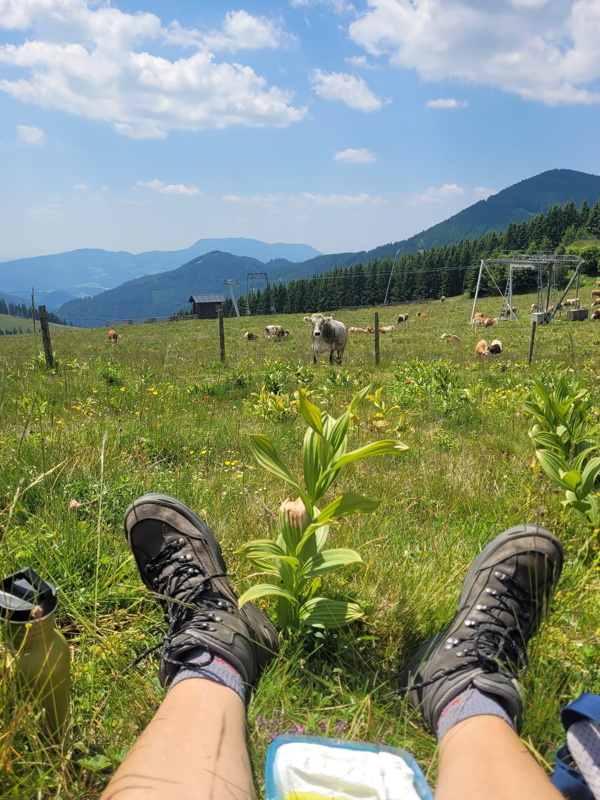 Nach einer weiteren Stunde, kurz vor der Stoahand Hütte, setzen wir uns in die Wiese um unsere Jause zu essen. Die schmeckt schon wieder köstlich nach der Wanderung. Auch hier werden wir von den Kühen beobachtet.