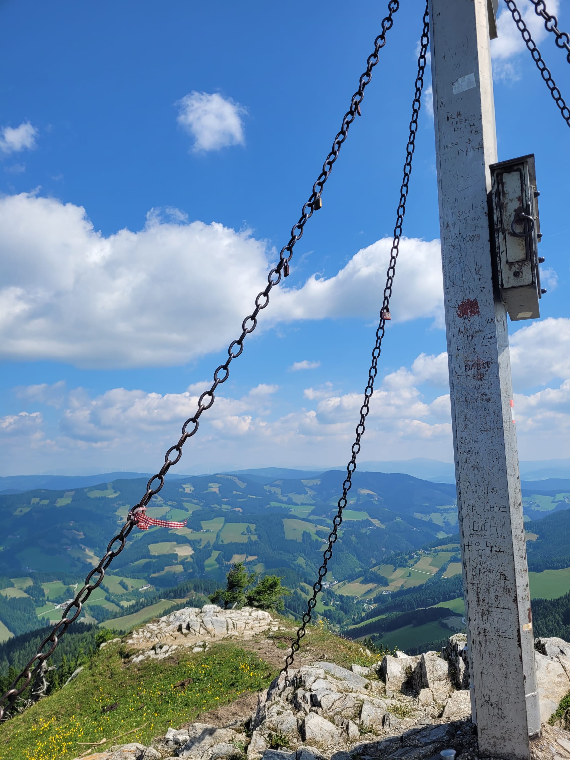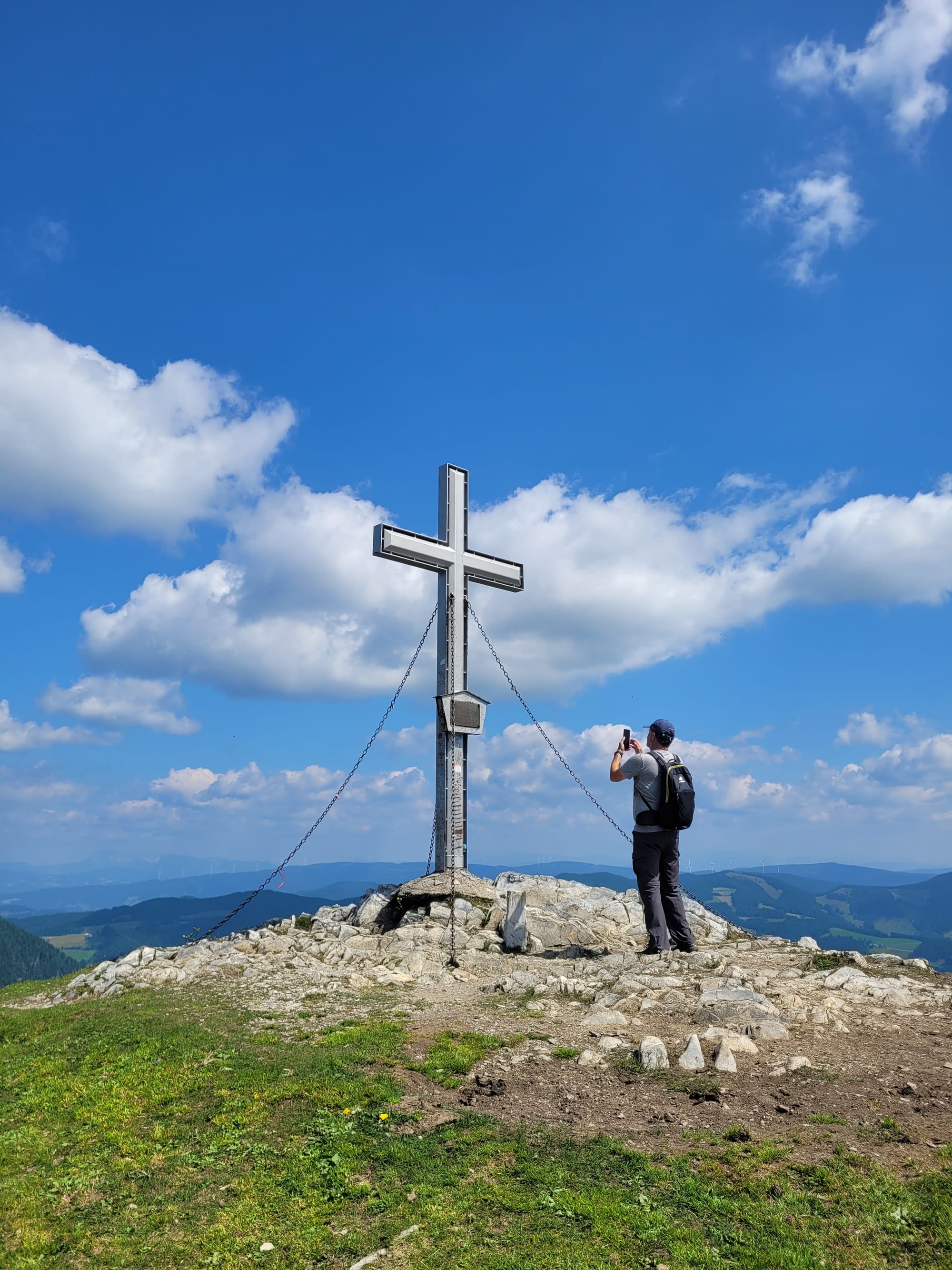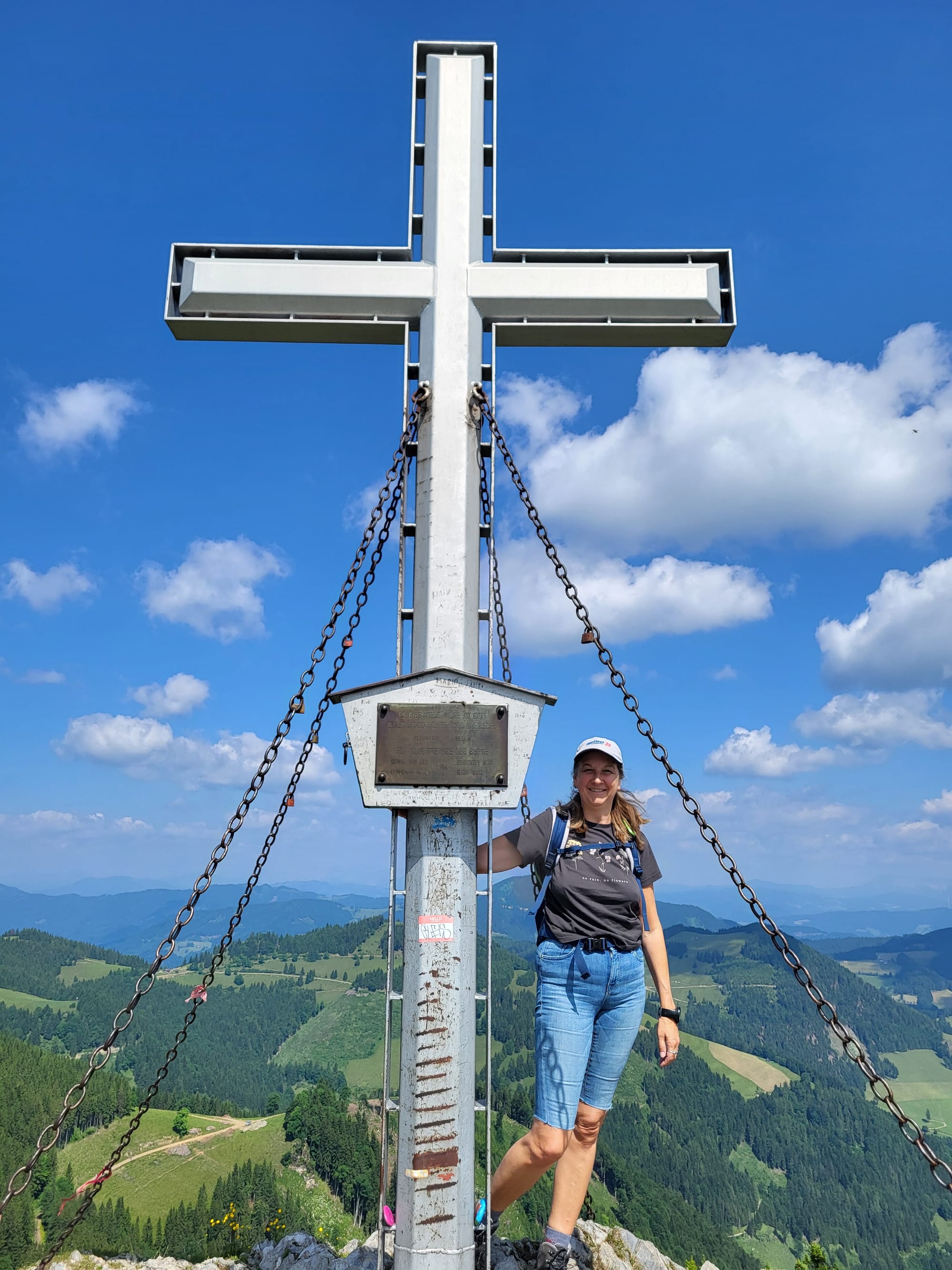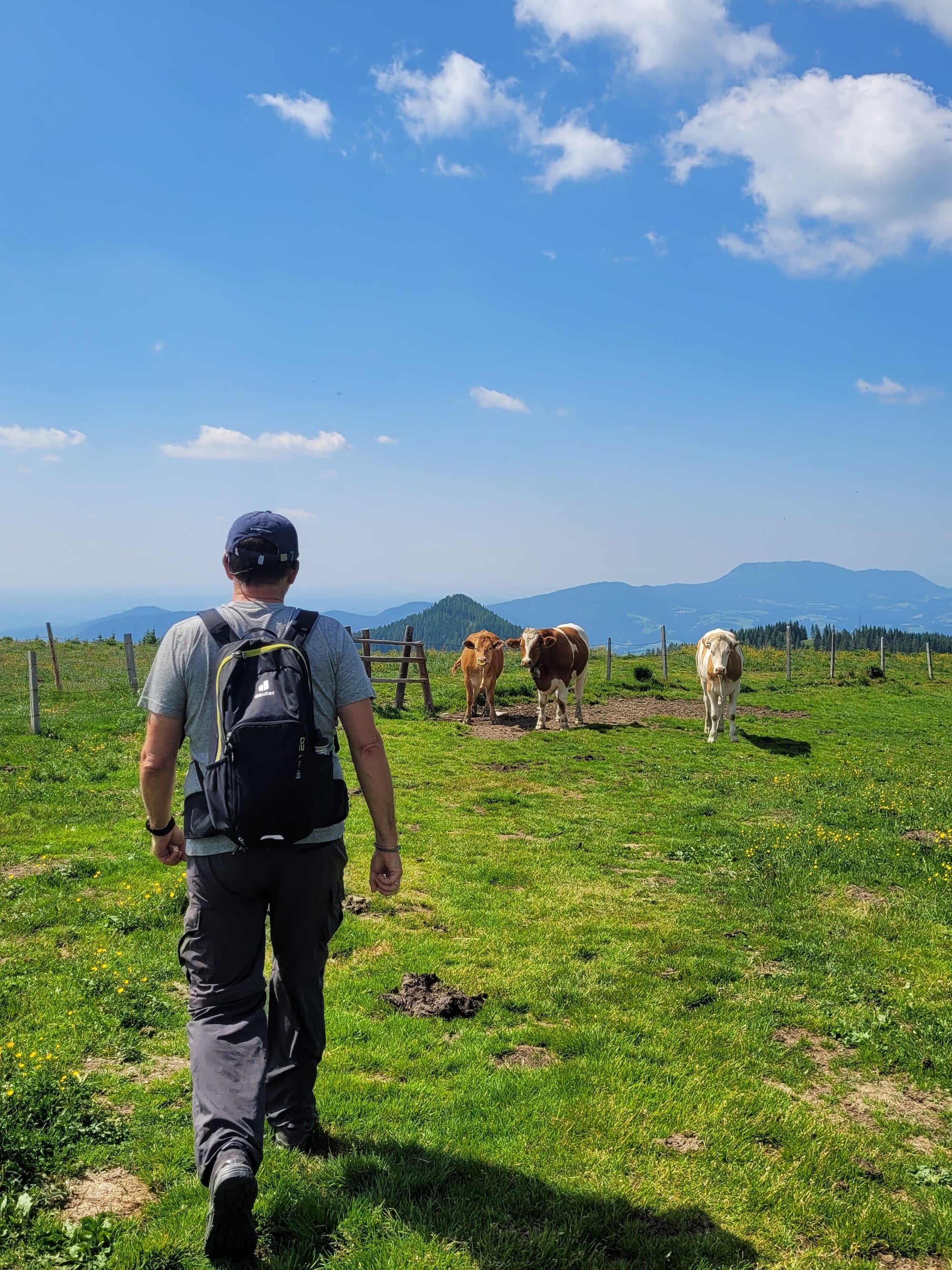 Kühe stehen auf unserer Route herum. Ich habe vergessen, wie steil und wie lang der Weg ist. Nach der ersten Kuppe geht's nämlich noch weiter. Aber nach 30 Minuten sind wir beim Gipfelkreuz angekommen und freuen uns.