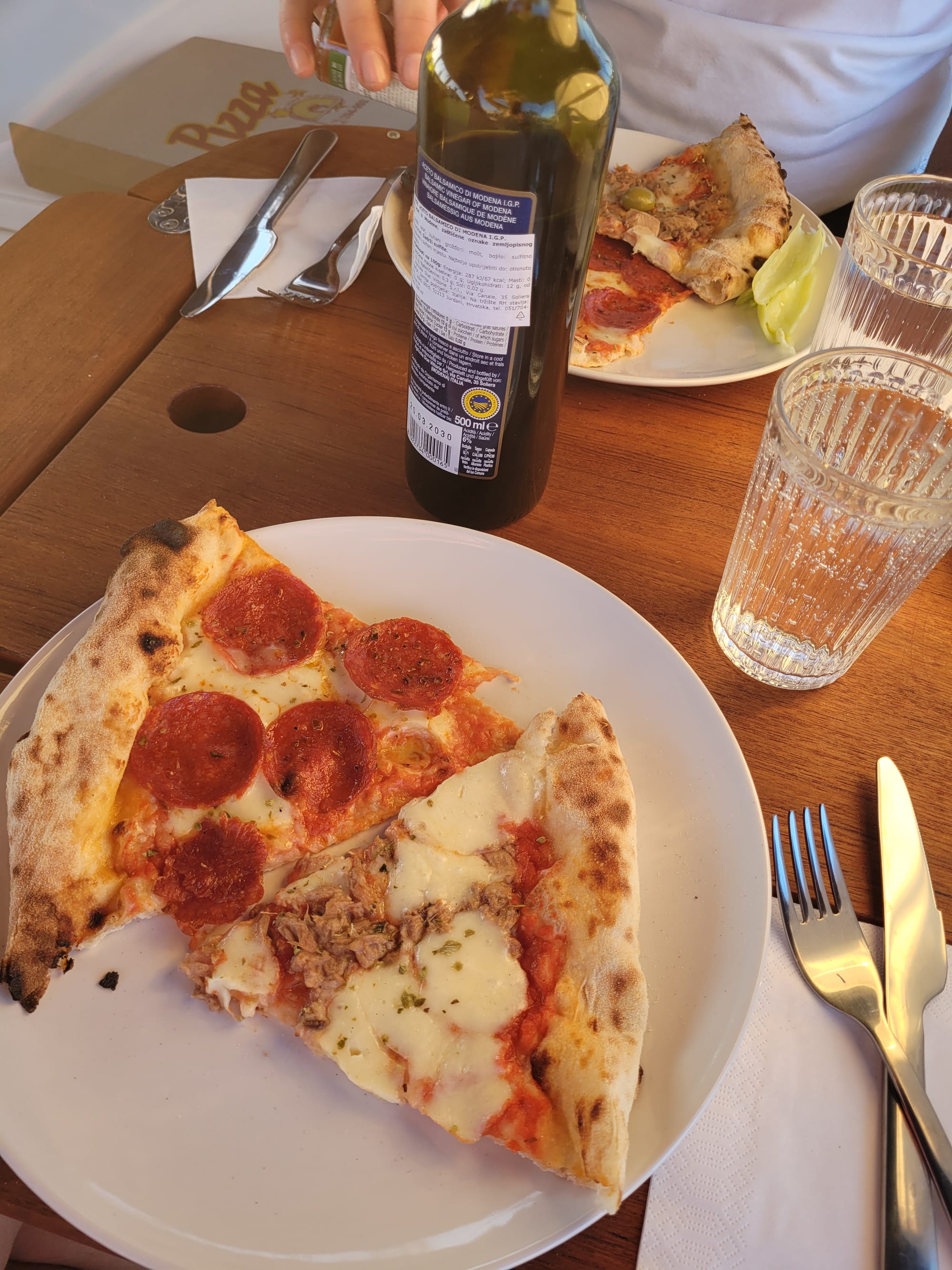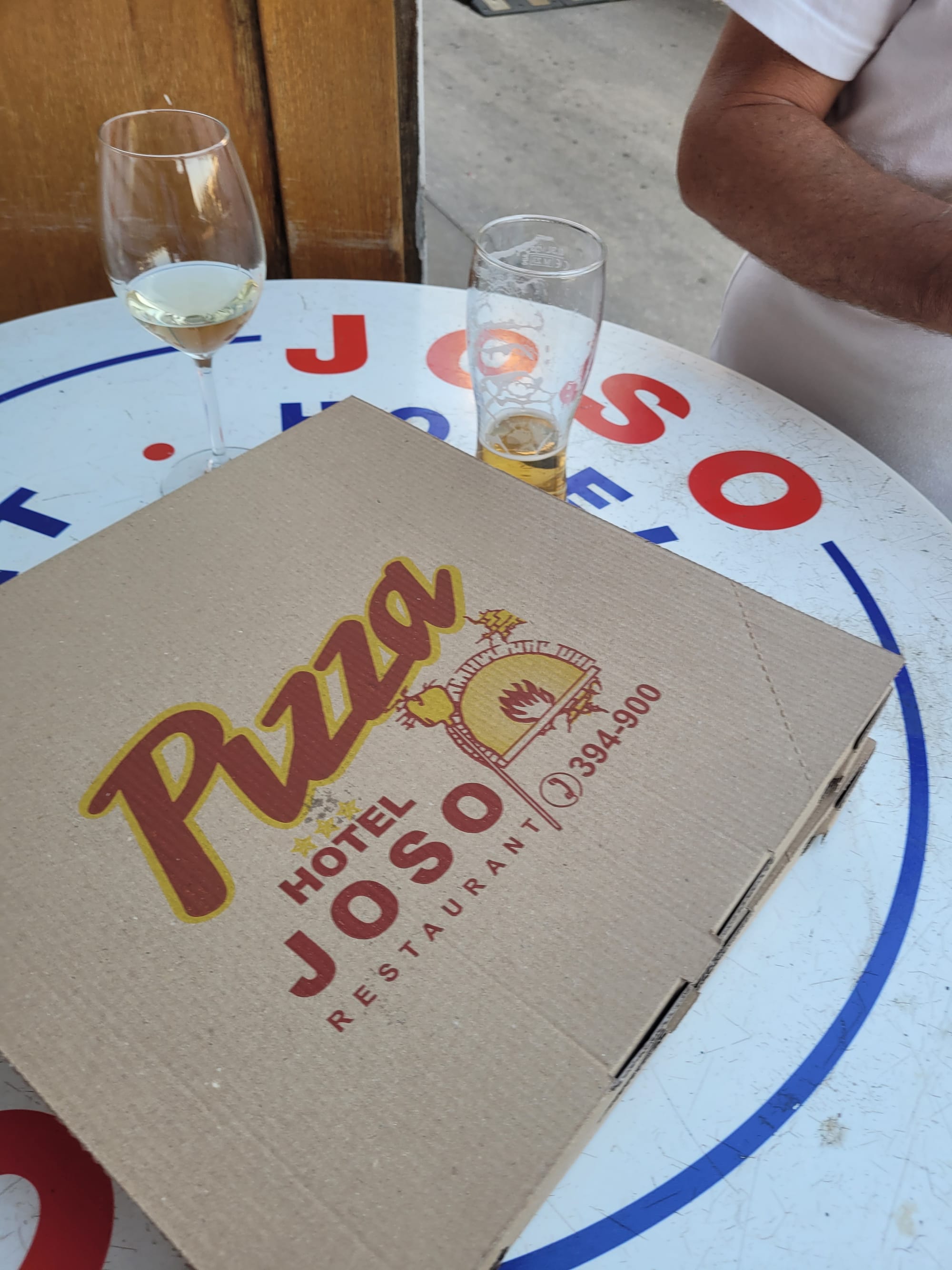 Wir haben überhaupt keine Lust auf Essen gehen und so wird es heute zum dritten Mal die Takeaway Pizza vom Joso. Diesmal warten wir am Stehtisch im Freien, inzwischen kennt man uns schon.